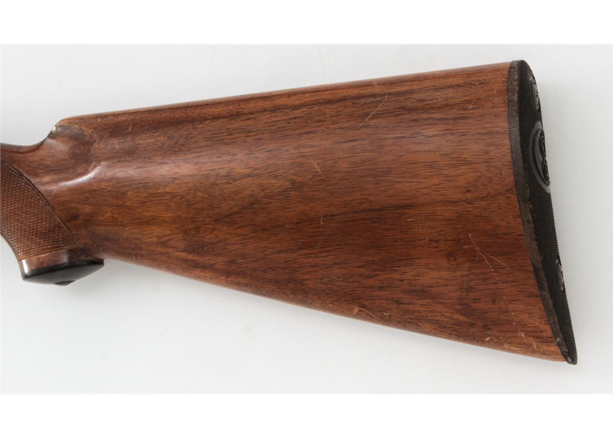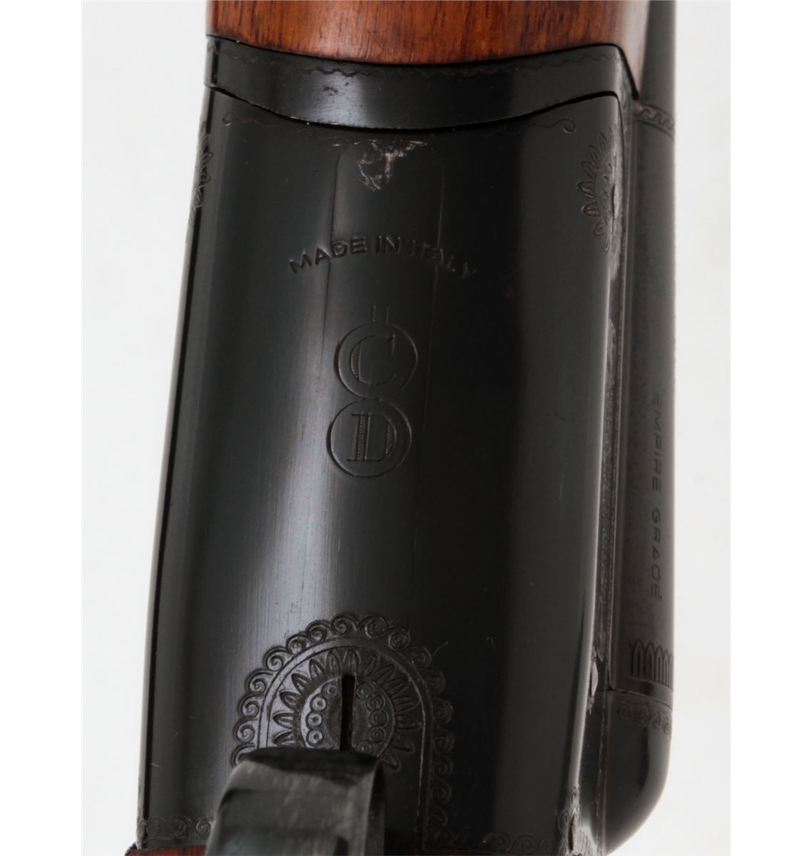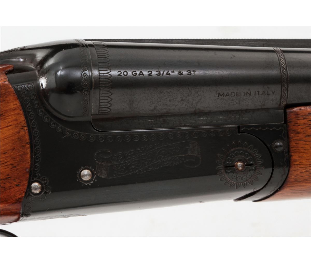 Charles Daly Empire Grade Side-by-Side Shotgun, made in Italy, #889, 20 ga., 28'' vent rib blue barrels choked Imp./Mod., rolled engraved receiver, checkered walnut stock and beavertail forend. Single trigger, extractors, auto safety, black checkered Charles Daly plastic buttplate. Condition is about fine showing moderate field use, with micro-scratching to blue surfaces and light thinning to finish at high edges. Stock with scuffs, scratches and light impressions. Est.: $350-$500. (C&R)