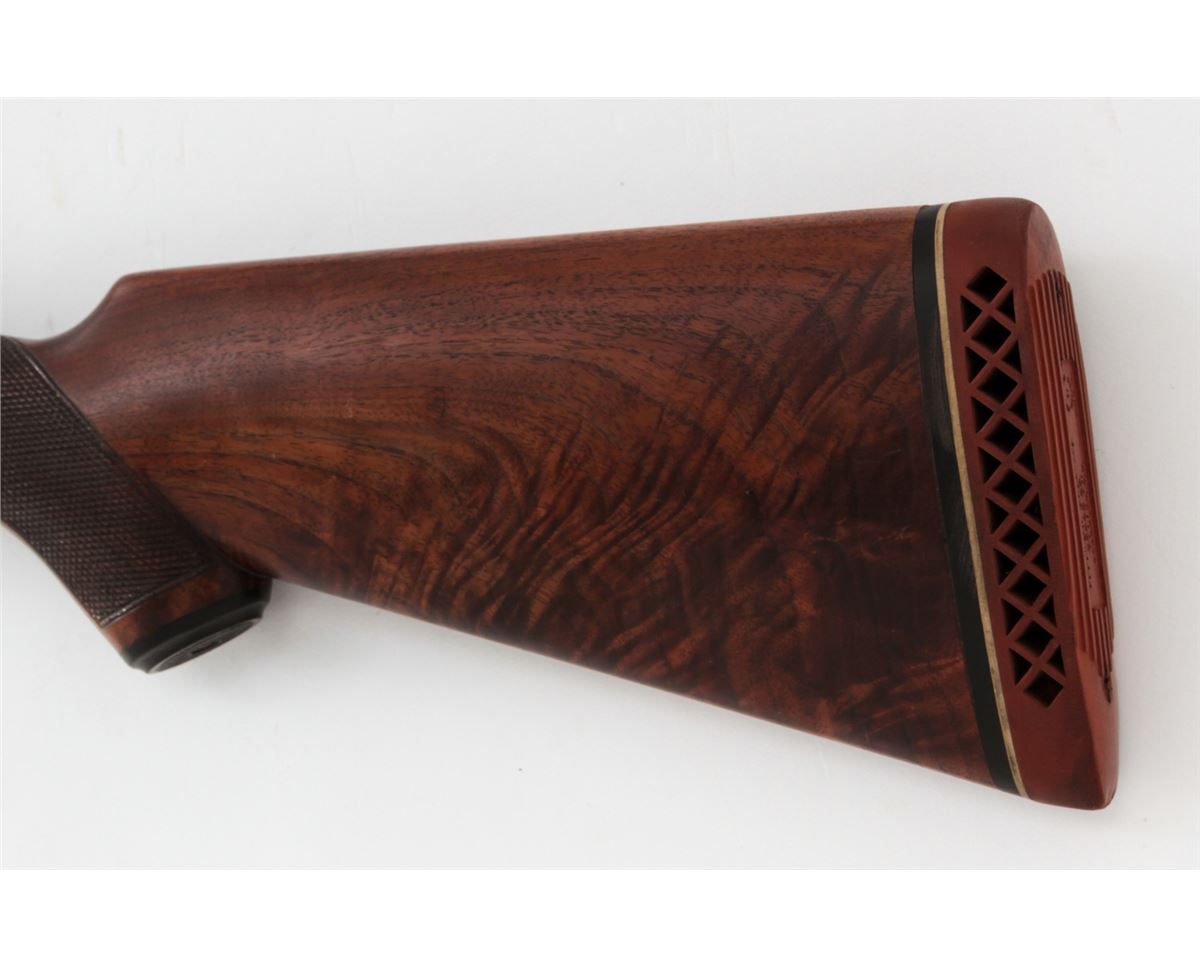L.C. Smith Ideal Grade Side-by-Side Shotgun, #FW15030, 12 ga., 2-1/2'', blue finish 30'' barrels with concave matted rib and front brass bead, IM./Mod. Chokes, extractor, double triggers with manual sliding top tang safety (not working), lacquered case colored frame with standard Ideal Grade oak leaf engraving pattern. Pistol-grip stock and splinter forend are flame-figured American walnut with a length of pull of 13-3/4'' over a 7/8'' Goodwear red ventilated recoil pad. Mfg'd ca. 1919. Overall condition remains fair with 90% barrel blue and 75% case colors, bores are bright, left barrel has a scratch and dent 9'' from the muzzle and scratches in front of forend release, screw heads are marred, frame and sideplates have small contact indentations with right sideplate peeled around the retaining screw, triggers have moisture pitting. Wood has a blended split repair along the right side of the upper tang, forend edges have splits and pry marks at the release, buttstock revarnish is worn; safety mechanism requires repair. Est.: $500-$800. (C&R)