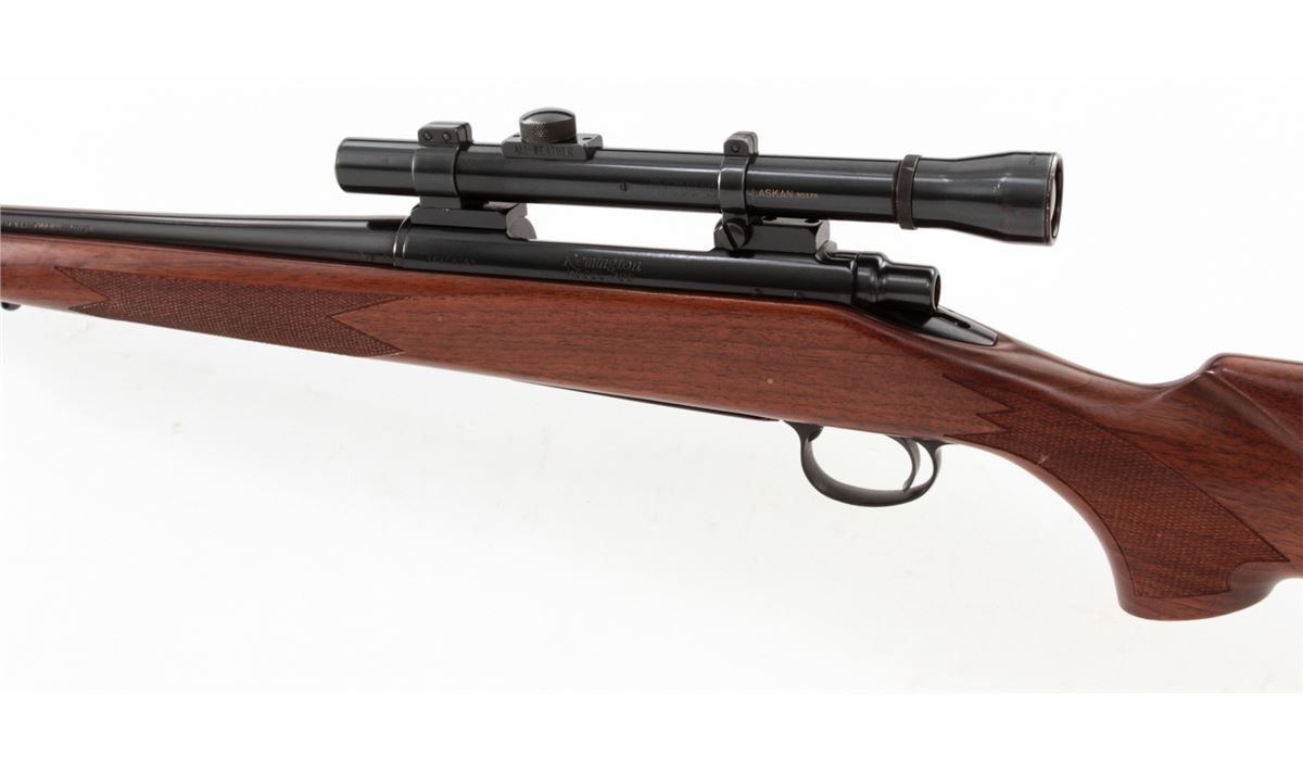 Remington Model 700 BDL Bolt Action Rifle, #B6308148, 7x57 cal., 22'' barrel, blue finish, factory checkered walnut stock. Topped with Lyman Alaskan All-Weather 2.5-power scope on Redfield rings and mounts. Condition is excellent retaining approx. 98% blue. Stock with light marks from handling. Crisp action, bright bore, scope optics are fine. Est.: $500-$750. (Modern)