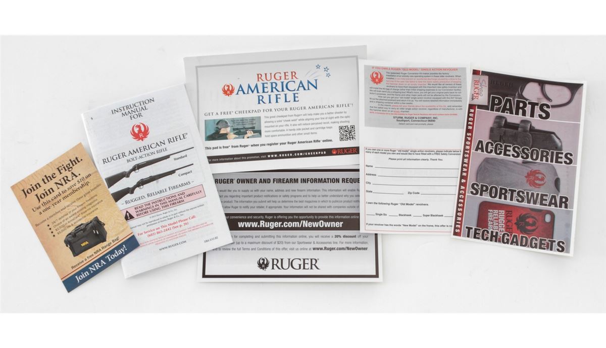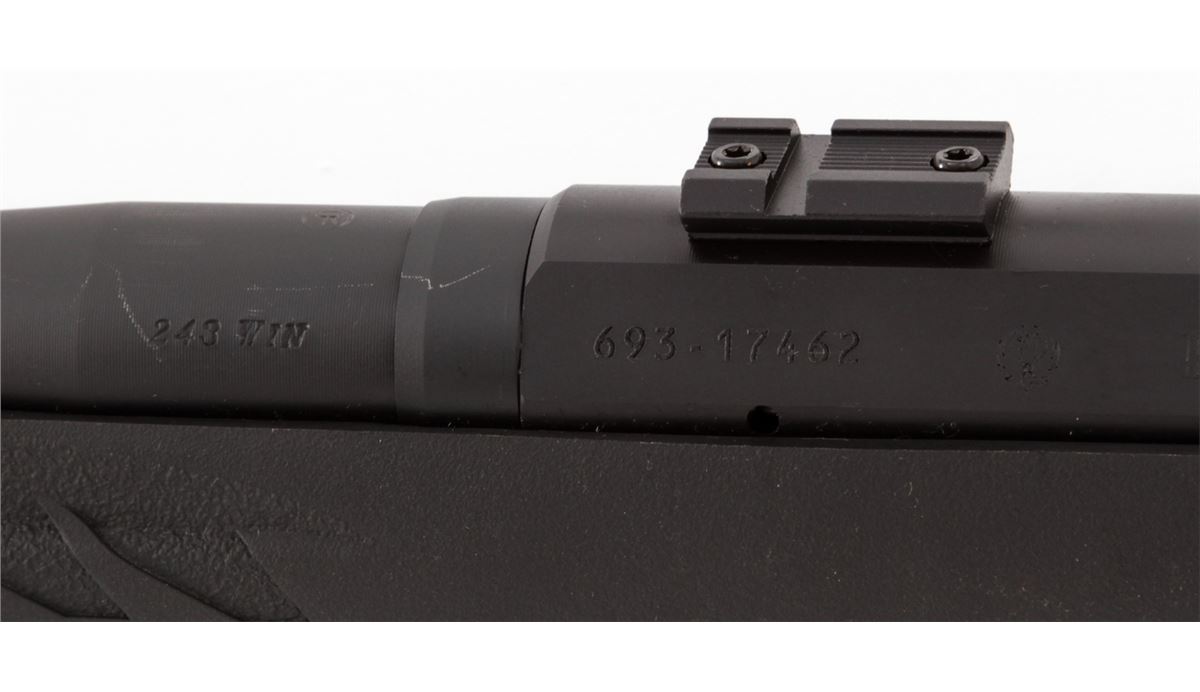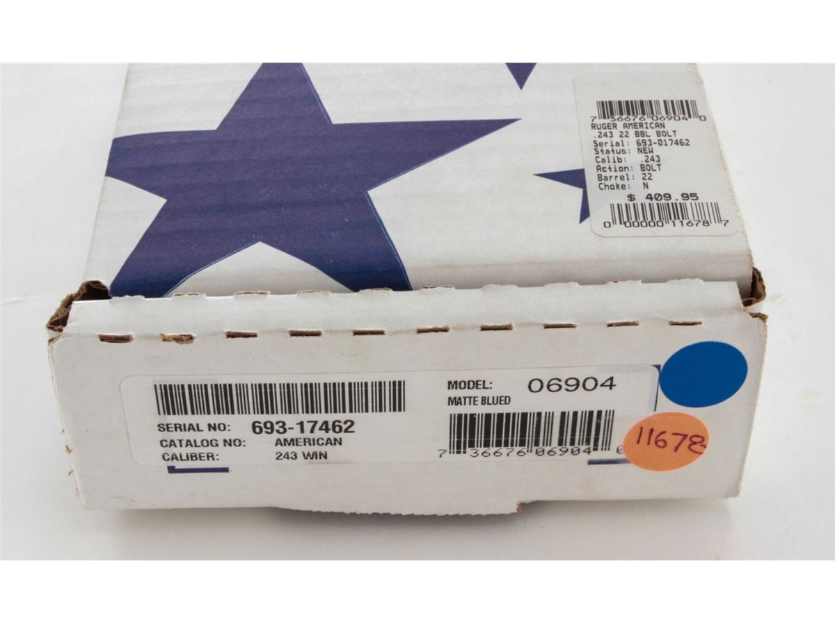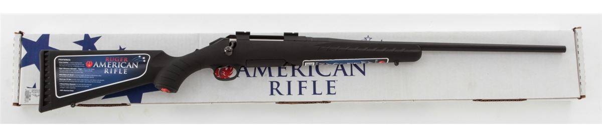 Ruger American Bolt Action Rifle, #693-17462, .243 Win. cal., 22'' barrel, matte black finish, black pistol-grip composite stock, with one (1) magazine, in original box with matching end label and owner's manual. Condition is excellent remaining new and unfired. Stock and barrel with light overall marks from handling, and original Ruger stickers remain intact. Retails @ $409.95. Est.: $250-$350. (Modern) (Field Time)