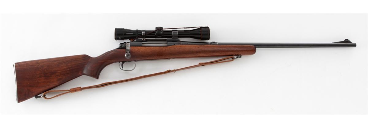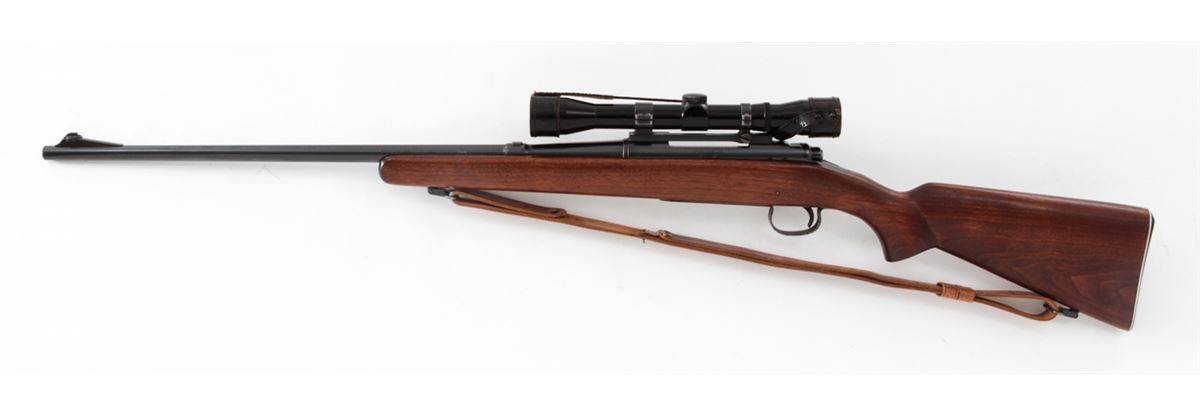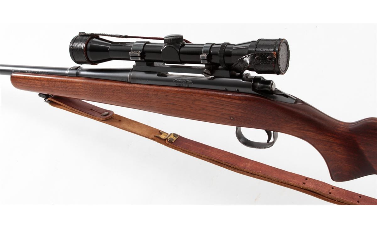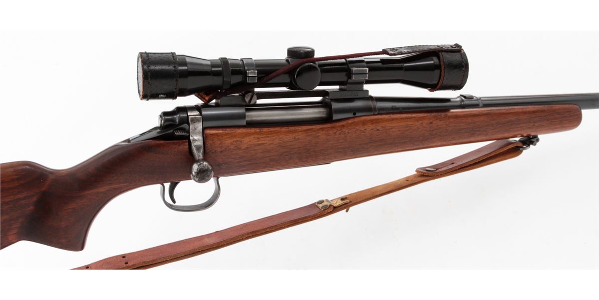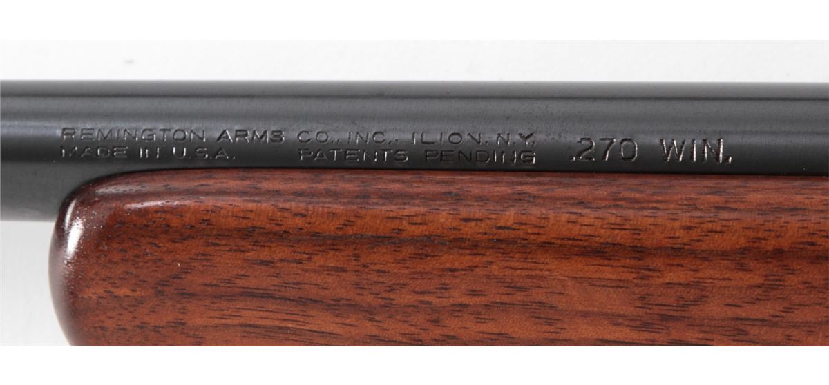 Remington Model 721 Bolt Action Rifle, #251142, .270 cal., 24'' barrel, blue finish, pistol-grip walnut stock with factory aluminum buttplate and commercial leather sling. Topped with a Hunter 4x32 scope on Redfield rings and mounts. Condition is fine retaining approx. 95% original thinning blue. Stock with light scuffs. Japanese scope with crosshair reticle shows crisp optics. Action is good, bore is fine. Est.: $350-$500. (C&R)