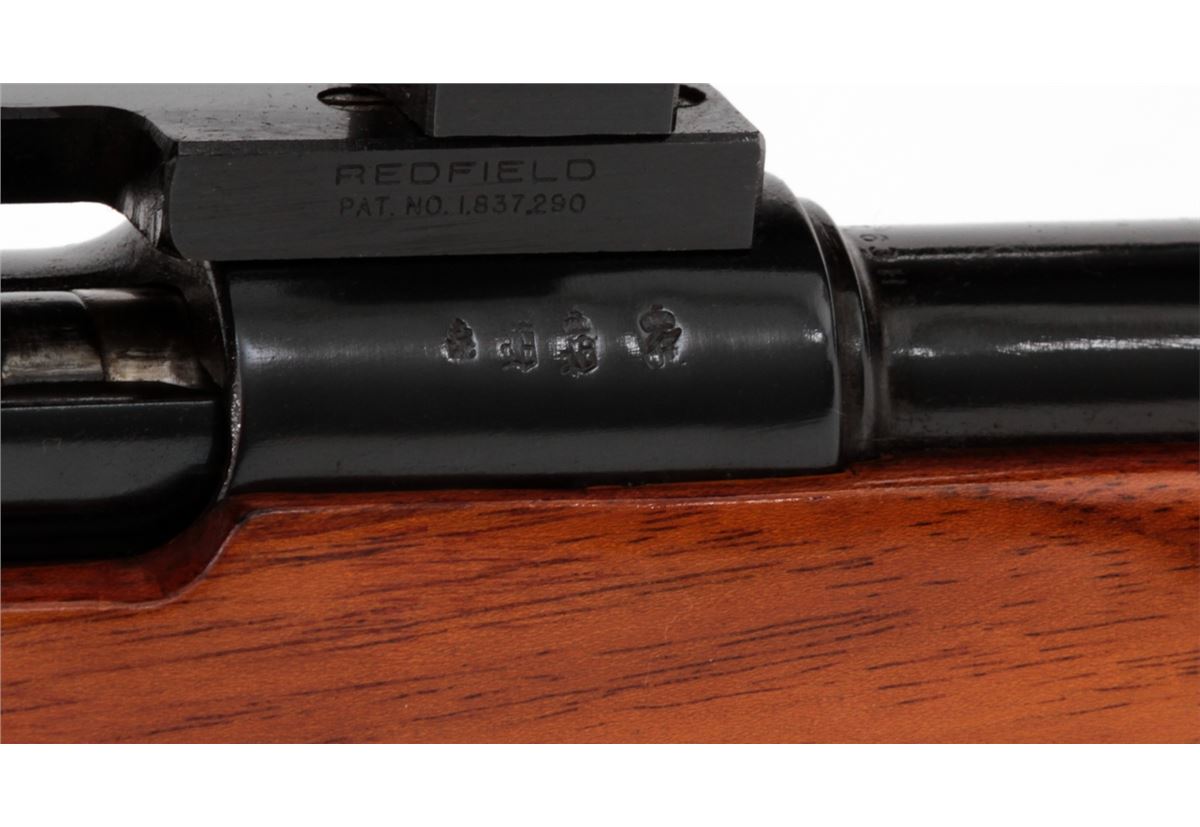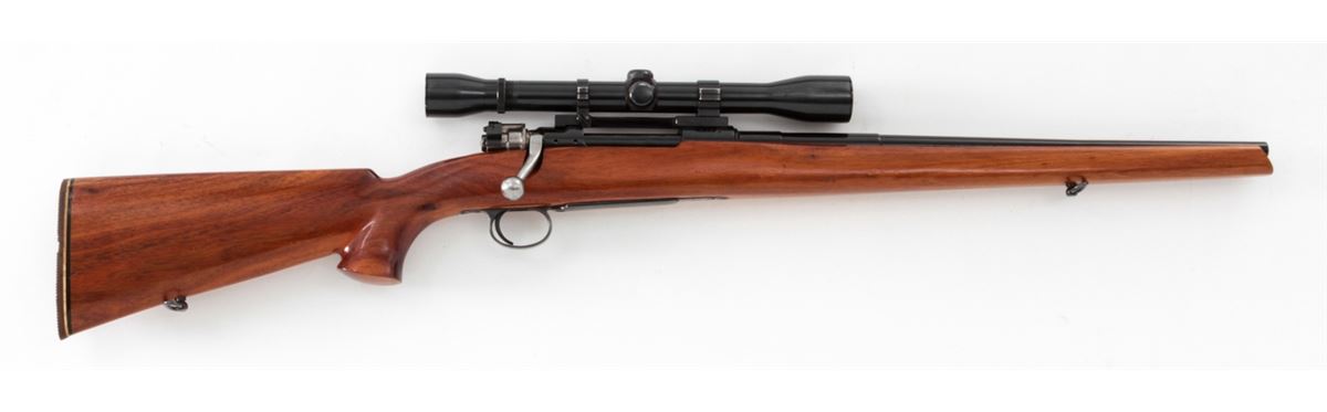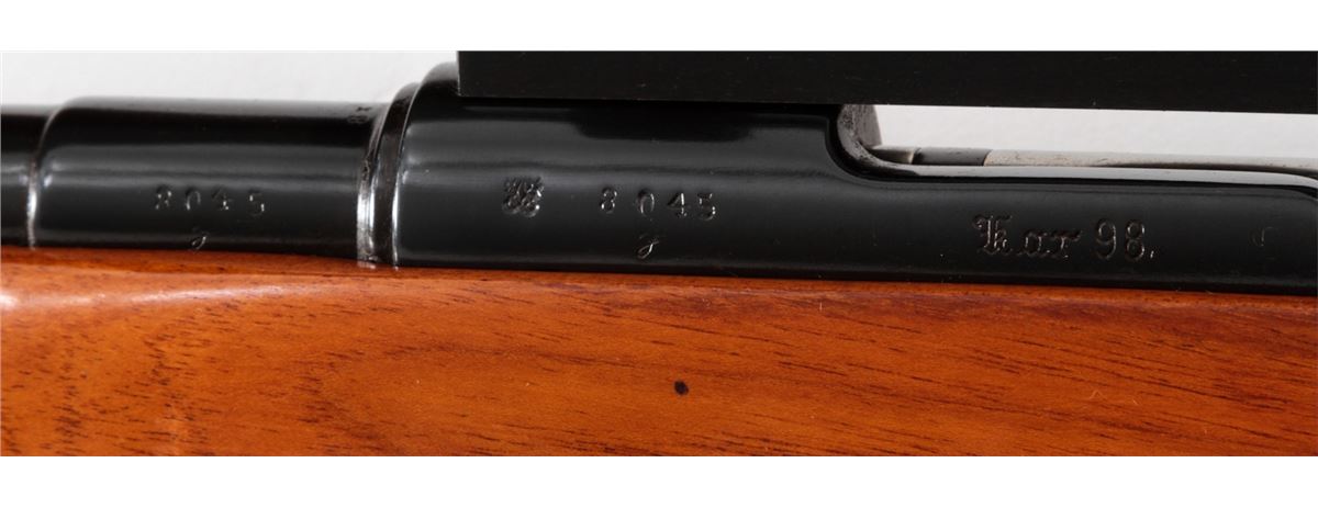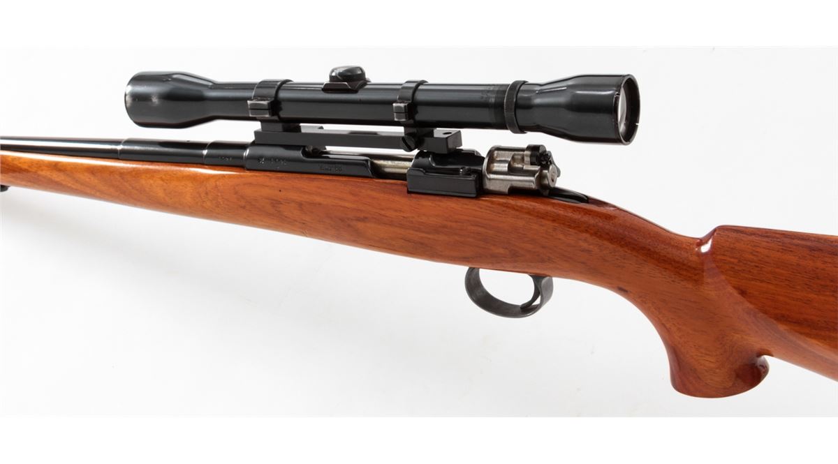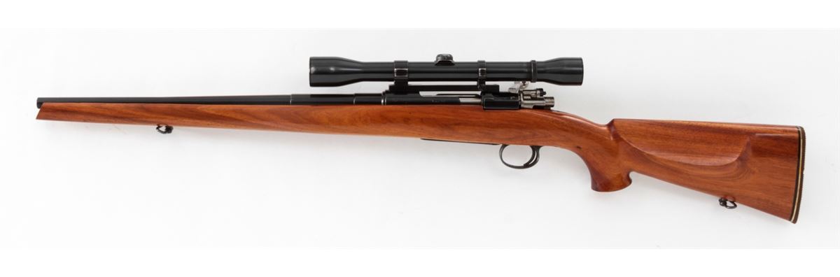 Sporterized WWI Era KAR-98 Bolt Action Rifle, #8045y, 8mm-06 IMP cal., 18-1/2'' barrel, later blue finish, custom full-length honey-colored acacia stock with pistol grip and cheekpiece. Topped with a Weaver K-6 scope on Redfield rings and mounts. Condition is fine as modified retaining approx. 96% of immersion type blue. Custom stock with small pressure dings. Right side of rear receiver ring drilled and tapped for peep sight. Action is crisp, bore is fine, scope optics are clear. Est.: $225-$425. (C&R)