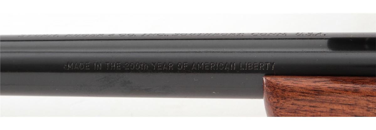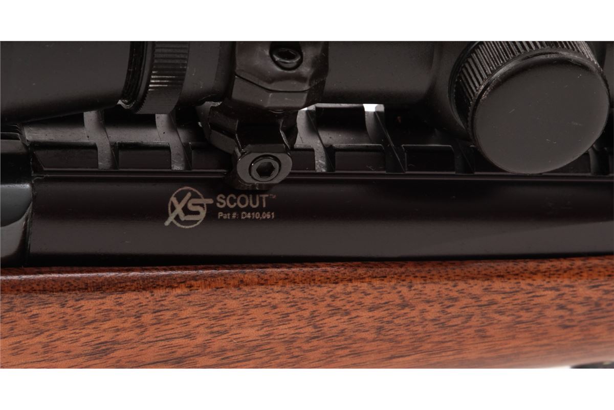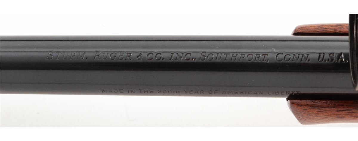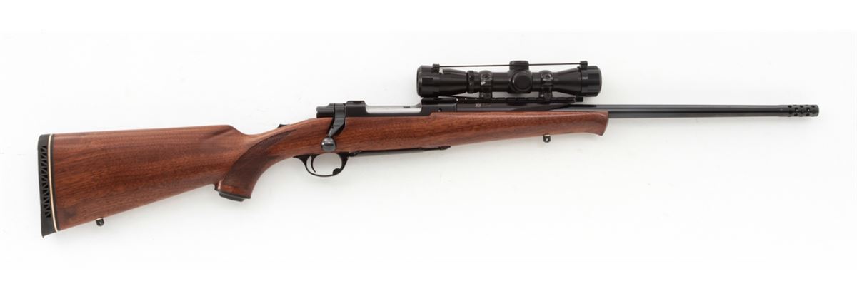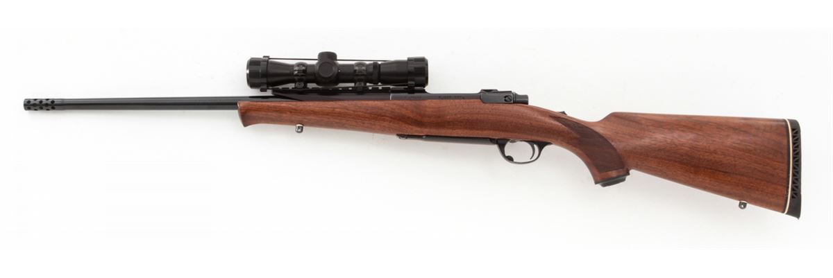 Ruger M77 Bolt Action Rifle, #71-75868, .243 cal., 19-1/2'' compensated barrel, blue finish, checkered walnut stock, with Pachmayr Whiteline rubber butt pad. Topped to a NoStar 2.5-30E extended eye relief scope. Barrel marked ''Made in the 200th Year of American Liberty''. Condition is excellent as modified showing little use to stock. Barrel appears to have been refinished at time of muzzlebrake modification. Action is crisp, bore is bright. Est.: $450-$600. (Modern)