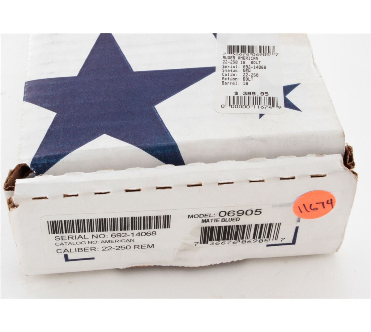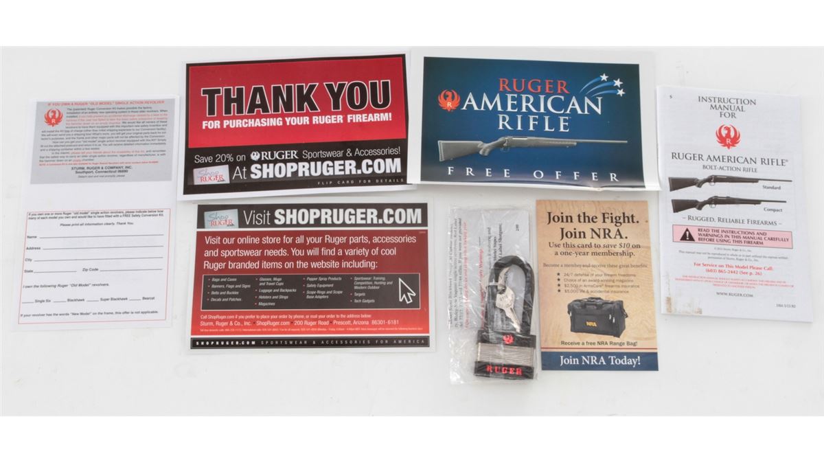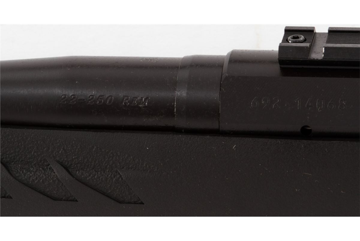 Ruger Bolt Action American Rifle, #692-14068, .22-250 Rem. cal., 22'' barrel, matte finish, black pistol-grip composite stock, scope bases, with one (1) magazine and gun lock, in original box with matching end label and owner's manual. Condition is excellent remaining new and unfired; original Ruger stickers remain intact. Box with moderate damage. Retails @ $399.95. Est.: $250-$350. (Modern) (Field Time)