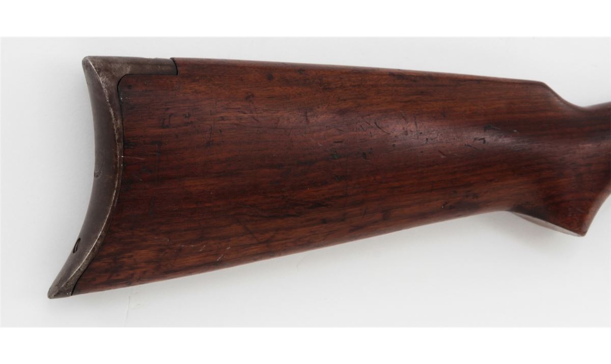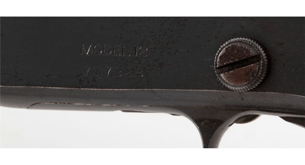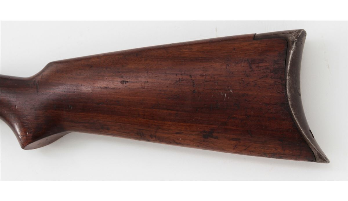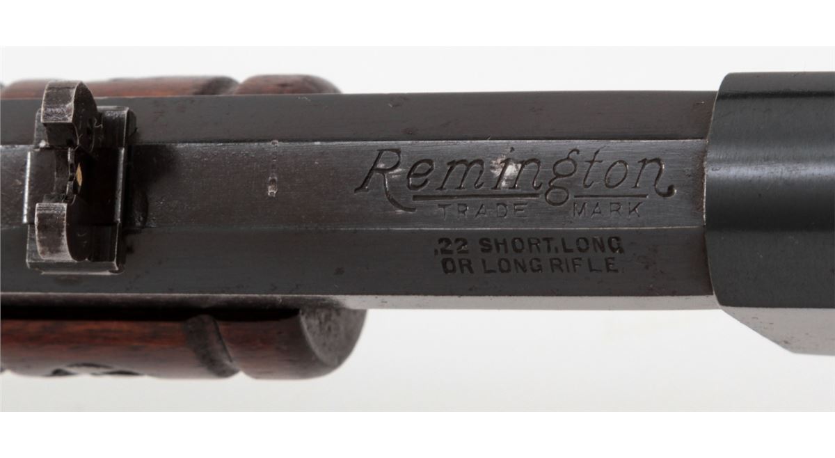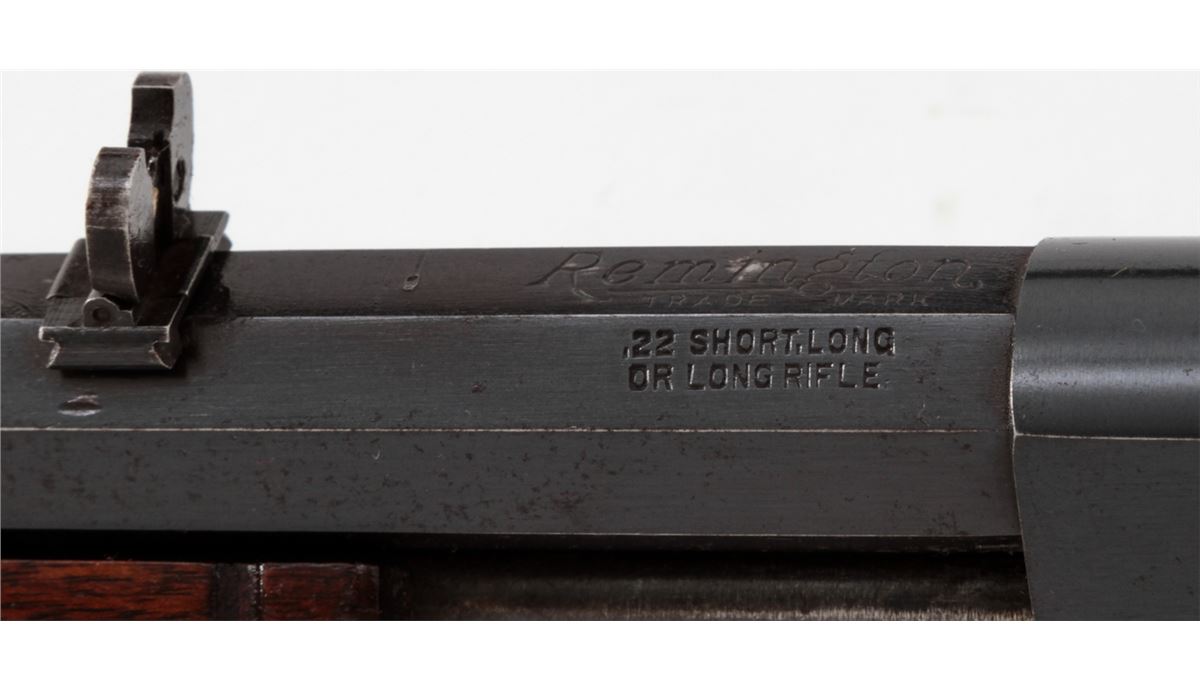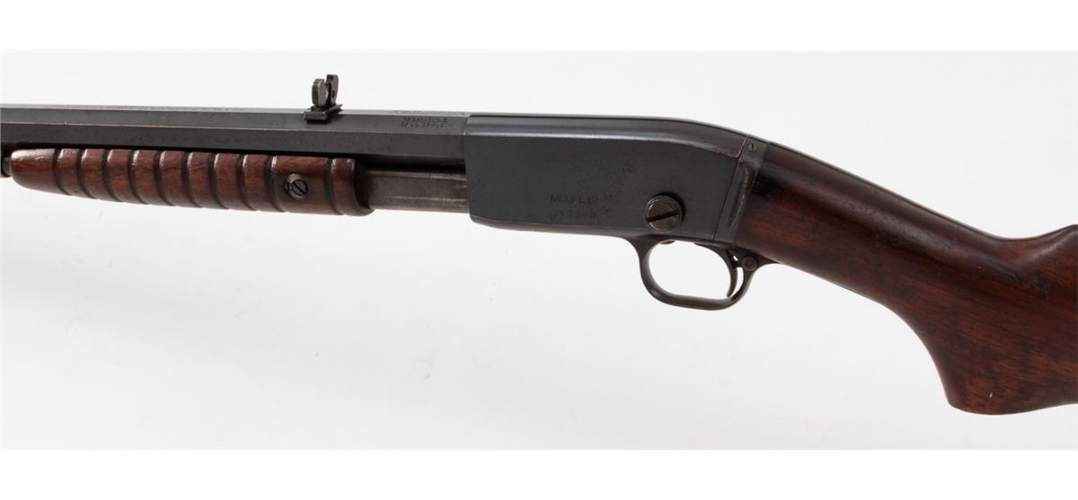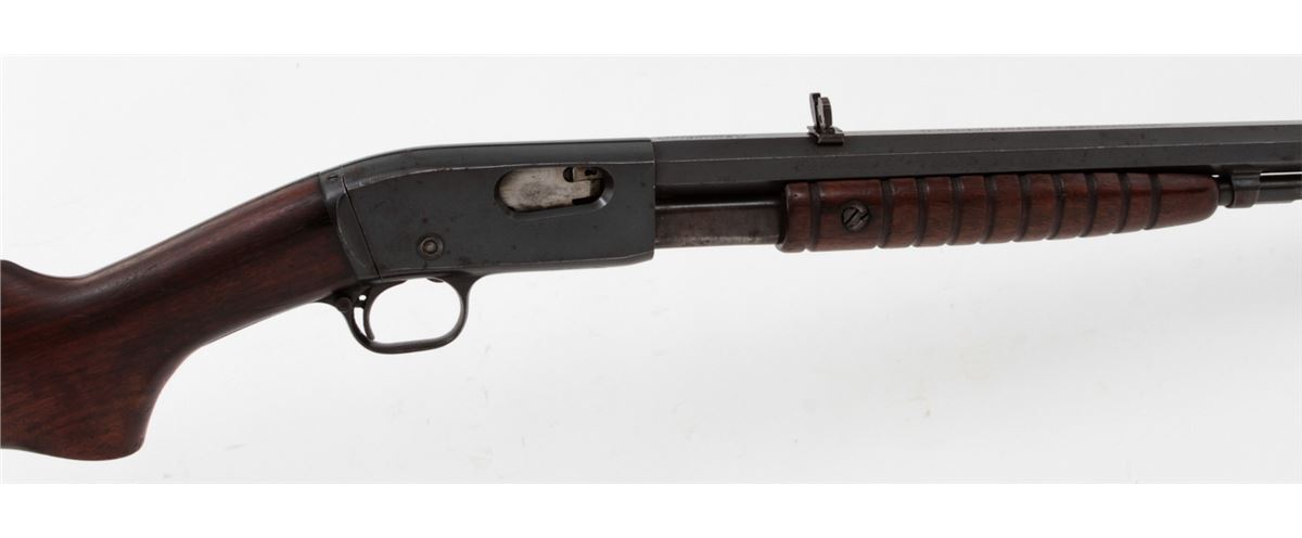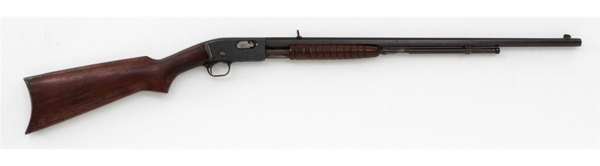 Remington Model 12 Pump Action Rifle, #717328, .22 SL/LR cal., 24'' octagonal barrel, blue finish, walnut stock and handguard. Buckhorn rear and brass bead front sight, with crescent buttplate. Condition is about fine retaining approx. 92% thinning and toning blue. Stock with light to moderate scuffs and scratches and oil darkening near metal surfaces. Crisp action, fine bore. Est.: $300-$500. (C&R)