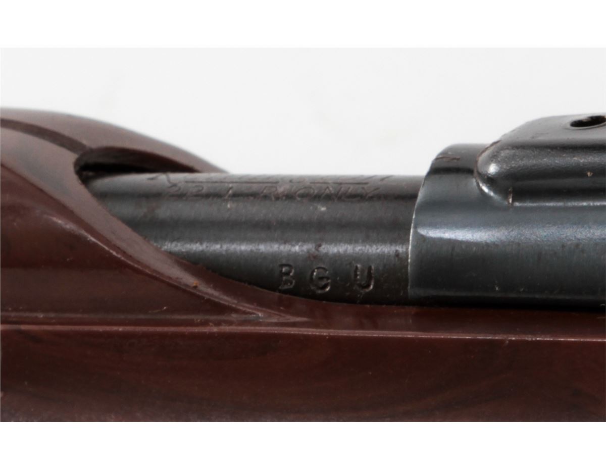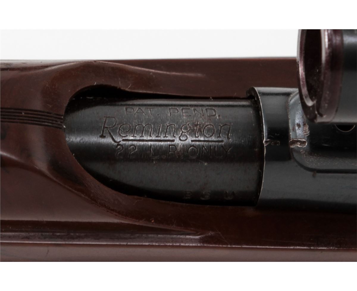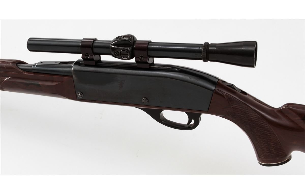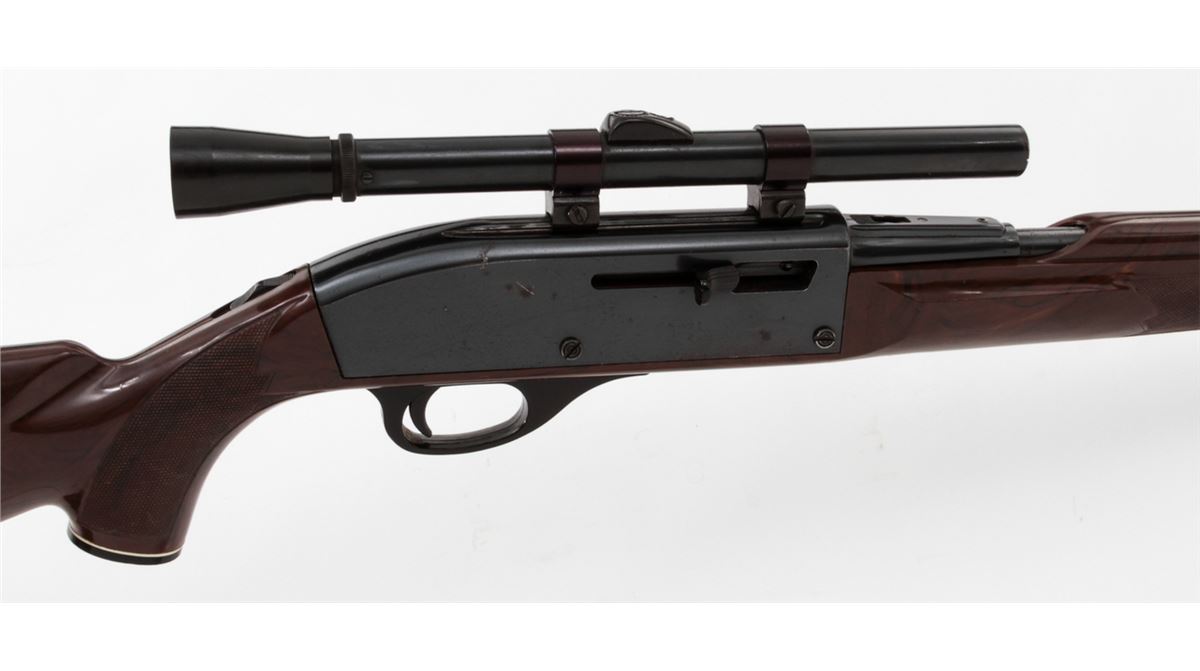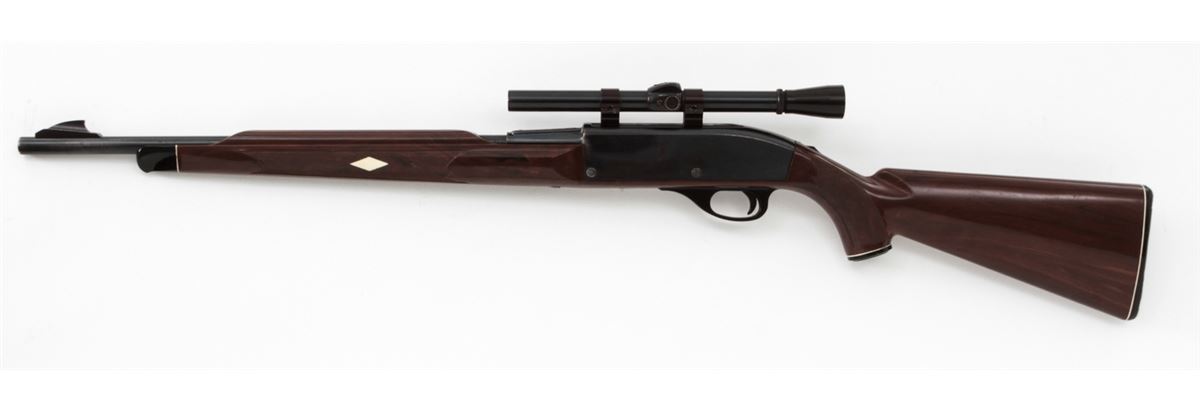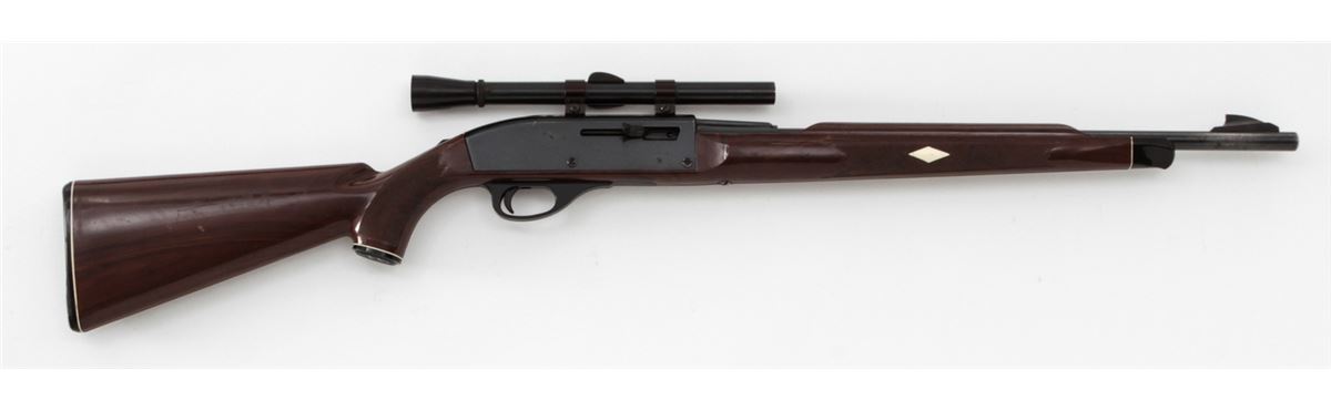 Remington Nylon 66 Semi-Automatic Rifle, NVSN, .22 LR cal., 19'' barrel, blue finish, brown plastic stock, with Sears 4x scope. Condition is very good with light corrosion and thinning to finish on metal surfaces. Rear sight has been removed to accommodate scope. Stock with light to moderate scuffs and scratches. Good action, bright bore. Est.: $250-$400. (C&R)