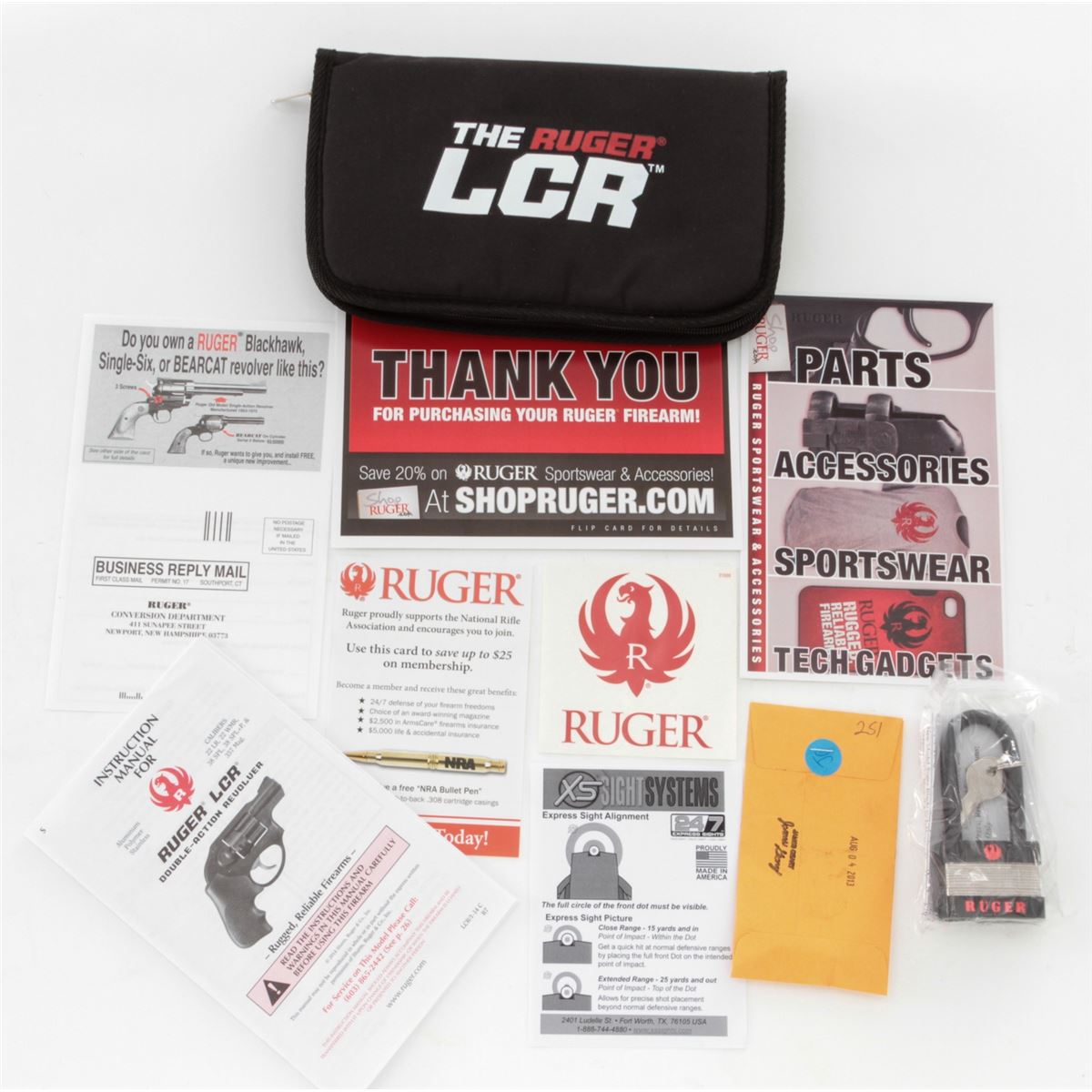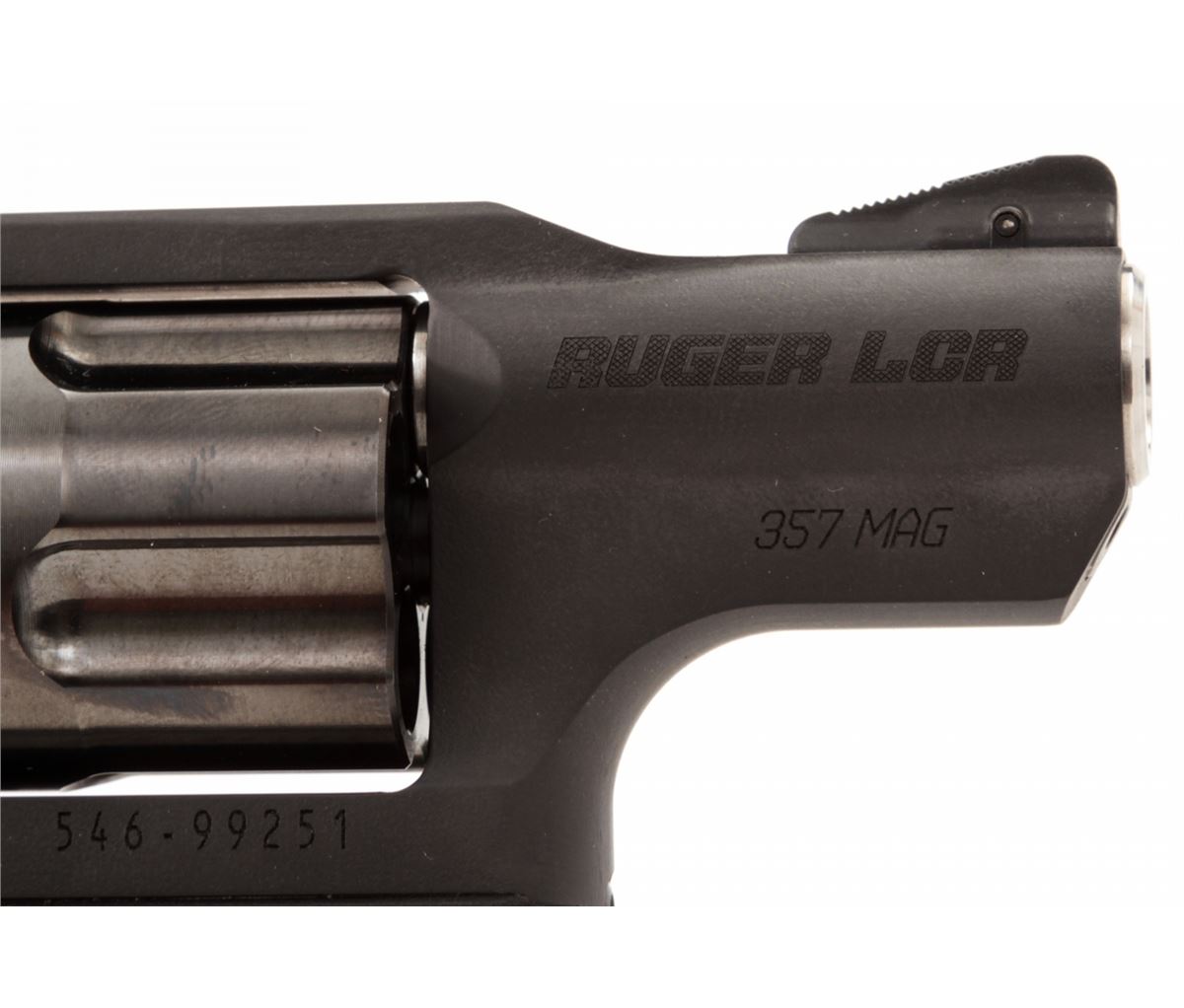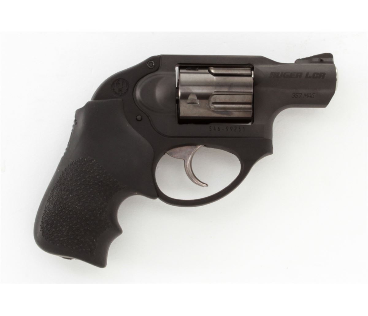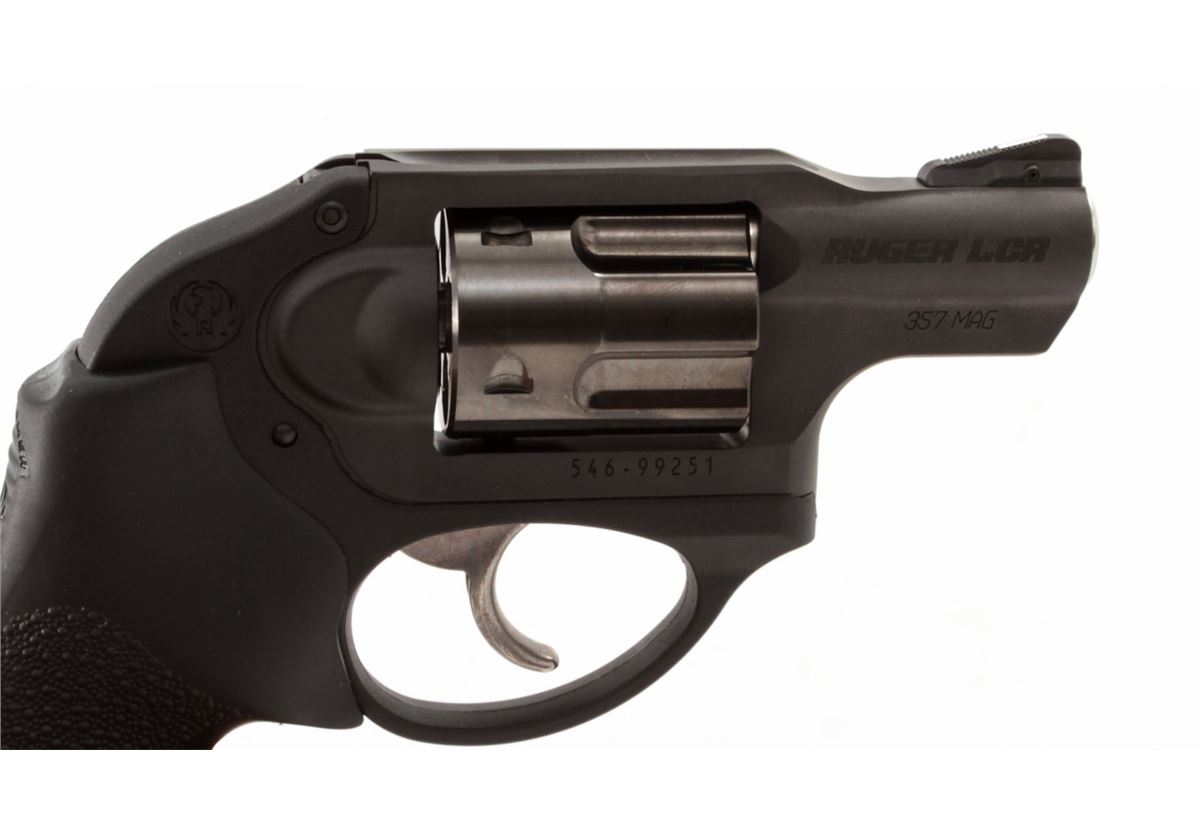 Ruger Model LCR Double Action Revolver, #546-99251, .357 mag. cal., 1-7/8'' barrel, matte black finish, Ruger Hogue Tamer fingergrooved hard rubber grips, integral rear sight, ramped front sight, in original box with matching end label, Ruger soft case, gun lock, and owner's manual. Condition is excellent, remaining new and unfired. Cylinder with light drag line. Retails @ $559.95. Est.: $300-$500. (Modern) (Field Time)