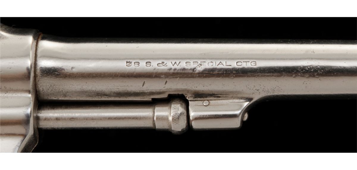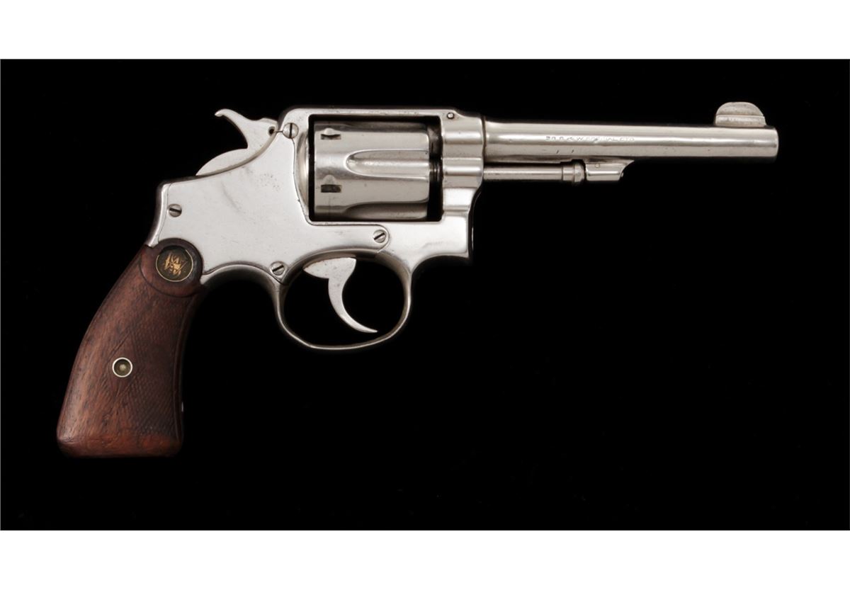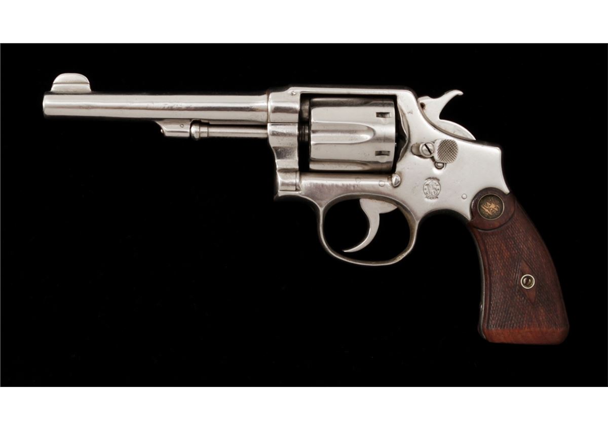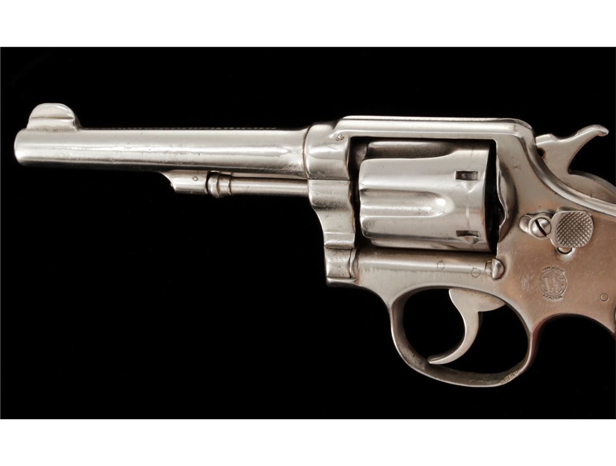 Smith & Wesson M&P Double Action Revolver, #388900, .38 Spec. cal., 5'' barrel, nickel finish, factory checkered walnut grips. Condition is good with later nickel finish. Metal surfaces show light to moderate pitting beneath finish. Grips with moderate to heavy flattening. Good action and bore. Est.: $200-$400. (C&R)
