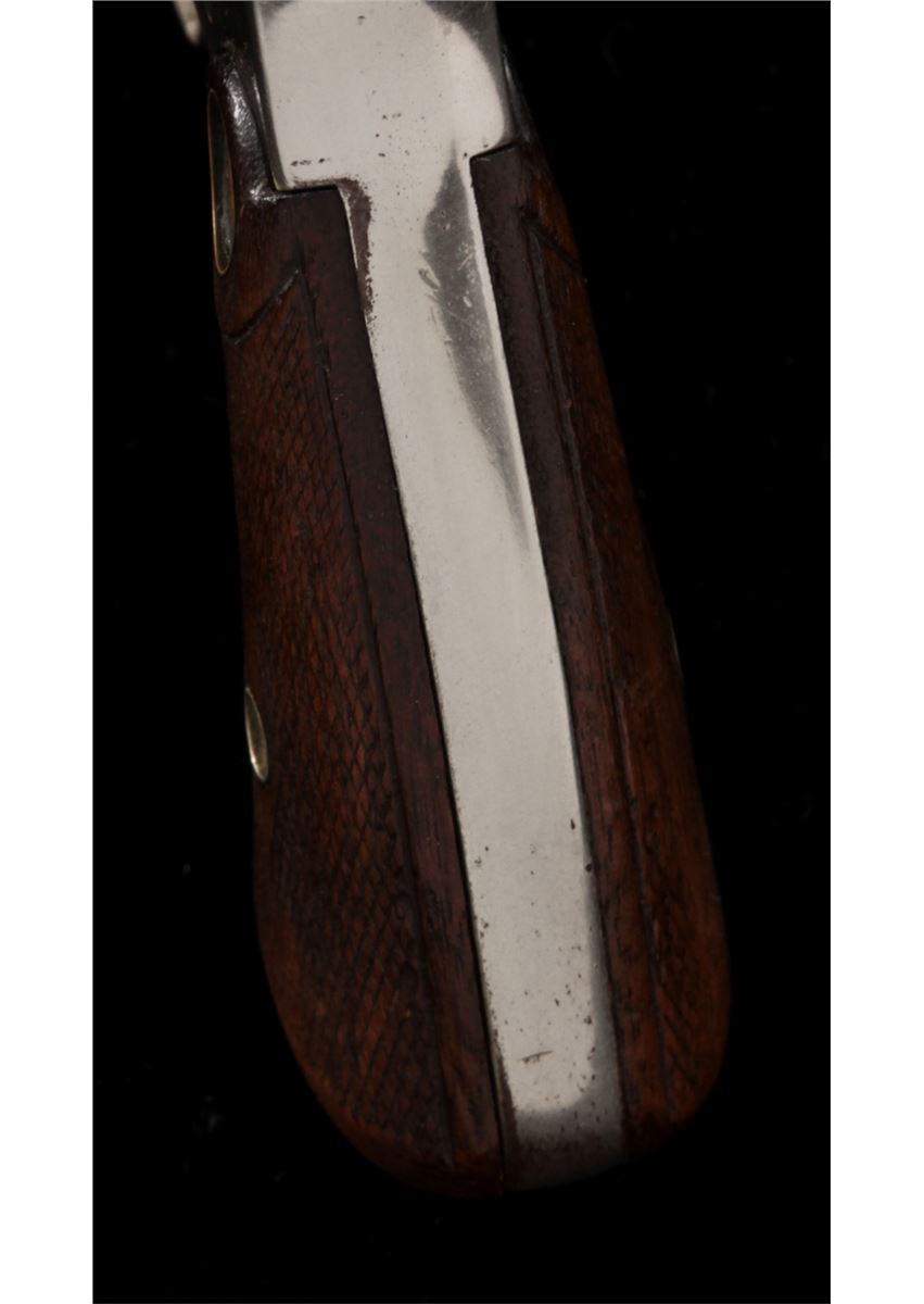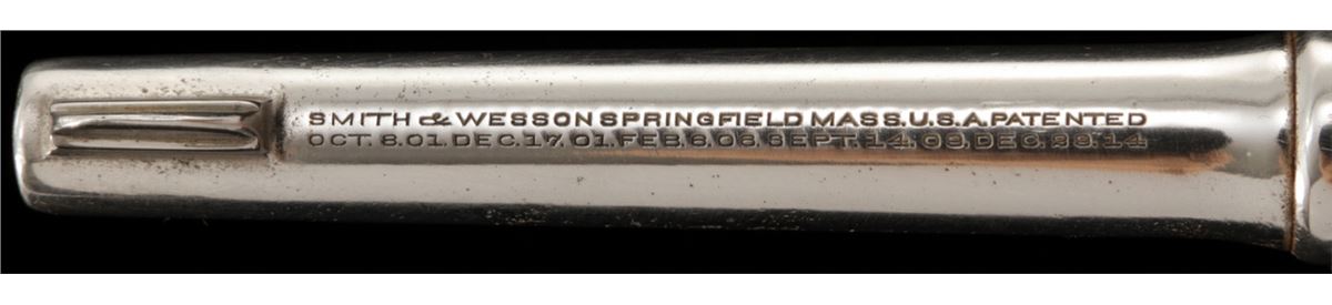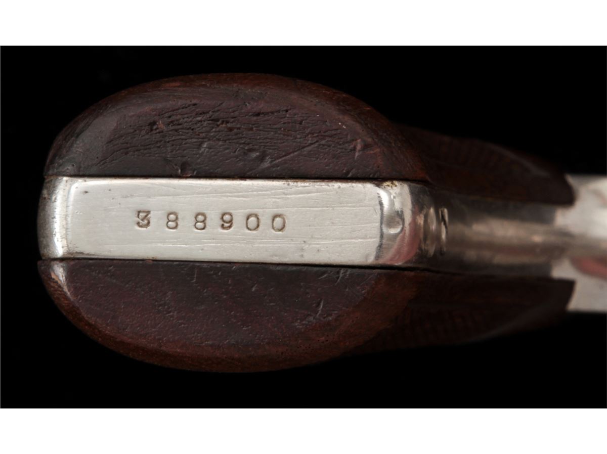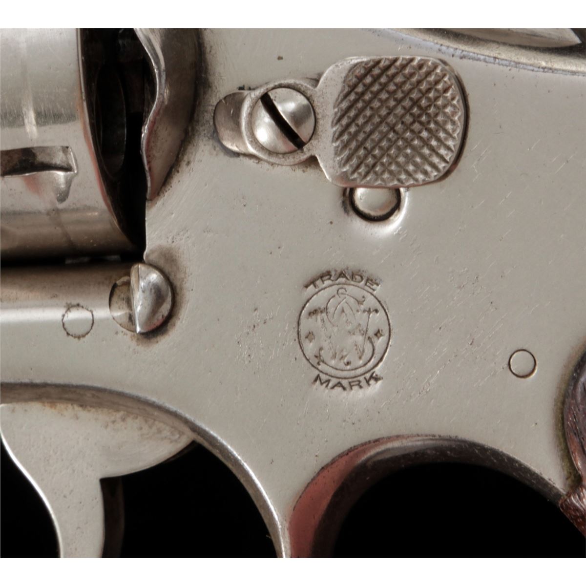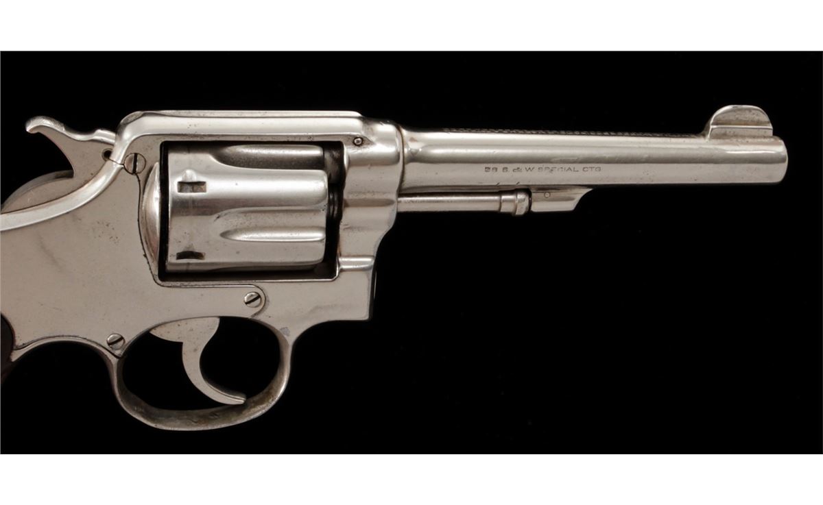 Smith & Wesson M&P Double Action Revolver, #388900, .38 Spec. cal., 5'' barrel, nickel finish, factory checkered walnut grips. Condition is good with later nickel finish. Metal surfaces show light to moderate pitting beneath finish. Grips with moderate to heavy flattening. Good action and bore. Est.: $200-$400. (C&R)