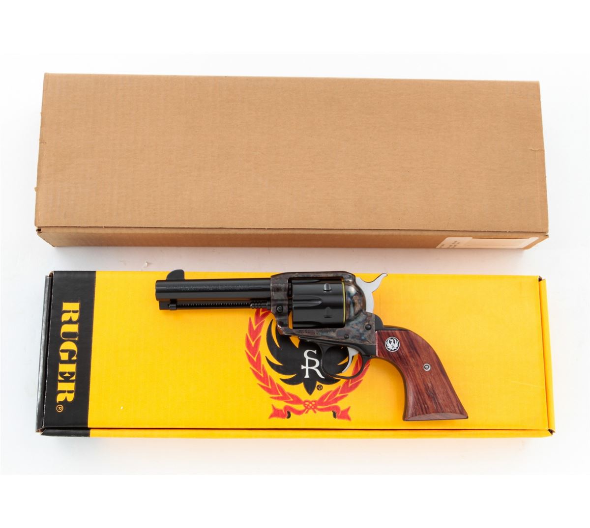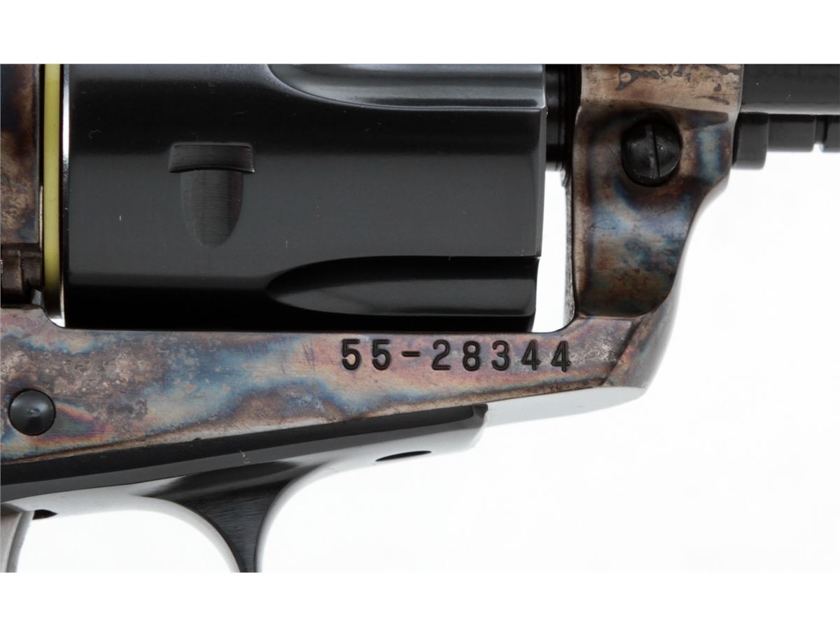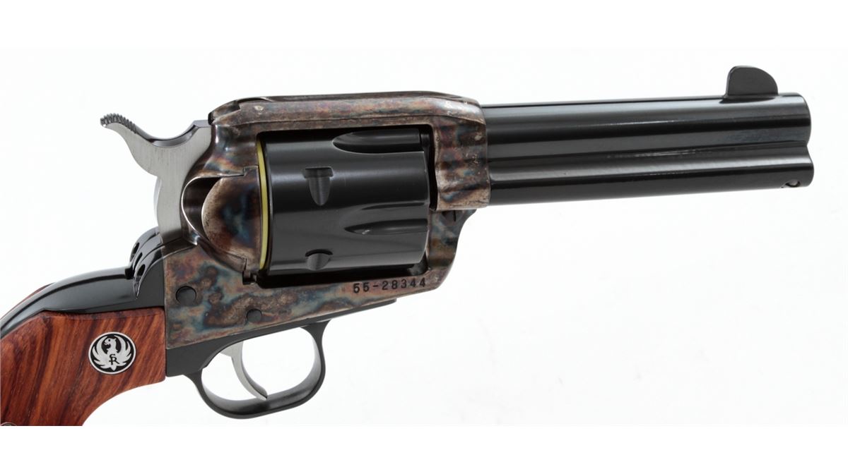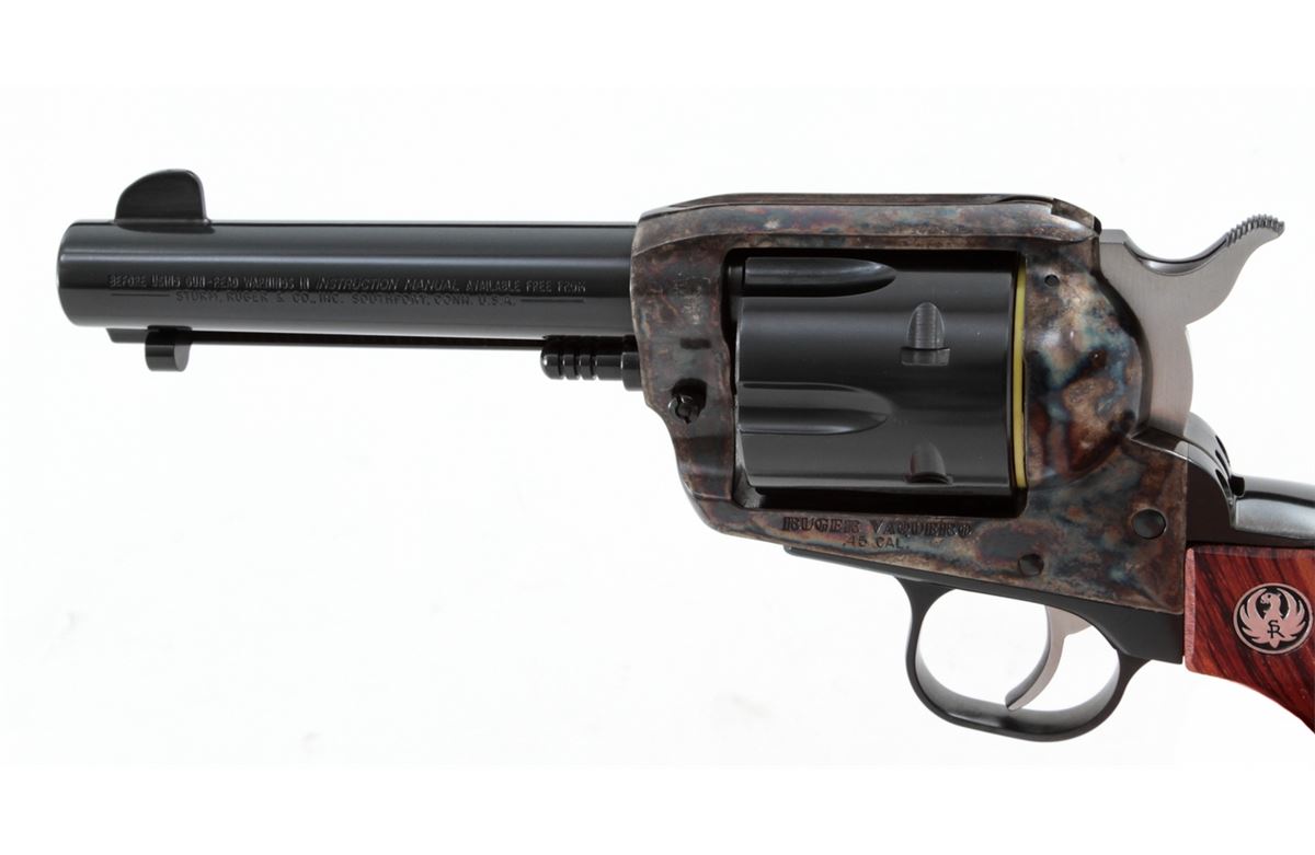 Ruger Vaquero Single Action Revolver, #55-28344, .45 cal., 4-5/8'' barrel, blue finish, case hardened frame, smooth rosewood grips with inlaid Ruger medallions, in original box with matching end label. Condition is excellent, appearing near new, with light index line to the cylinder and light overall marks from handling. Action is crisp, bore is bright. Est.: $450-$600. (Modern/PPT)