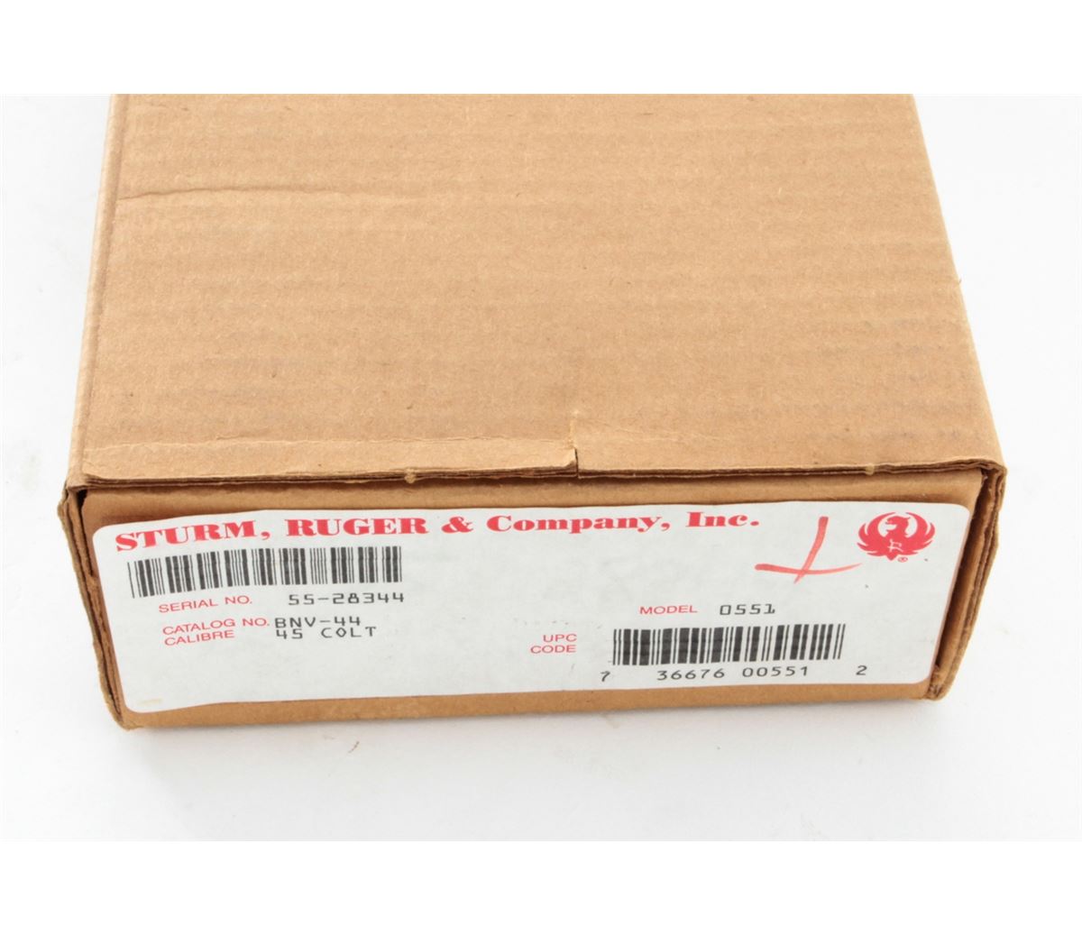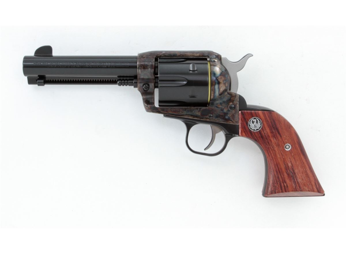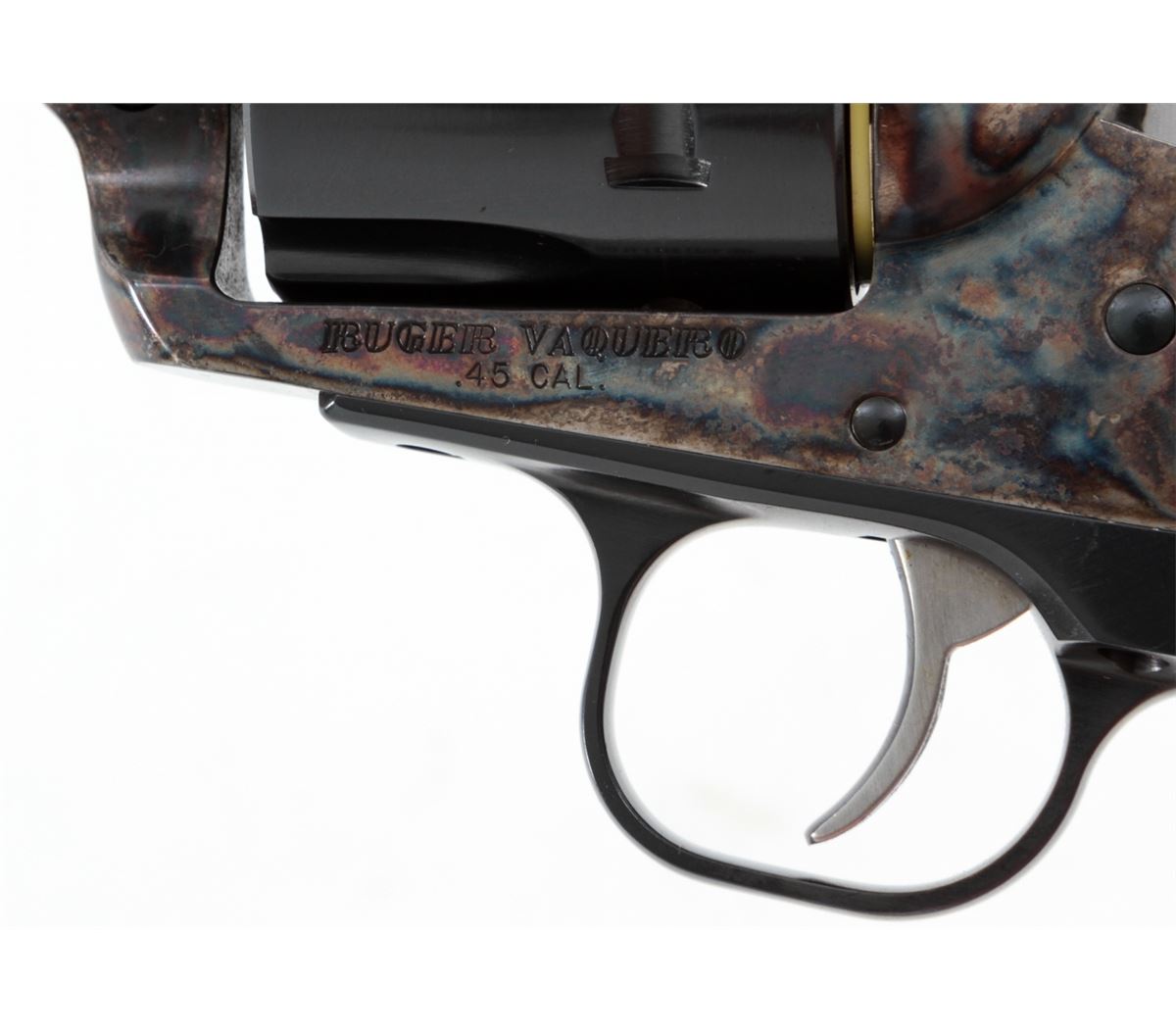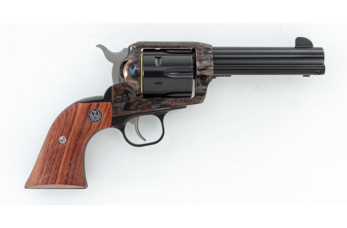 Ruger Vaquero Single Action Revolver, #55-28344, .45 cal., 4-5/8'' barrel, blue finish, case hardened frame, smooth rosewood grips with inlaid Ruger medallions, in original box with matching end label. Condition is excellent, appearing near new, with light index line to the cylinder and light overall marks from handling. Action is crisp, bore is bright. Est.: $450-$600. (Modern/PPT)