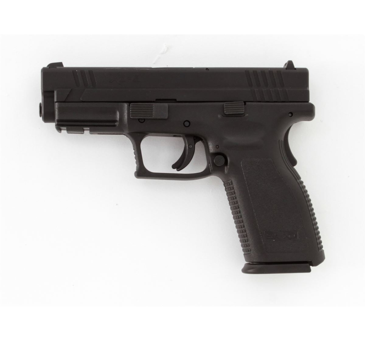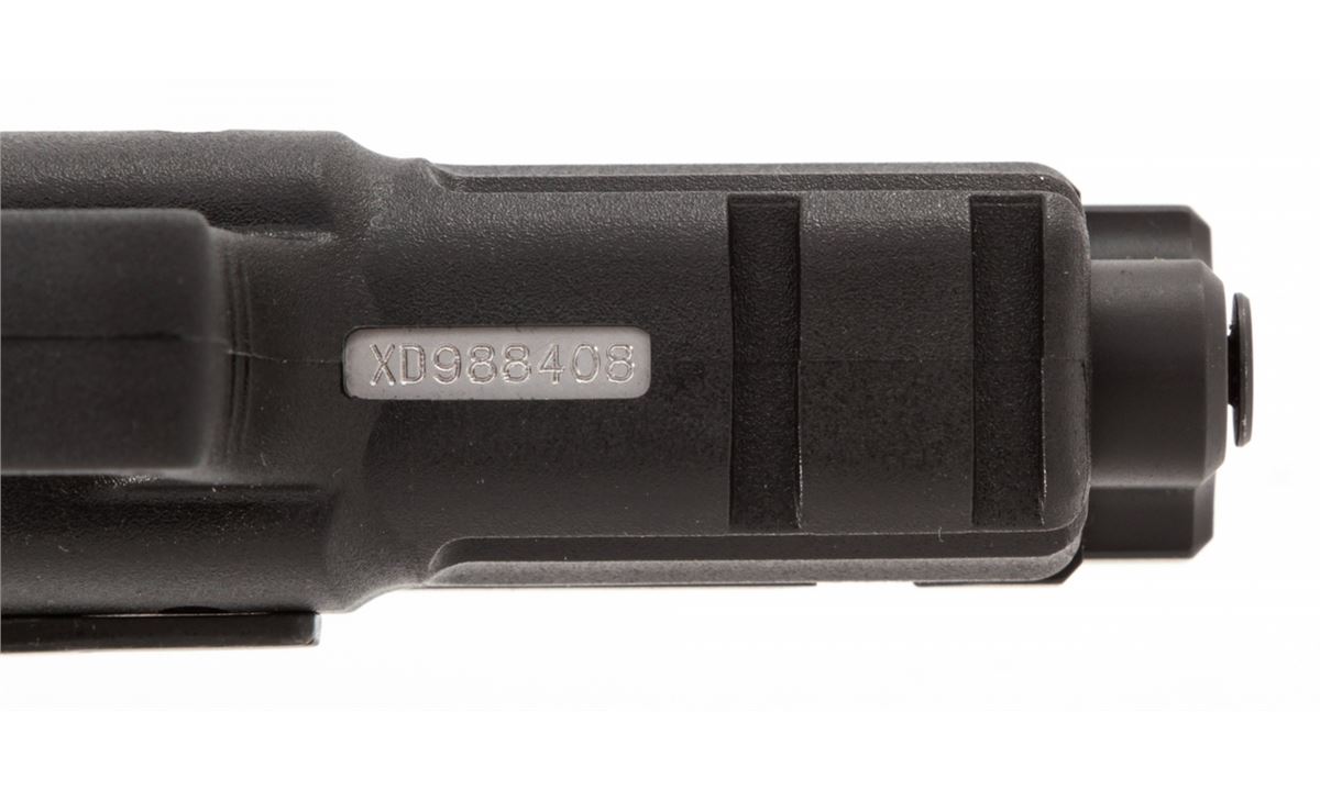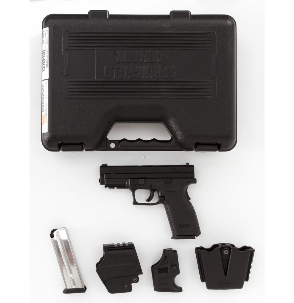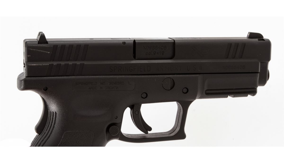 Springfield Armory Model XD-9 Semi-Automatic Pistol, #XD988408, 9mm cal., 4'' barrel, matte finish, integral textured hard plastic grips, three-dot sight system, with two (2) factory magazines and gun lock, original XD accessories including mag holder, and two (2) holsters, in original case with matching end label and owner's manual. Condition is excellent and unfired. Slide with a few moderate marks near rear sight and Springfield Armory logo. Retails @ $559.95. Est.: $350-$500. (Modern) (Field Time)