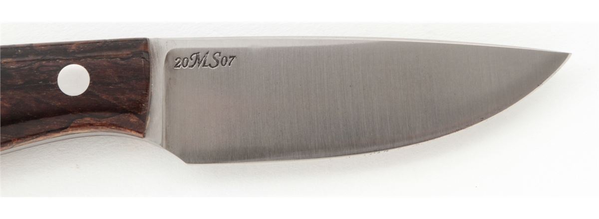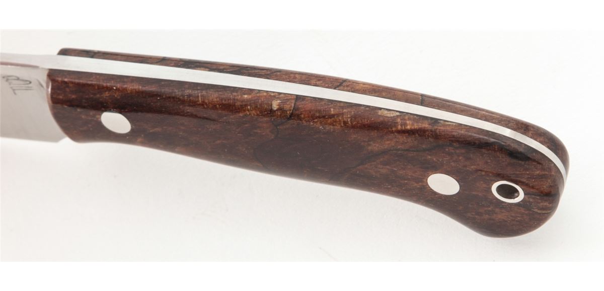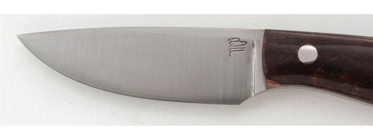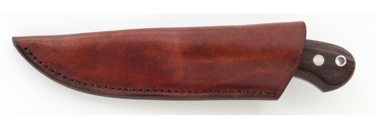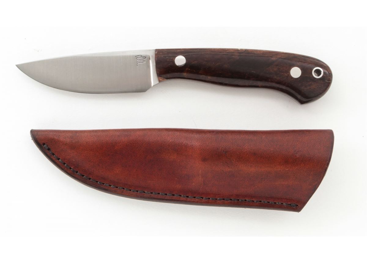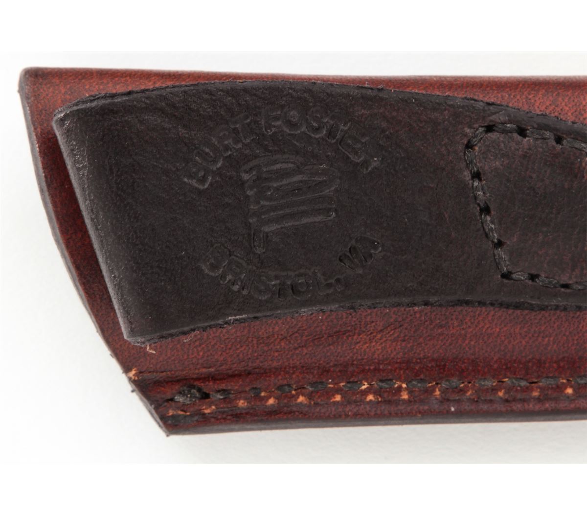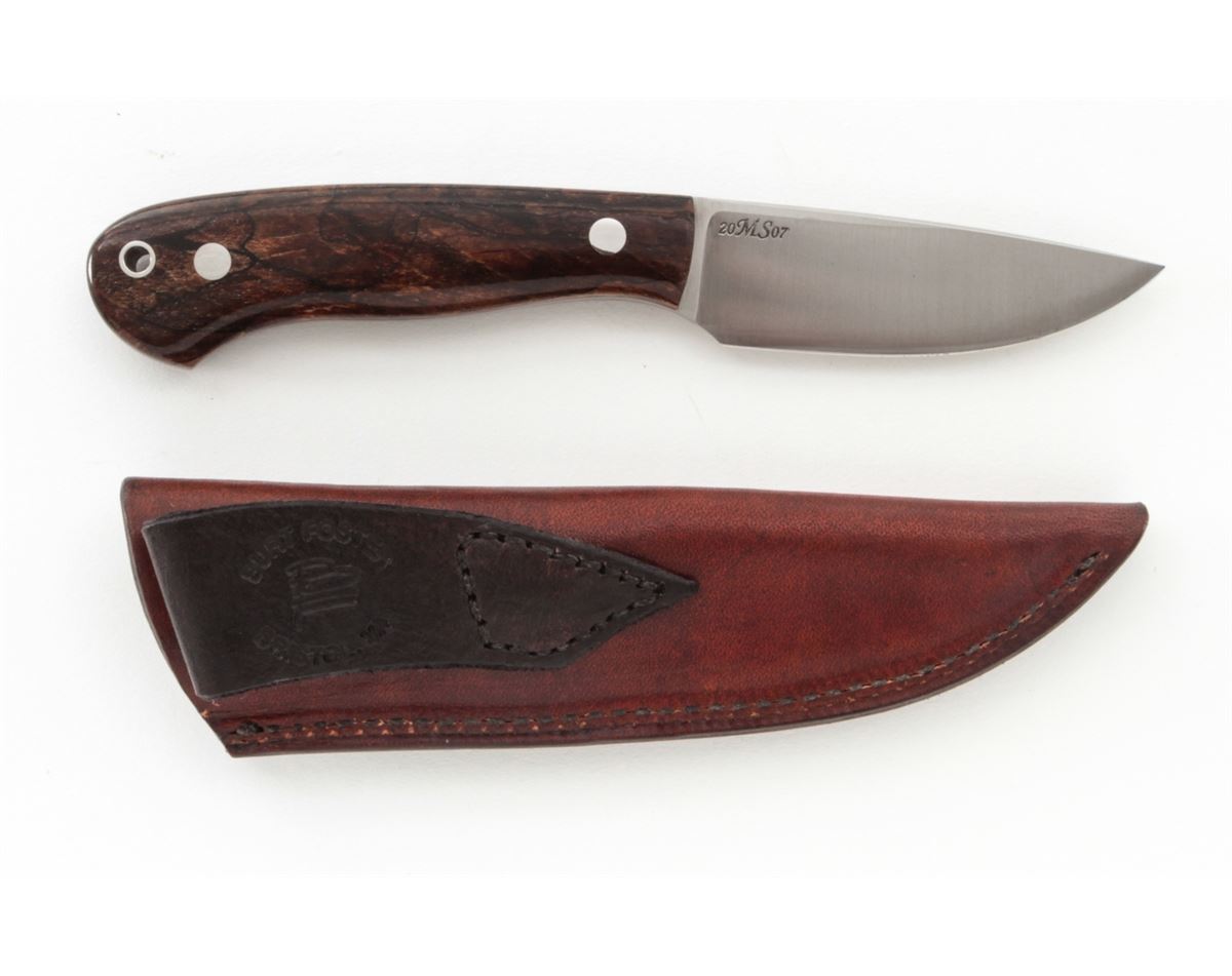 Custom ''Blue Collar Hunter'', by Burt Foster, 3-1/4'' blade marked ''BF''; the reverse is marked ''20MS07''; 7-3/8'' overall length, exotic hardwood handle, nickel silver pins and wrist thong ferrule, in custom two-tone BF leather sheath stamped ''BURT FOSTER/BRISTOL, VA''. Condition is excellent overall. Blade retains the original edge with signs of very light use and very light overall marks from handling. Est.: $250-$350. (Ian Shein estate)