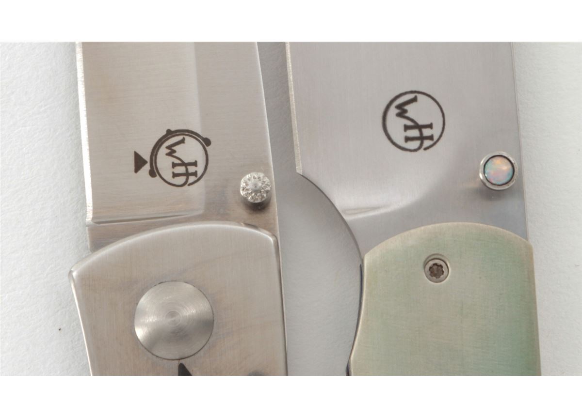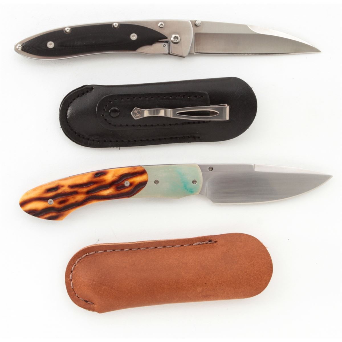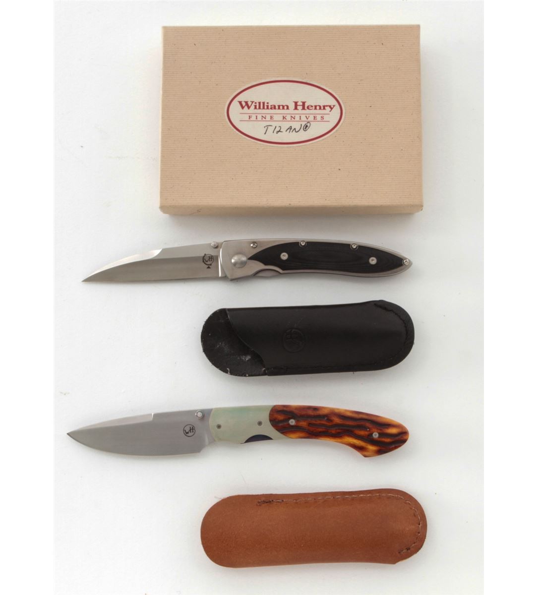 Lot of Two (2) William Henry Fine Folding Knives: 1.) Model #S07G frame lock folding knife, 3'' Wharncliffe blade, 4'' overall closed length, stainless steel frame, black G10 scales, barrel spacers, dual thumb studs, in ''William Henry'' black leather sheath with belt clip. 2.) Model #T-12A liner lock folding knife, 3'' drop-point blade, 4'' overall closed length, single abalone inlaid thumb stud, nickel silver bolster, amber jigged bone scales, anodized titanium liner, brown leather case, in original box. Condition to both is excellent appearing as new and showing no use, with very few overall light marks from handling. Est.: $350-$500/lot. (Ian Shein estate)