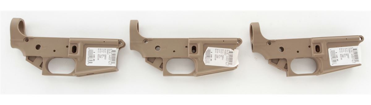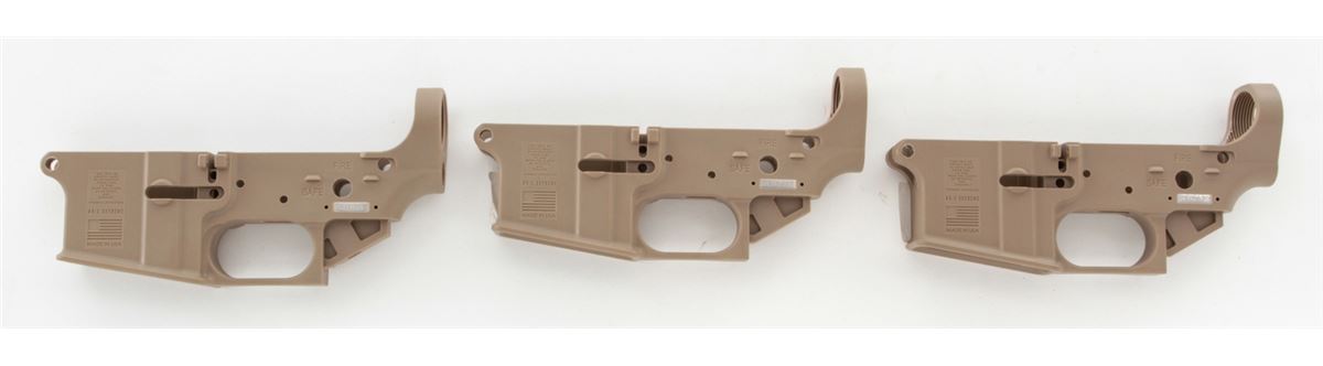 Lot of Three (3) FDE AR-1 Patriot Multi-Caliber AR Polymer Frame Lower Receivers, #FDE0526, #FDE0567, and #FDE0541, all in desert sand color. Brand new. Retails @ $450/lot. Est.: $250-$400/lot. (Modern, registration required) (Field Time)