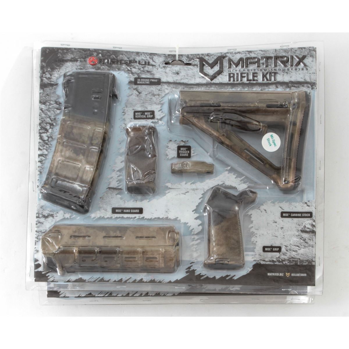 Lot of Two (2) Matrix Diversified Ind. MagPul AR-15 Rifle Kits, includes MDI custom finish magpul, MOE carbine HG, pistol grip, vertical grip, triggerguard, MOE buttstock, and one 30-round mag per kit. All brand new in original packaging. Retails @ $500/lot. Est.: $200-$400/lot. (High cap mags not available to Calif. residents.) (Field Time)