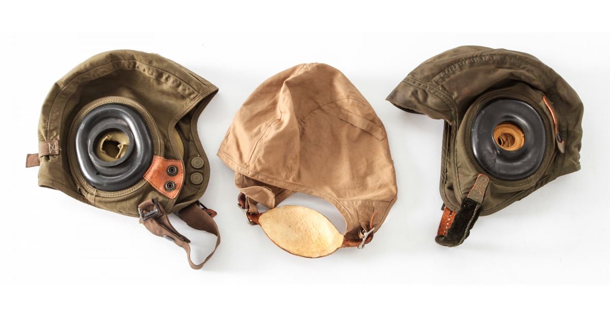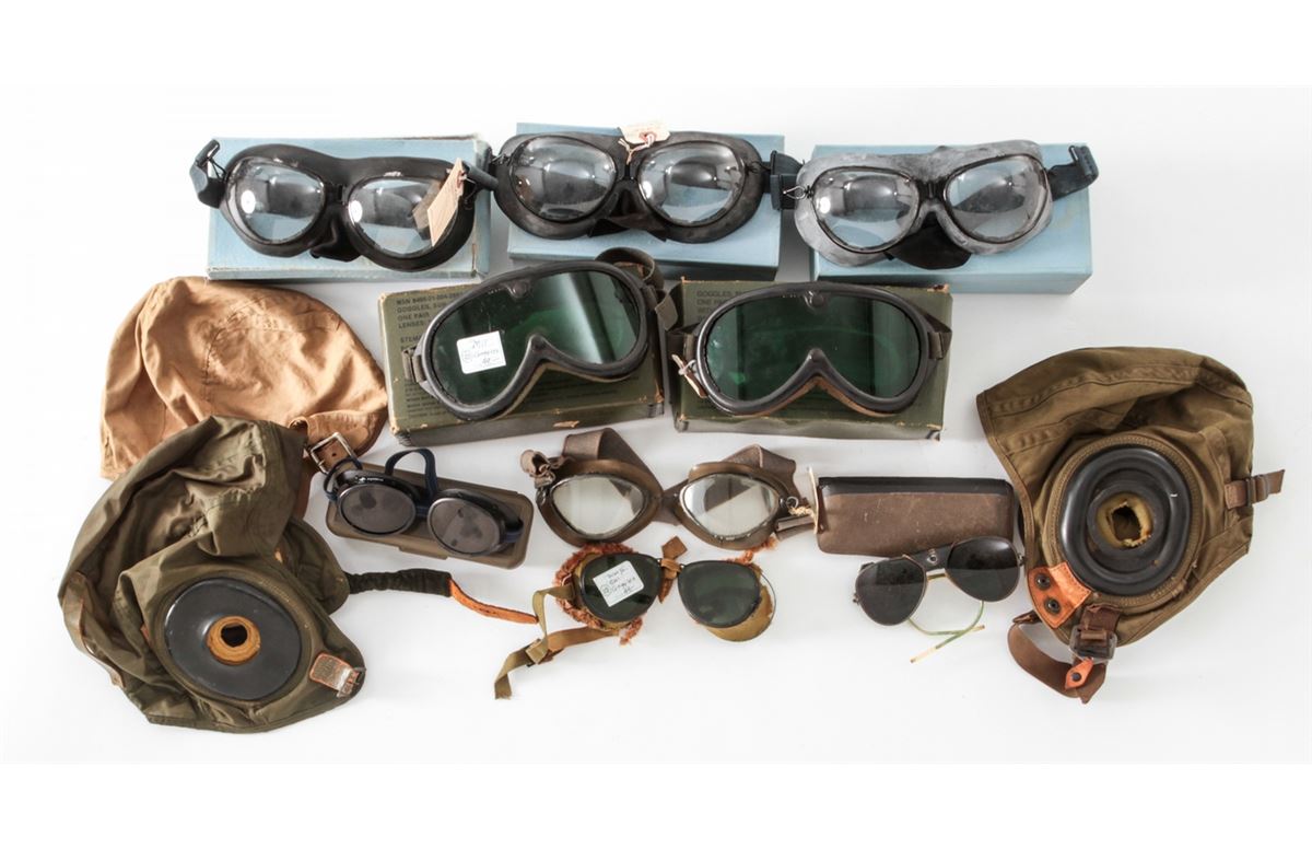 Misc. Lot of Mid-Century Flight Helmets and Goggles, dating from WWII to present day. Condition to all is fair to excellent. Est.: $200-$400/lot.