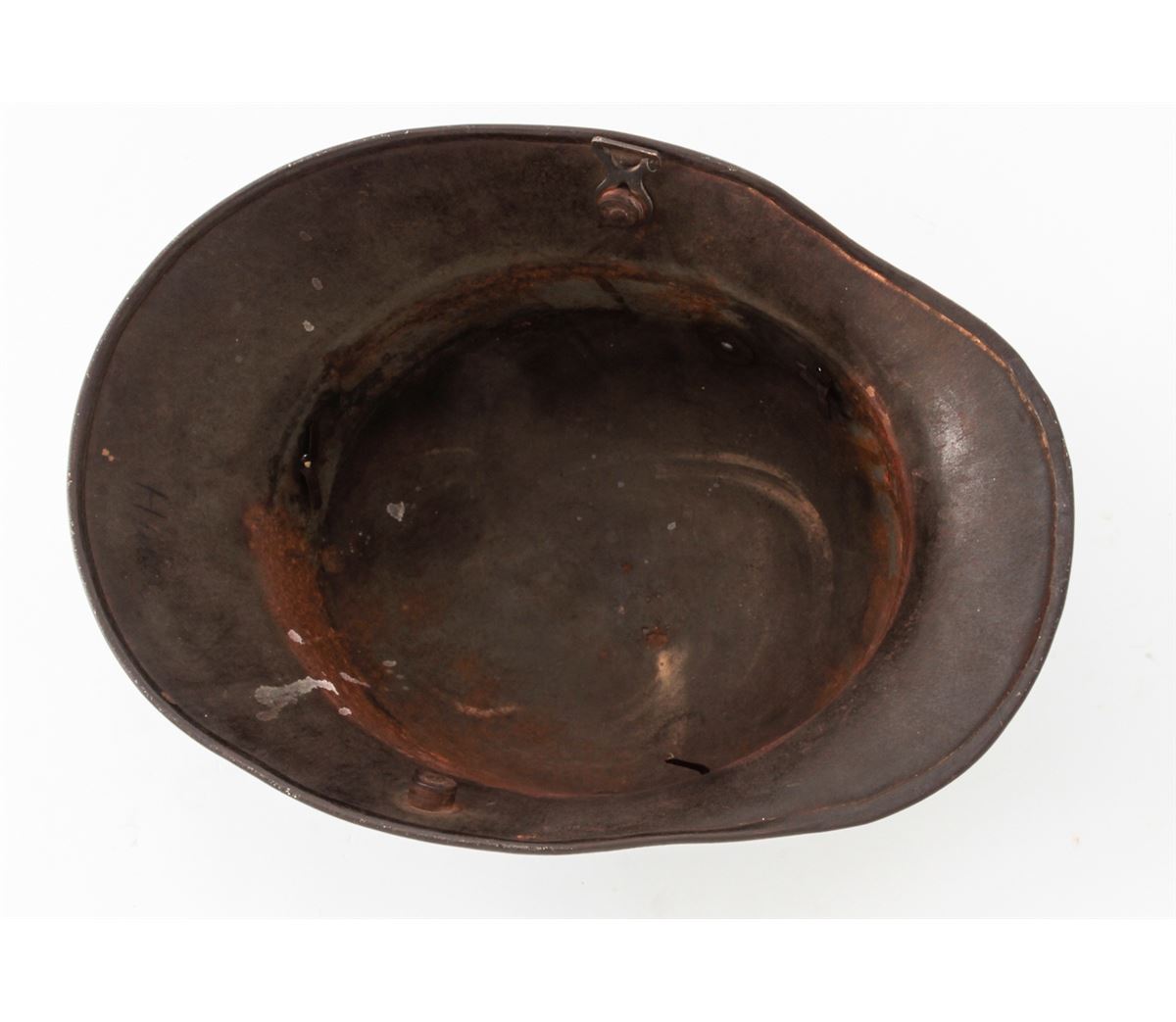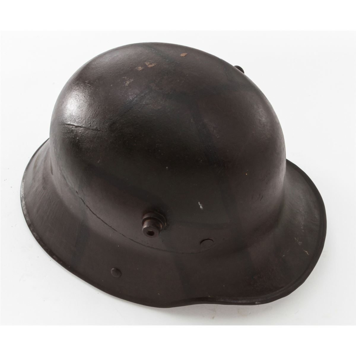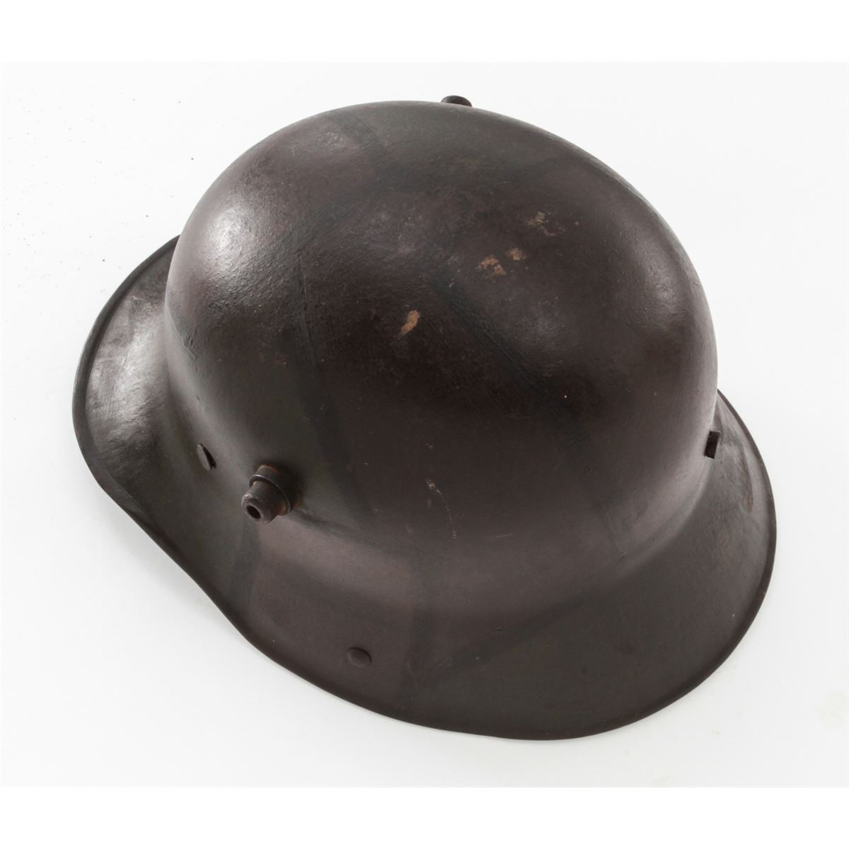 WWI Model 1916 Camouflaged German Helmet. Condition is fine with darkening to Western Front type camouflage. Liner and chinstrap are missing. Est.: $250-$400.