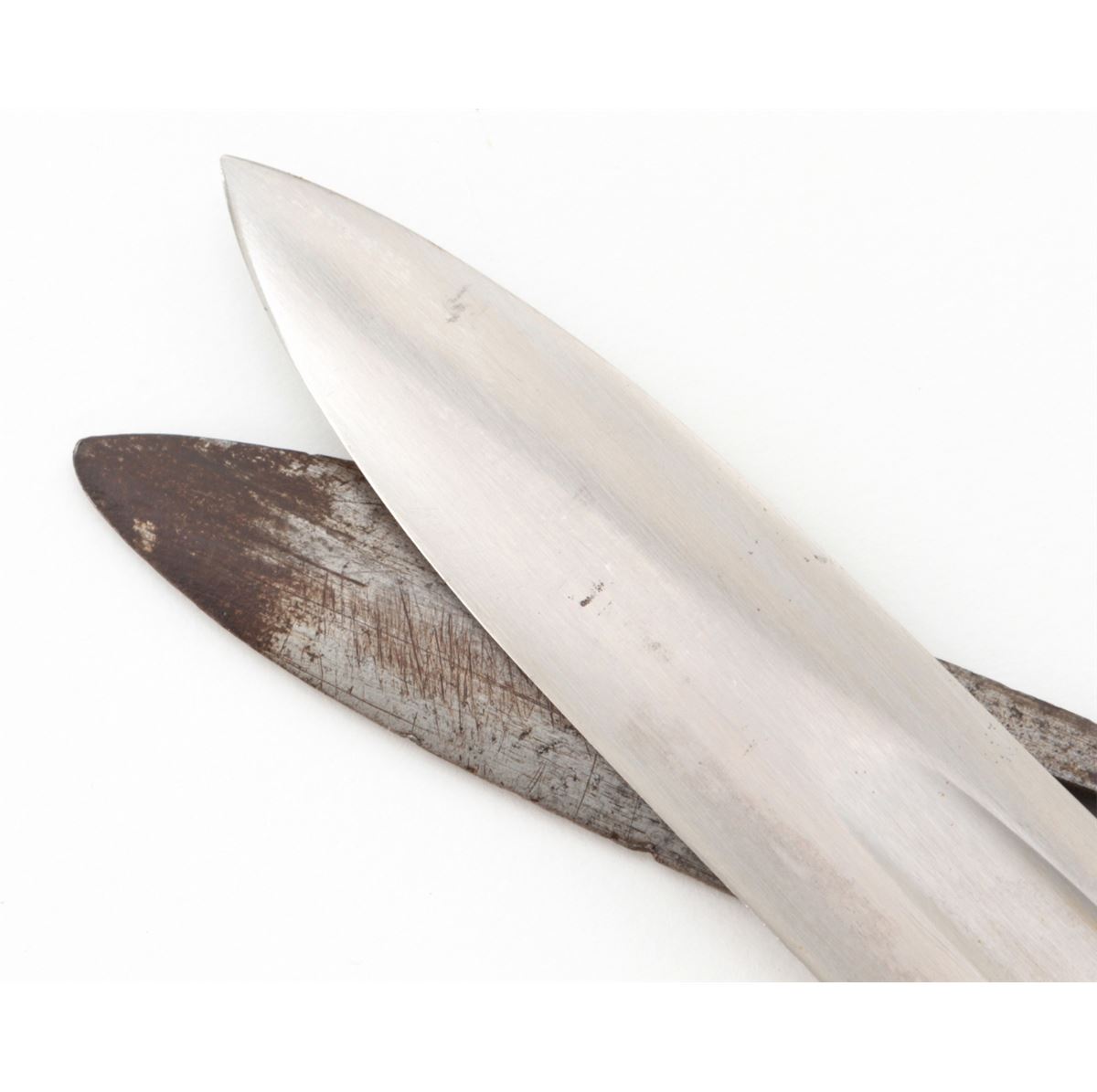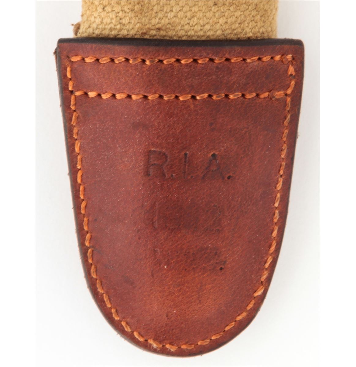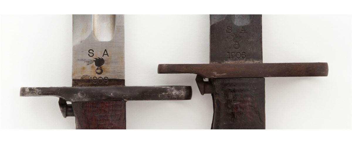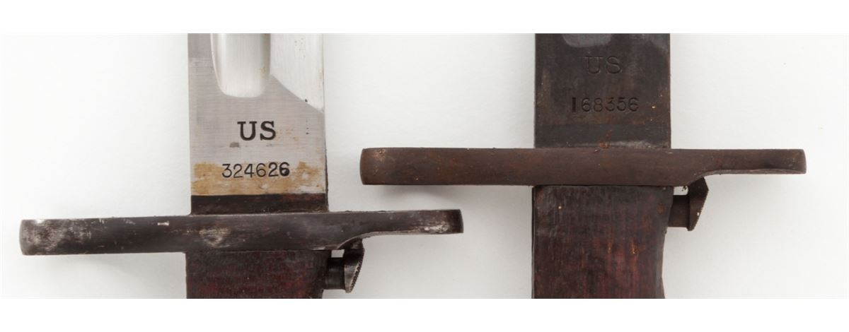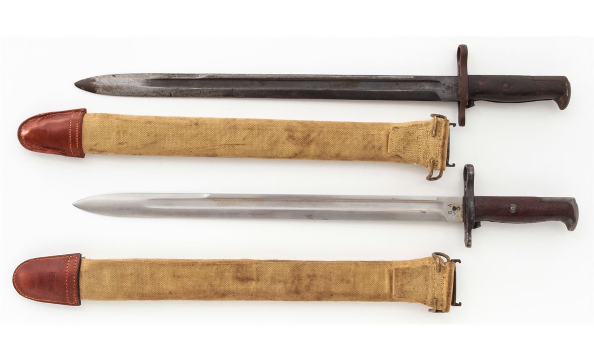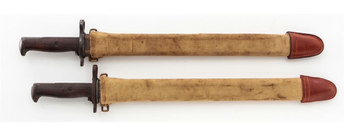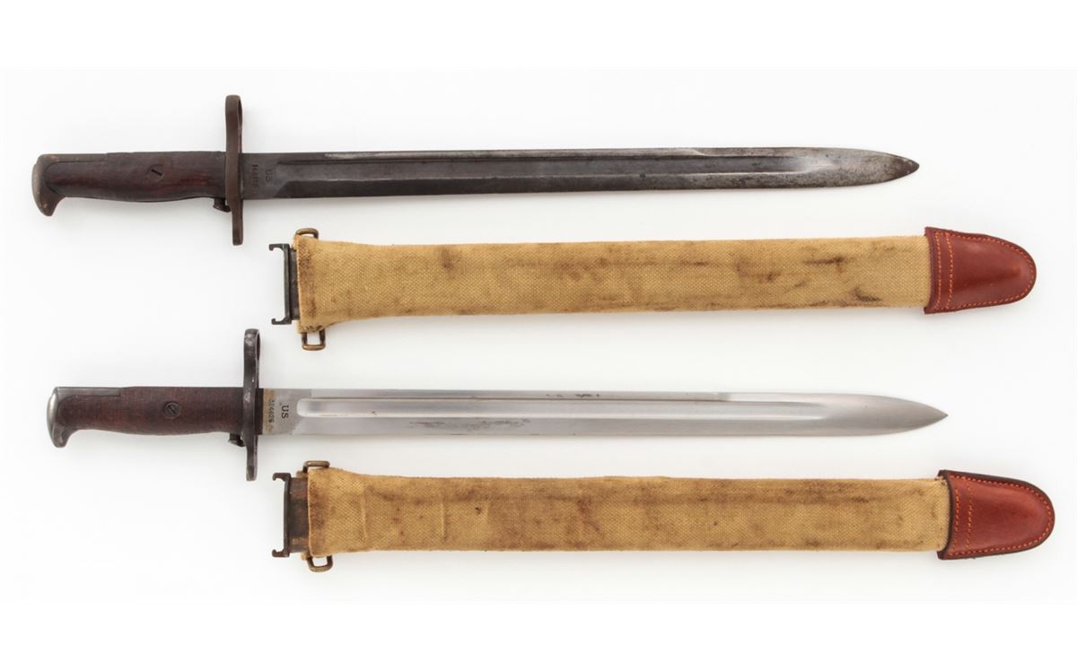 Lot of Two (2) U.S. Model 1905 Bayonets, both by Springfield Armory, #168356 & 324626, 15-7/8'' & 16'' blades, 20-3/8'' & 20-1/2'' overall, one is dated ''1906'' and the other ''1908'', wood grips, bird's head pommels, both with canvas covered scabbards with brass belt hangars and leather tips. One is marked ''R.I.A./1912''. Condition of the 1906 dated bayonet is good overall and the 1908 bayonet is very good overall. Both show signs of age and use. Wood grips with flattening and oil darkening. Canvas covered scabbards with moderate discoloration, the leather tips may be later replacements. Guard on the 1906 bayonet with dark patination and surface rust; grips with additional light to moderate impressions. Push buttons on both bayonets function properly. Est.: $200-$350/lot.