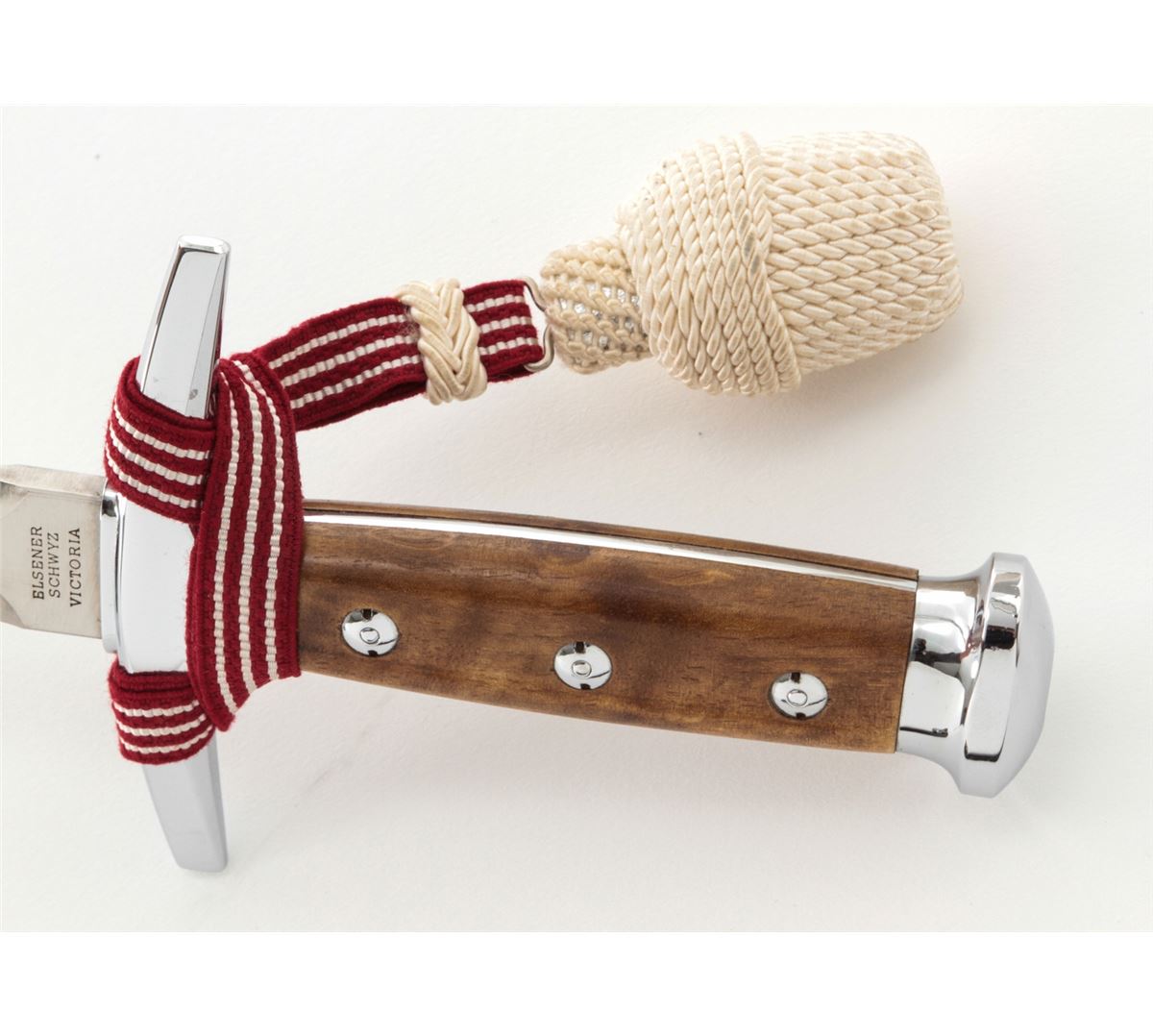 Swiss Army Officer's Dagger, by Elsener Schwyz, Victoria, #219298, 8-1/4'' blade, 13-1/4'' overall, nickel-plated guard and pommel, hardwood handle, red & white ribbon, white portapie, and black metal scabbard with belt hanger. Condition is fine overall with moderate scratches and scabbard wear to blade. Wood grip with light marks from handling; portapie and ribbon remain tight and are free of any soiling or fraying. Est.: $350-$450.