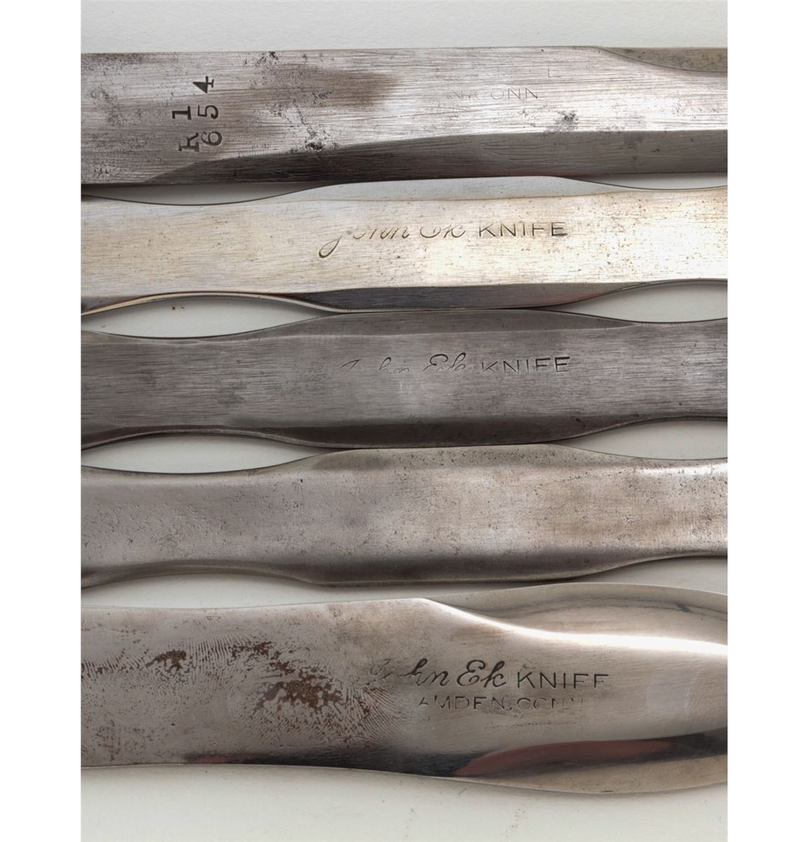 Lot of Five (5) Early John Ek Throwing Knives, included are knives of three different shapes, measuring from 7-7/8'' to 9'' overall; four of the five knives are marked ''John Ek'', on two the remnants of ''Hamden Conn.'' is partially legible. The fifth knife is unmarked but appears to be original. Two of the knives are drilled for a wrist thong. Included is a blue nylon cordura carrying case. Conditions range from good to fine overall. Knives show light to moderate signs of age and use, maker's marks are partially legible, some with overall light carbon spotting; the unmarked knife with moderate pitting. A nice collection of seldom seen knives. Est.: $400-$600/lot.