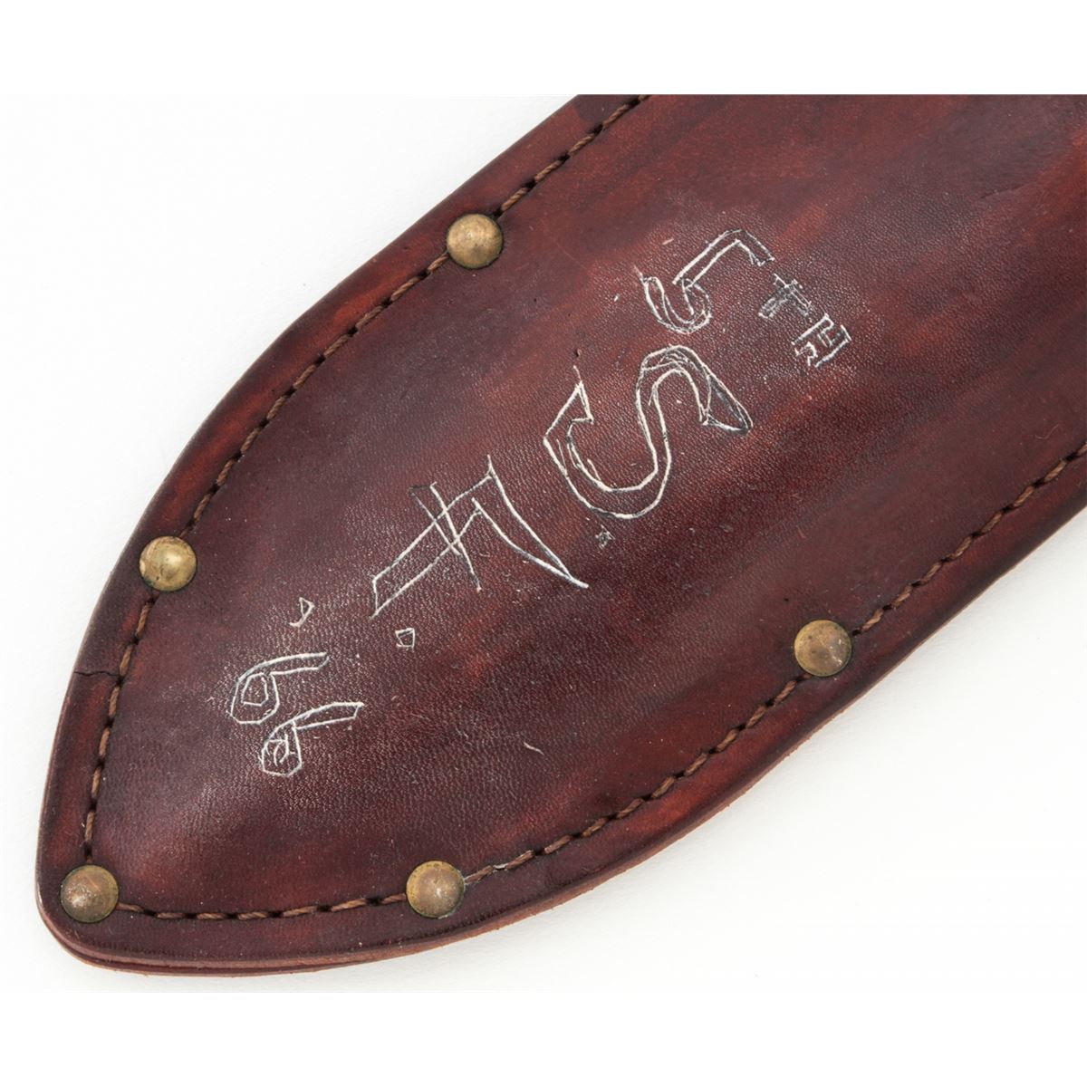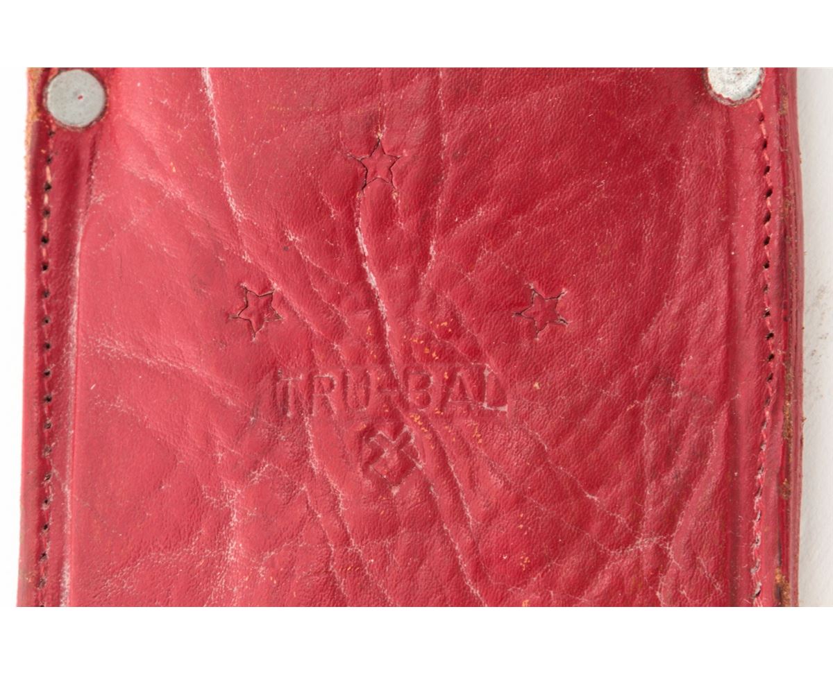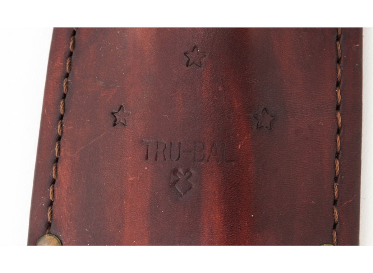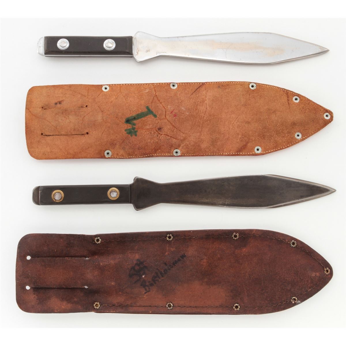 Lot of Two (2) Vietnam Era Tru-Bal Model #1 Throwing/Fighting Knives, 9'' blades, one blue and the other bright, 13-1/2'' overall length, black vulcanized fibre handles held in place with steel rivets. Both with the original leather Tru-Bal sheaths. One of the sheaths is dyed red with ''#1'' written on the back. The second sheath is brown and has been decorated on the front side with the words ''5th S.F. '66''. Written on the back side is the name ''Sgt. Bartholomew''. Condition to both is very good overall, the blued knife with approx. 85% thinning blue finish and several small chips to the handle. The second knife appears to have been cleaned with losses to the finish around the edges. The sheaths with vivid colors, tight stitching and seams. Est.: $250-$400/lot.