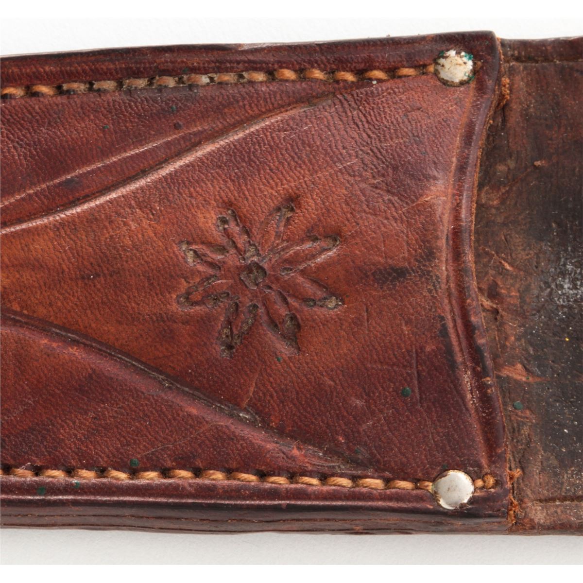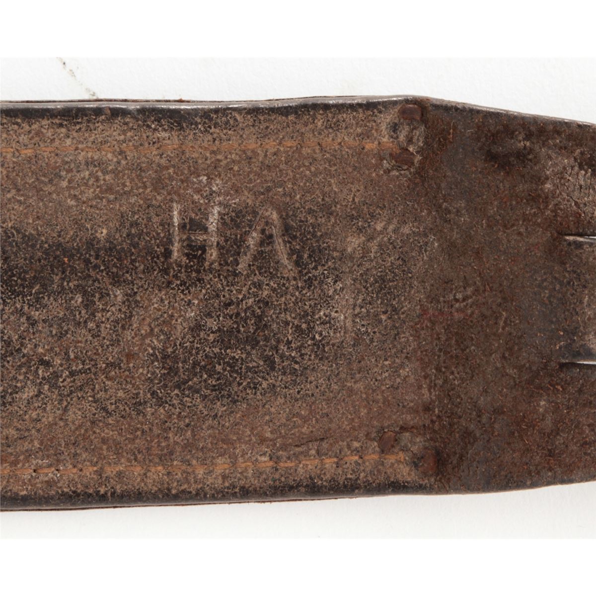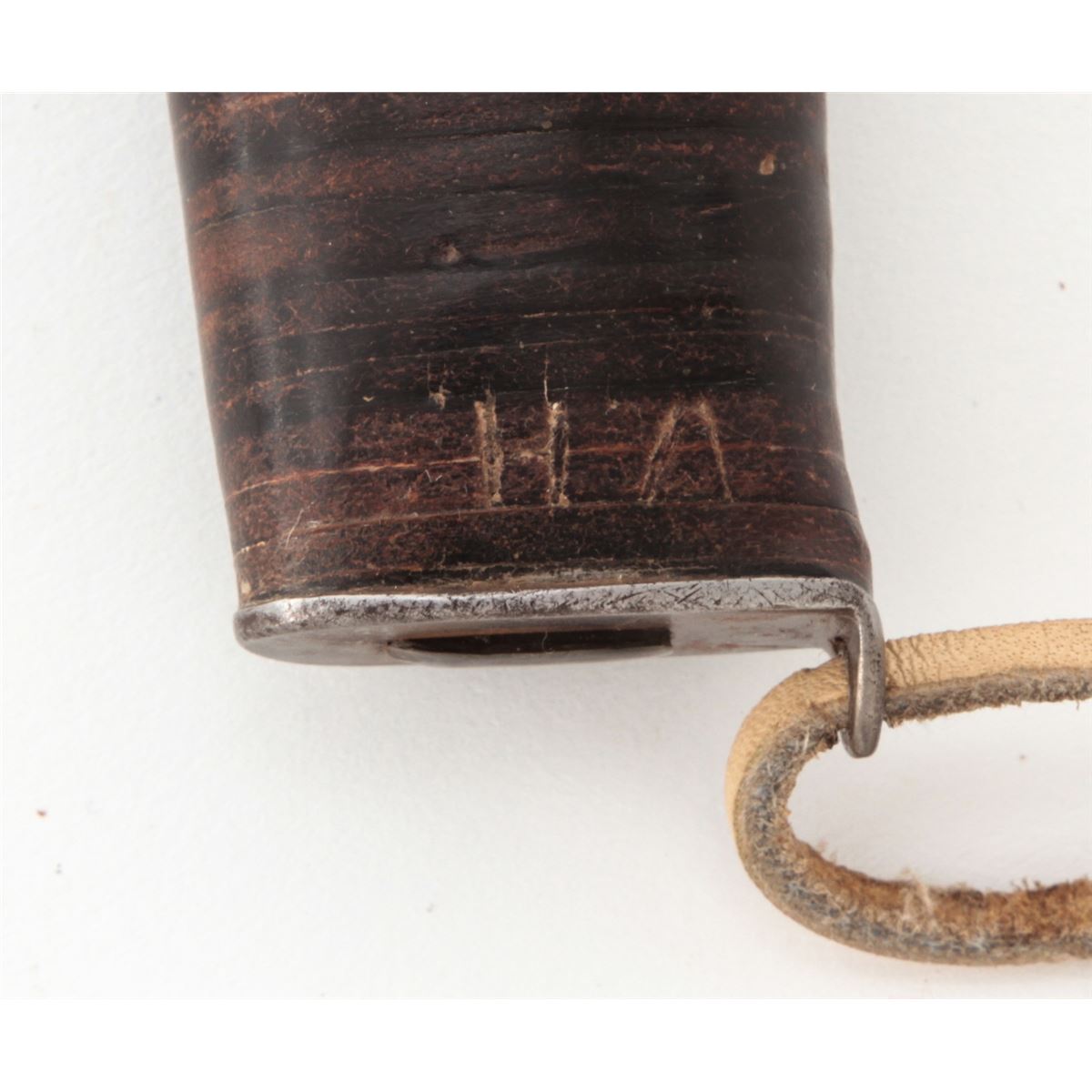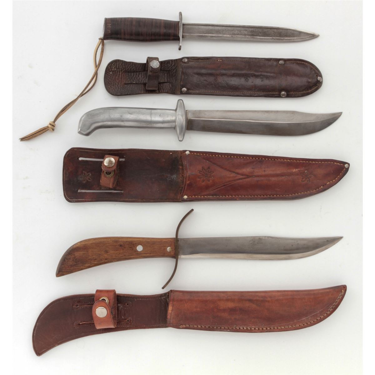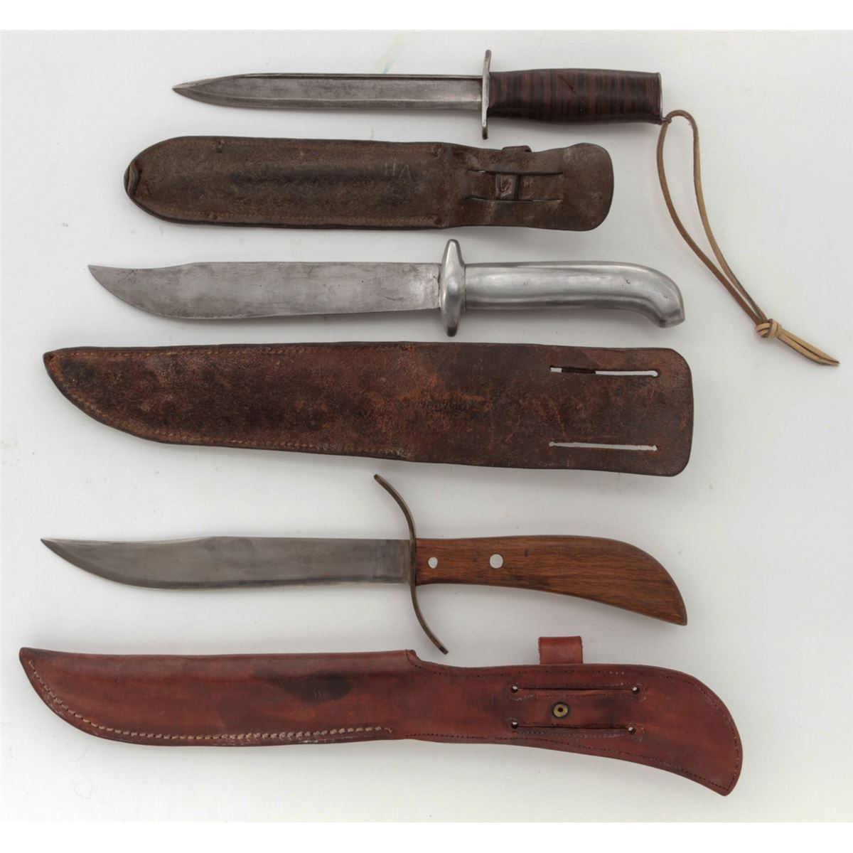 Lot of Three (3) Theatre Made/Modified Knives: 1.) 9'' clipped point blade, 16'' overall, brass ''S''-shaped guard, walnut handle held in place by two aluminum pins, with large brown leather sheath. 2.) 7-7/8'' blade modified from either a sword or bayonet, 12-3/8'' overall, steel full guard, stacked leather washer handle, steel pommel, leather boot lace style wrist thong, with brown leather five-pin sheath. Leather handle and front side of sheath have the letters ''HA'' scratched into the surface. 3.) 8-3/4'' clipped point blade, 14-1/2'' overall, aluminum guard and handle, tooled leather sheath with the name ''WALT'' scratched on front. Conditions are very good overall as modified. The aluminum handle with a crack to one side. All knives show normal signs of age and use. Est.: $250-$350/lot.