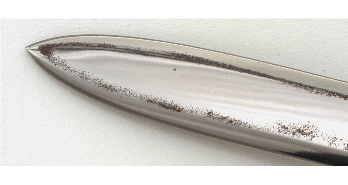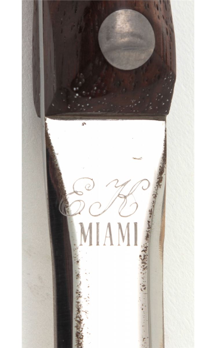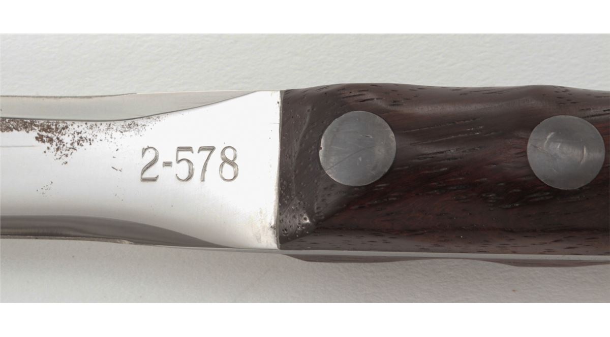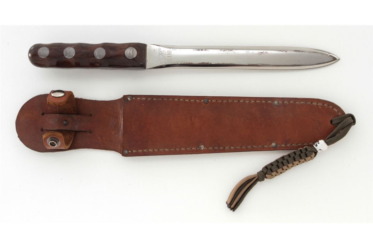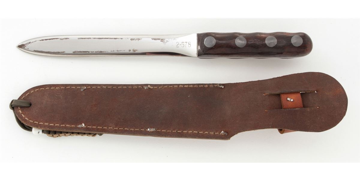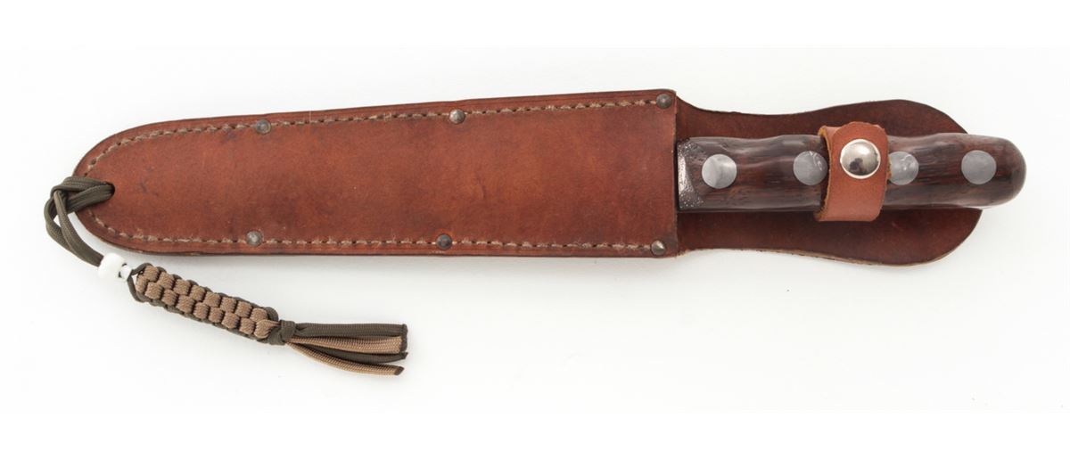 Miami, Florida John Ek Model #2 Fighting Knife, 7-1/8'' blade marked ''EK/Miami'', reverse marked ''2-578''; 11-5/8'' overall length, finger-grooved wood handle, steel rivets, in brown leather sheath with braided paracord lanyard and plastic skull medallion. Condition is fine overall. Blade with patches of light surface rust that should clean easily, clear maker's marks, wood scales with light marks from handling; sheath with mild darkening, stitching and seams remain tight. Est.: $400-$600.