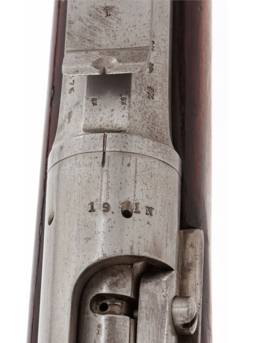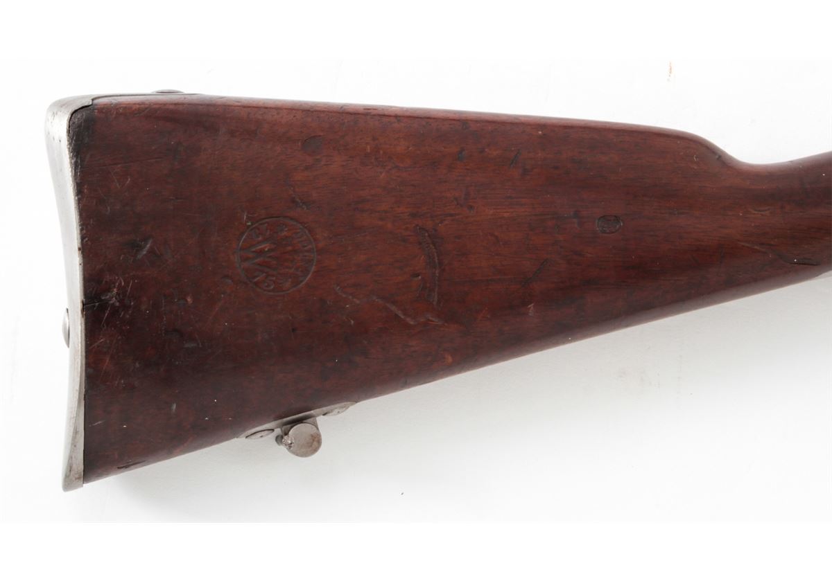 Beaumont-Vitali Model 1871/88 Bolt Action Rifle, #2318, 11.3x51R cal., 32.7'' barrel, finished in the white, Dutch cartouched walnut stock, with both rifle and stock dated 1875. Condition is about fine. Metal surfaces may have had a light cleaning at one point. Stock with clear ''Delft'' cartouche and light scuffs. Repair at left side upper tang. Action is good, bore is fine. Est.: $ 250-$350. (Antique)