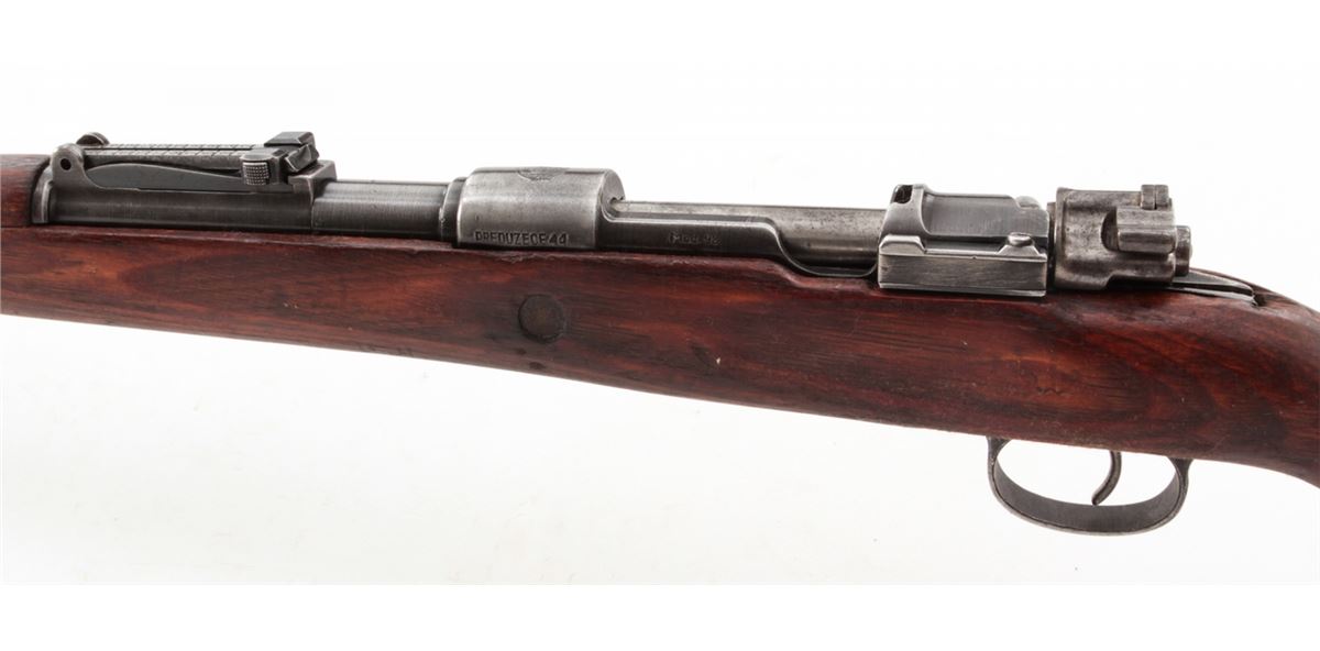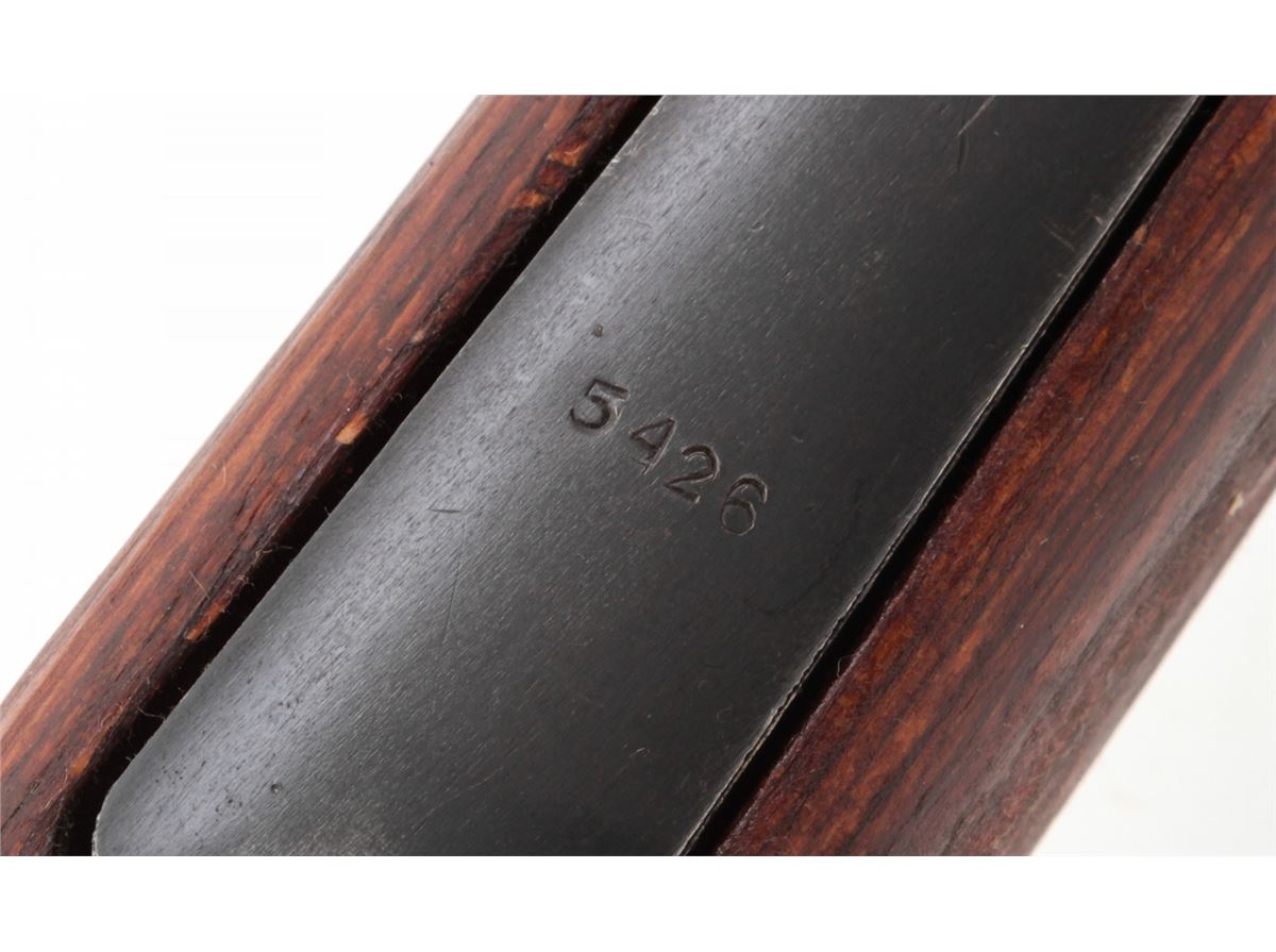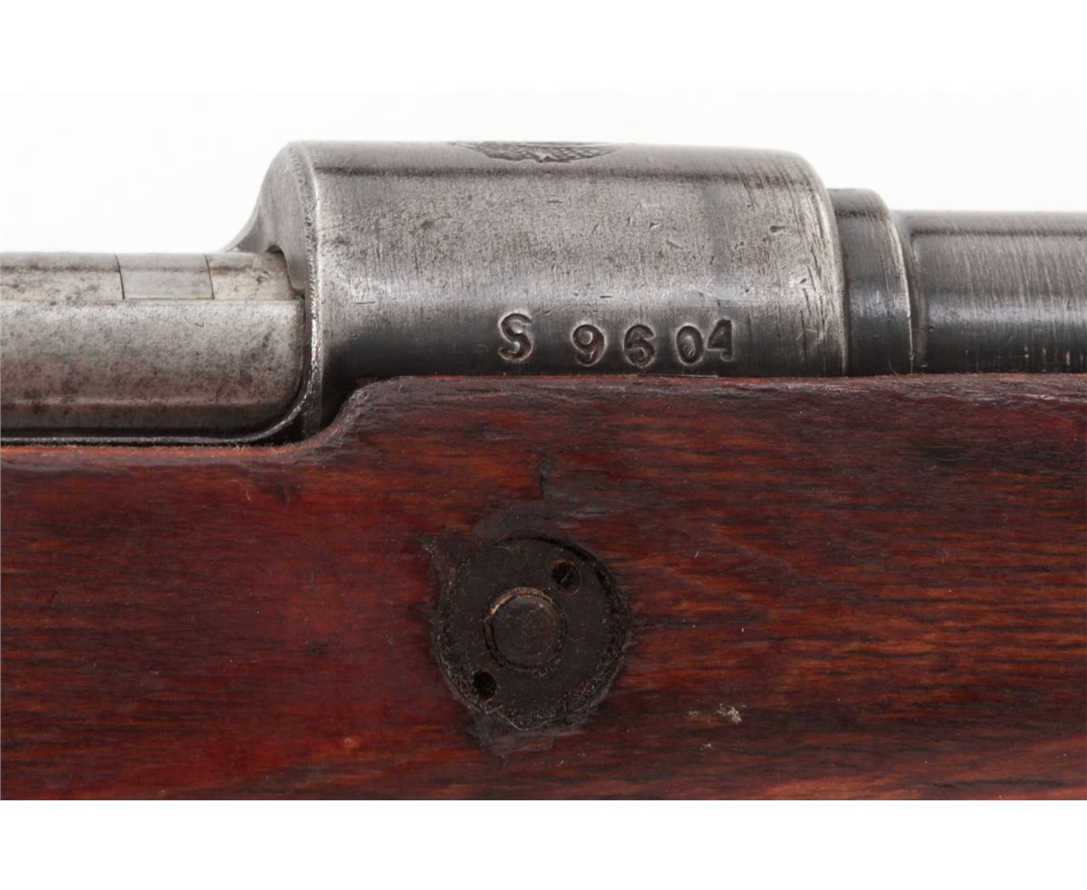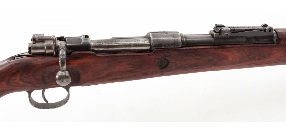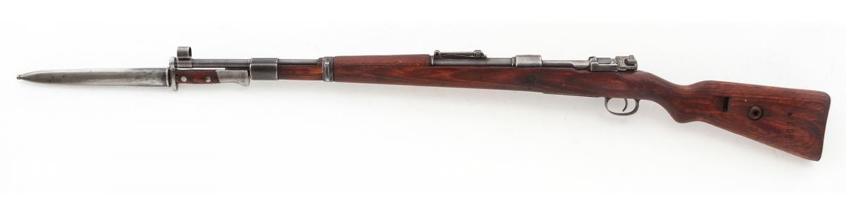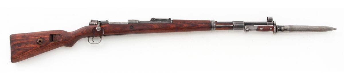 Yugoslavian M1948 98k Short Bolt Action Rifle, #S9604, 8mm, 24'' barrel, blue finish, laminated full-length stock with short handguard, with bayonet and scabbard. Yugoslavian crest over receiver ring, sight graduated to 2000 yards. Condition is very good to near fine retaining approx. 85% thinning blue. Stock with mostly light scuffs and oil darkening from old preservative. Good action, fine bore. Est.: $200-$400. (C&R)