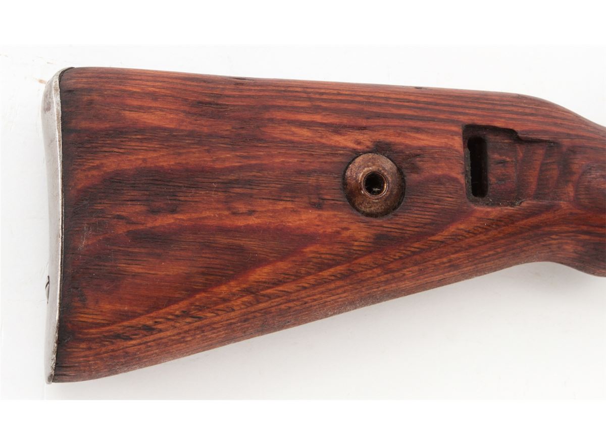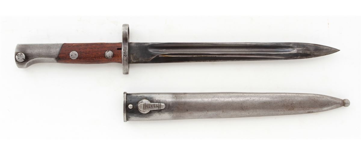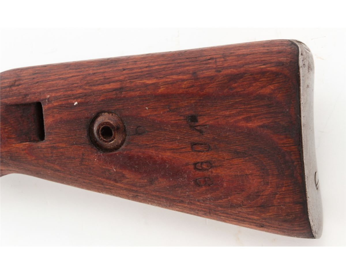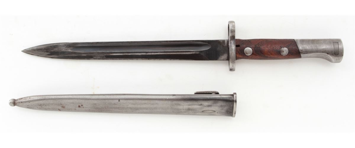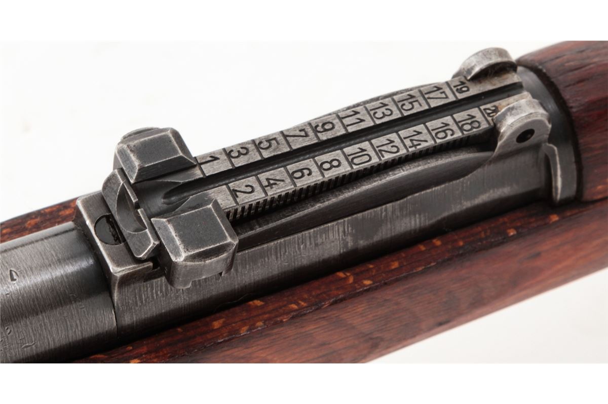 Yugoslavian M1948 98k Short Bolt Action Rifle, #S9604, 8mm, 24'' barrel, blue finish, laminated full-length stock with short handguard, with bayonet and scabbard. Yugoslavian crest over receiver ring, sight graduated to 2000 yards. Condition is very good to near fine retaining approx. 85% thinning blue. Stock with mostly light scuffs and oil darkening from old preservative. Good action, fine bore. Est.: $200-$400. (C&R)