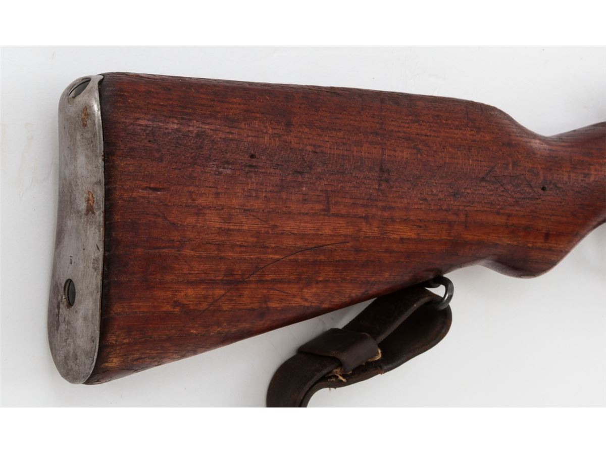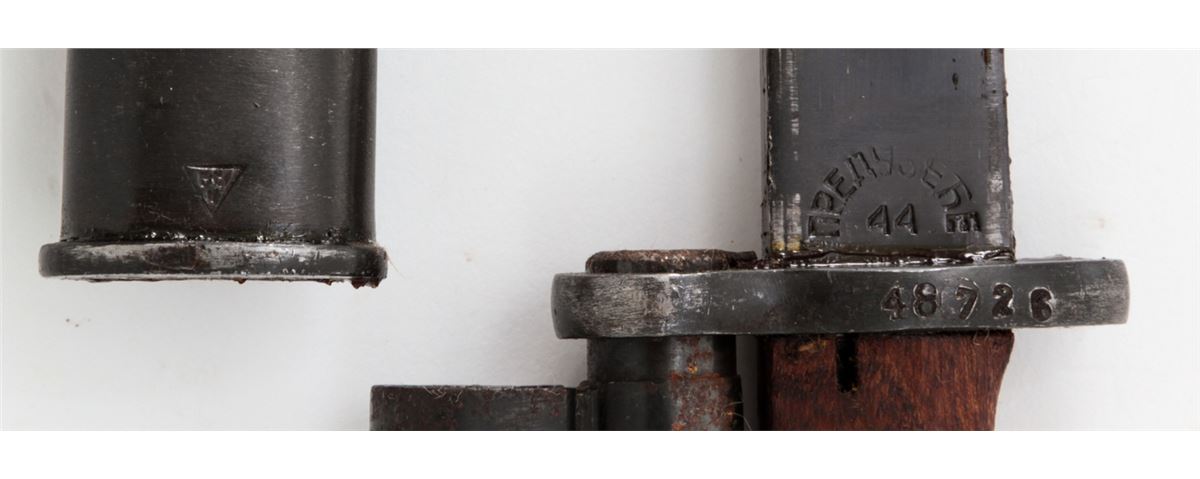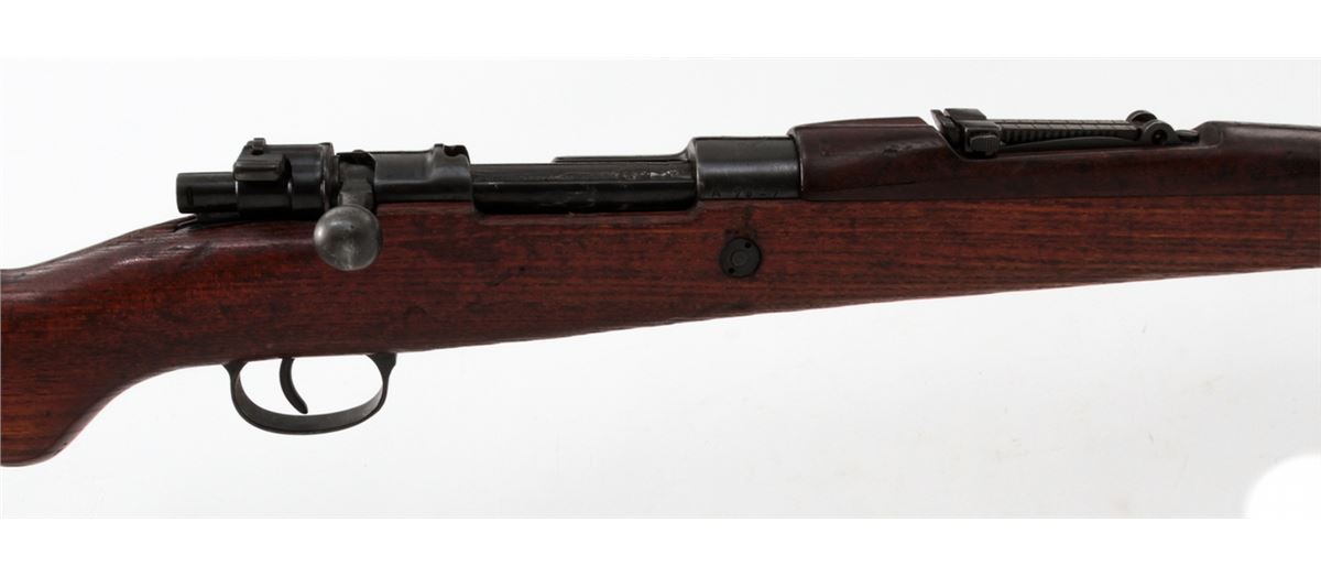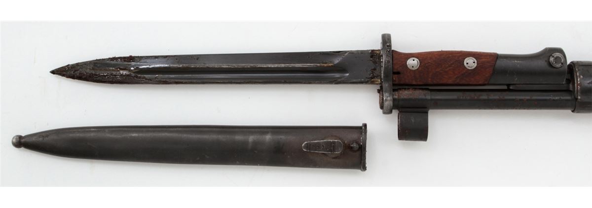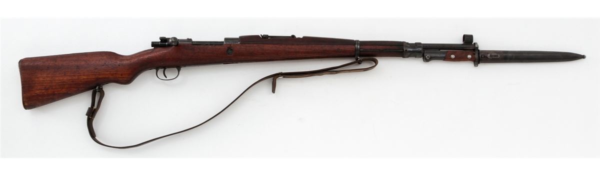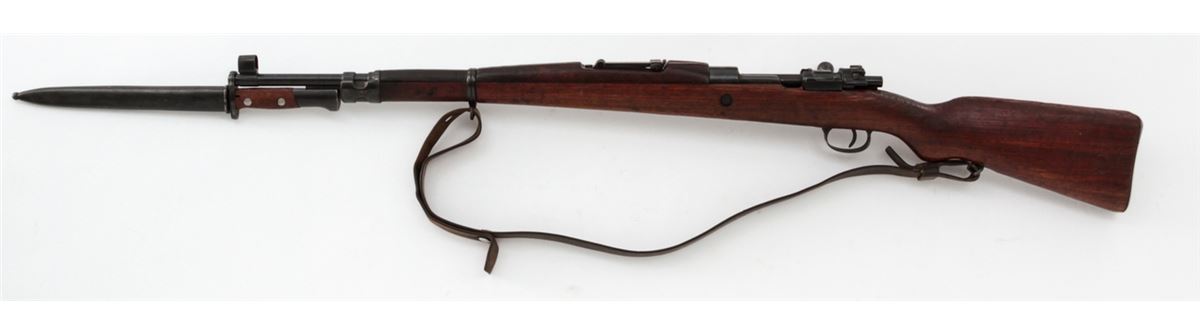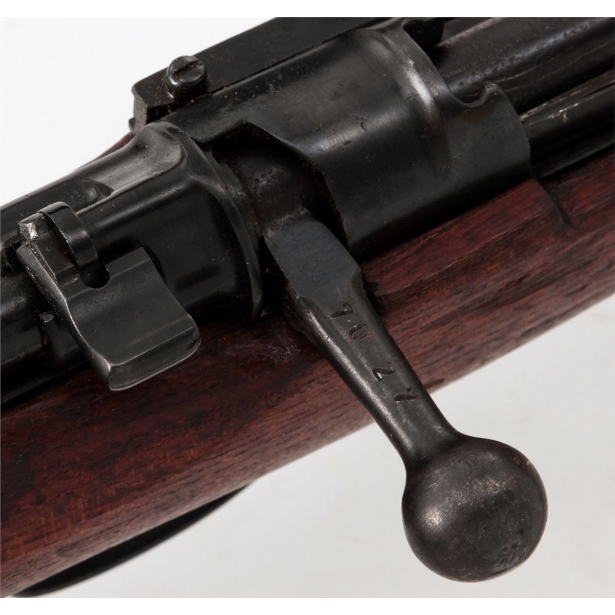 Yugo M24/47 Mauser Bolt Action Rifle, #A7027, 8mm, 24'' barrel, blue finish, elm stock and walnut forend, with bayonet and scabbard. Condition is very good to fine as arsenal refurbished, with matching stock and bolt, showing 92% arsenal blue over very light pitting; bolt has been blued over more moderate pitting. Stock with old preservative. Action is crisp, bore is fine. Importation marked. Est.: $200-$400. (C&R)
