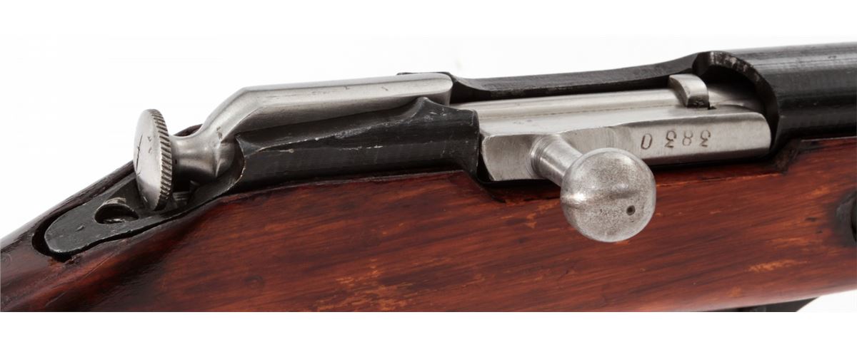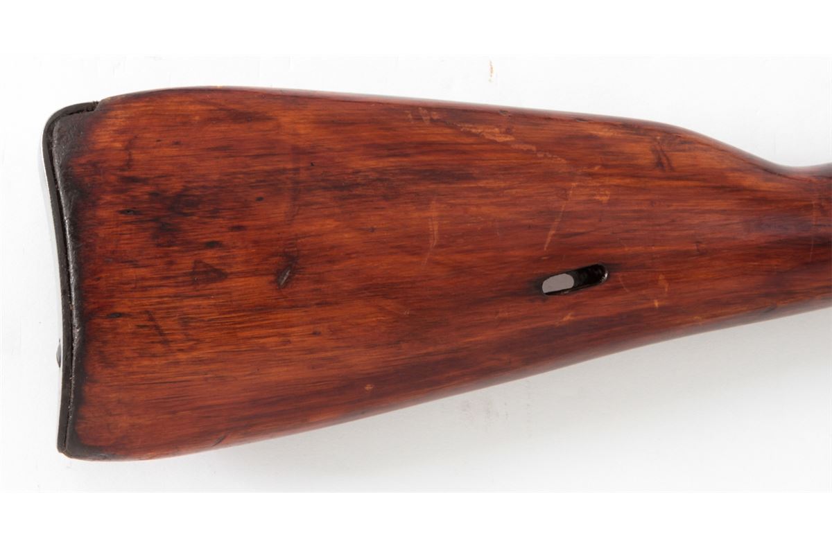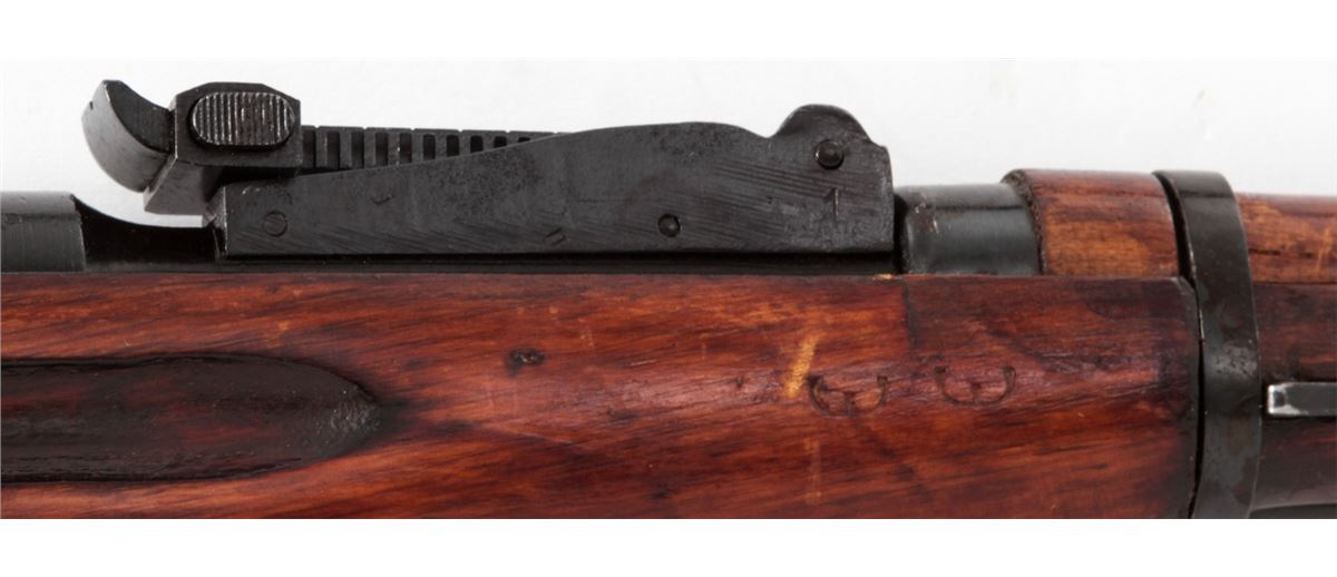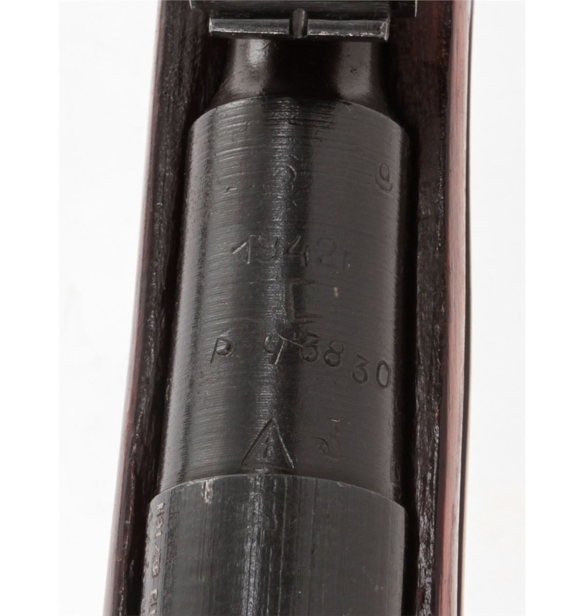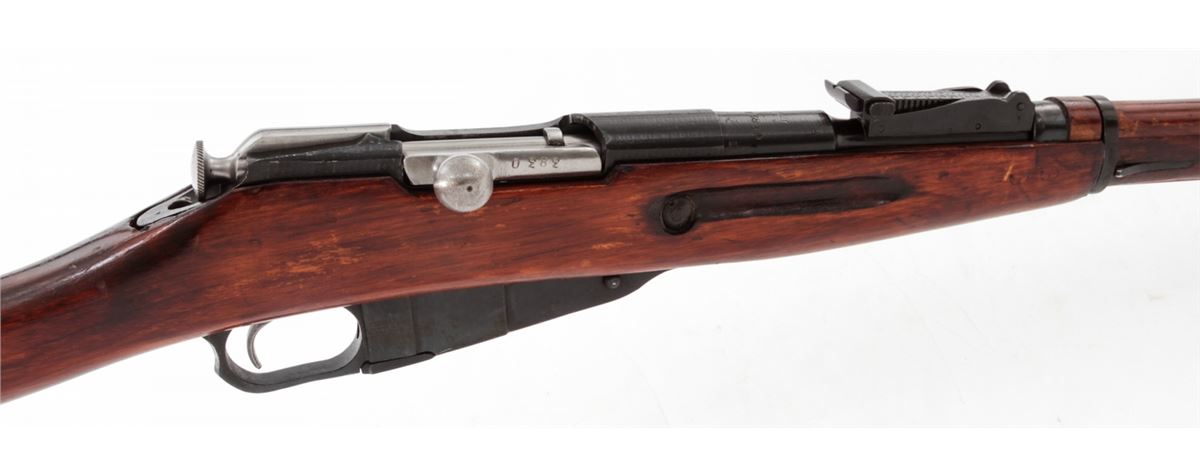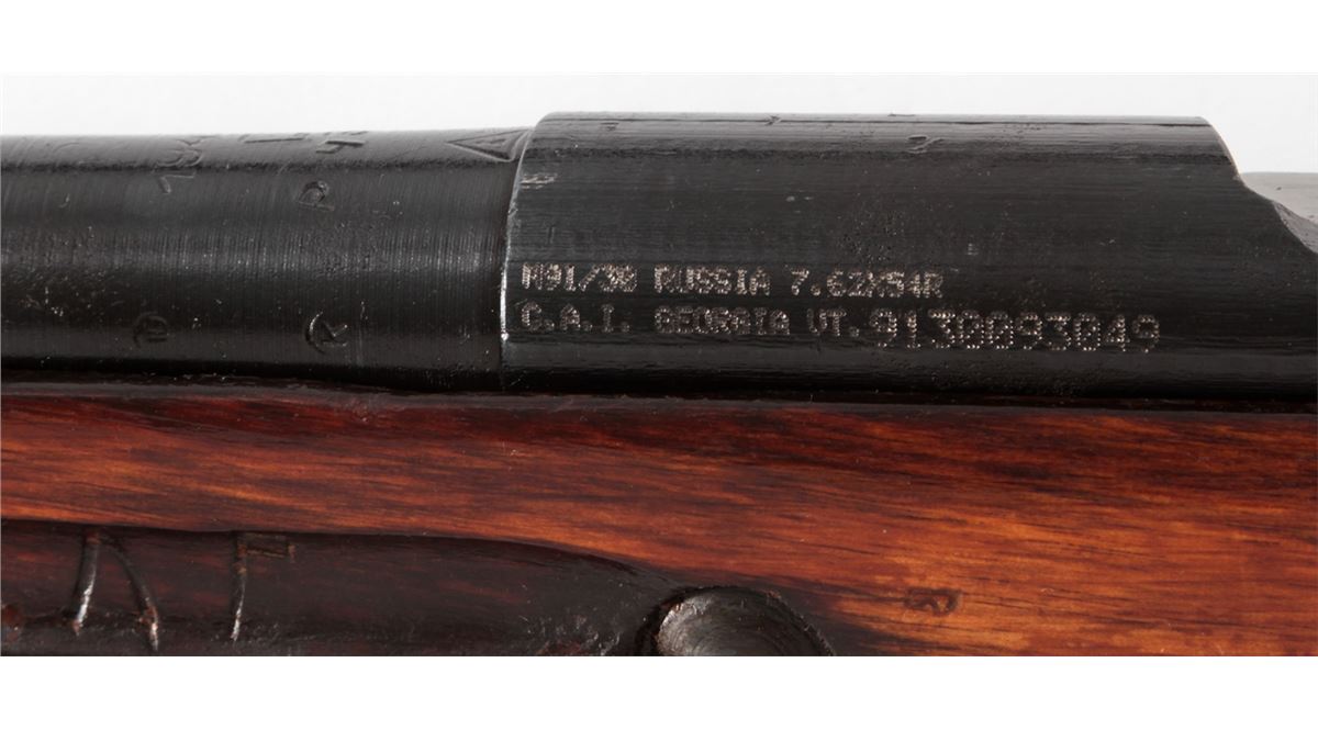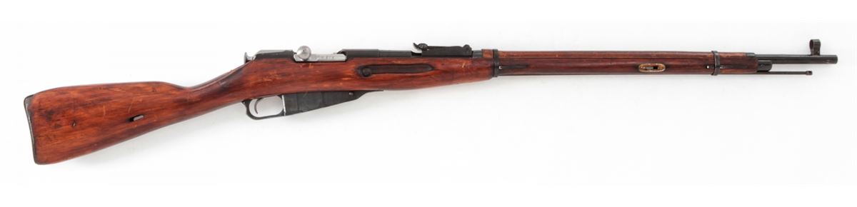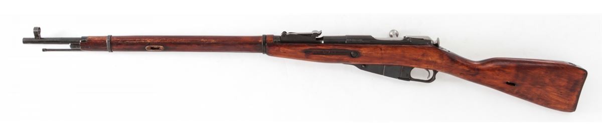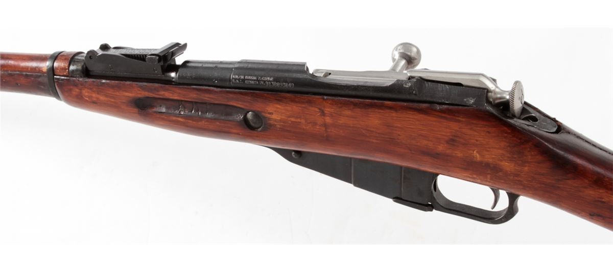 Mosin-Nagant M91/30 Bolt Action Rifle, #9130093049, 7.62x54R cal., 29'' barrel, blue finish, polished bolt, hardwood stock, with light importation marking to left side chamber area. Originally mfg'd in 1942, but arsenal rebuilt post-WWII. Condition is near excellent with light thinning to arsenal blue finish and minor scuffs to stock. Crisp action, bright bore. Est.: $200-$400. (C&R)