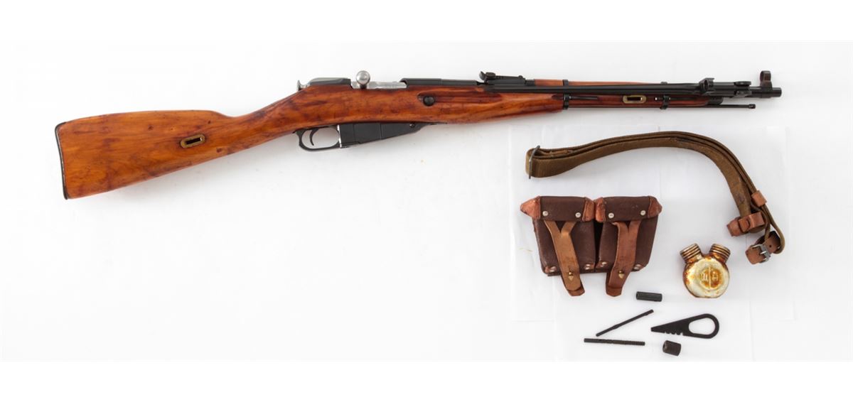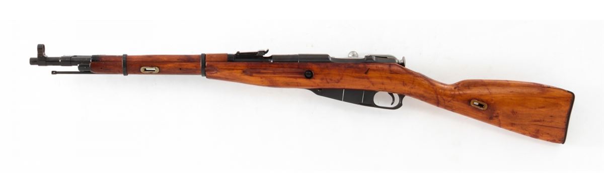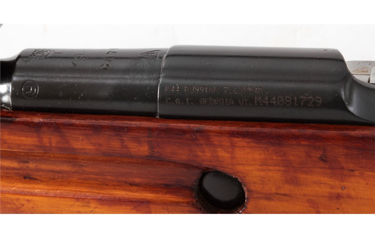 Mosin-Nagant Model 1944 Bolt Action Carbine, #M44081729, 7.62x54R cal., 20.5'' barrel, blue finish, hardwood stock, with sling and cleaning kit. Condition is excellent as imported in the early 1990s. Stock with scuffs to finish. Electric pencil matched bolt and some mixed parts. Action is crisp, bore is good. Lightly import marked. Est.: $200-$300. (C&R)