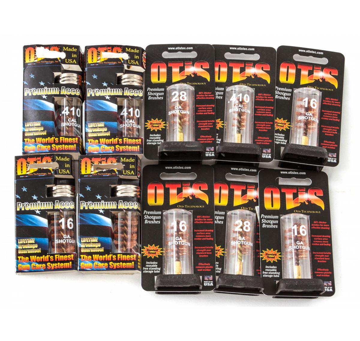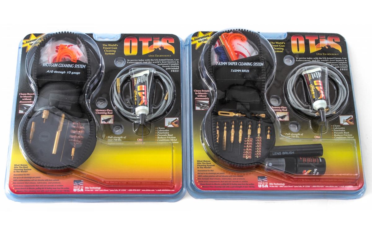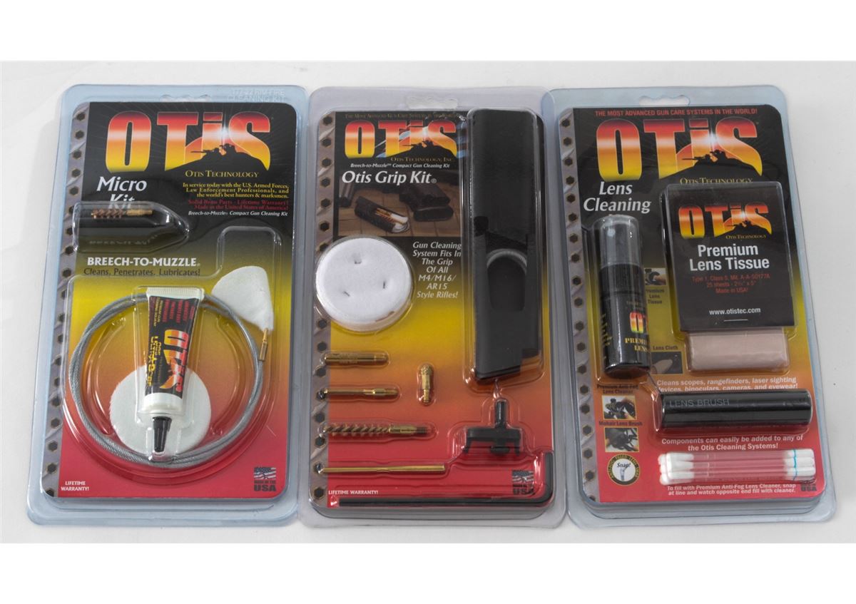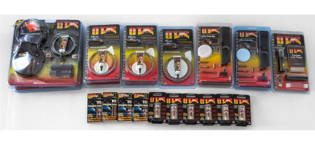Lot of Otis Cleaning Products: Four ($) Micro Cleaning Kits, for .30-.45 cal., & .177-.22 RF; Two (2) 7.62mm Sniper Cleaning Systems; four (4) Grip Kits; Lens Cleaning Kit; and ten (10) Preium Shotgun Brushes, for .410, 16 & 28 ga. Retails @ over $500/lot. Est.: $250-$350/lot. (Field Time)