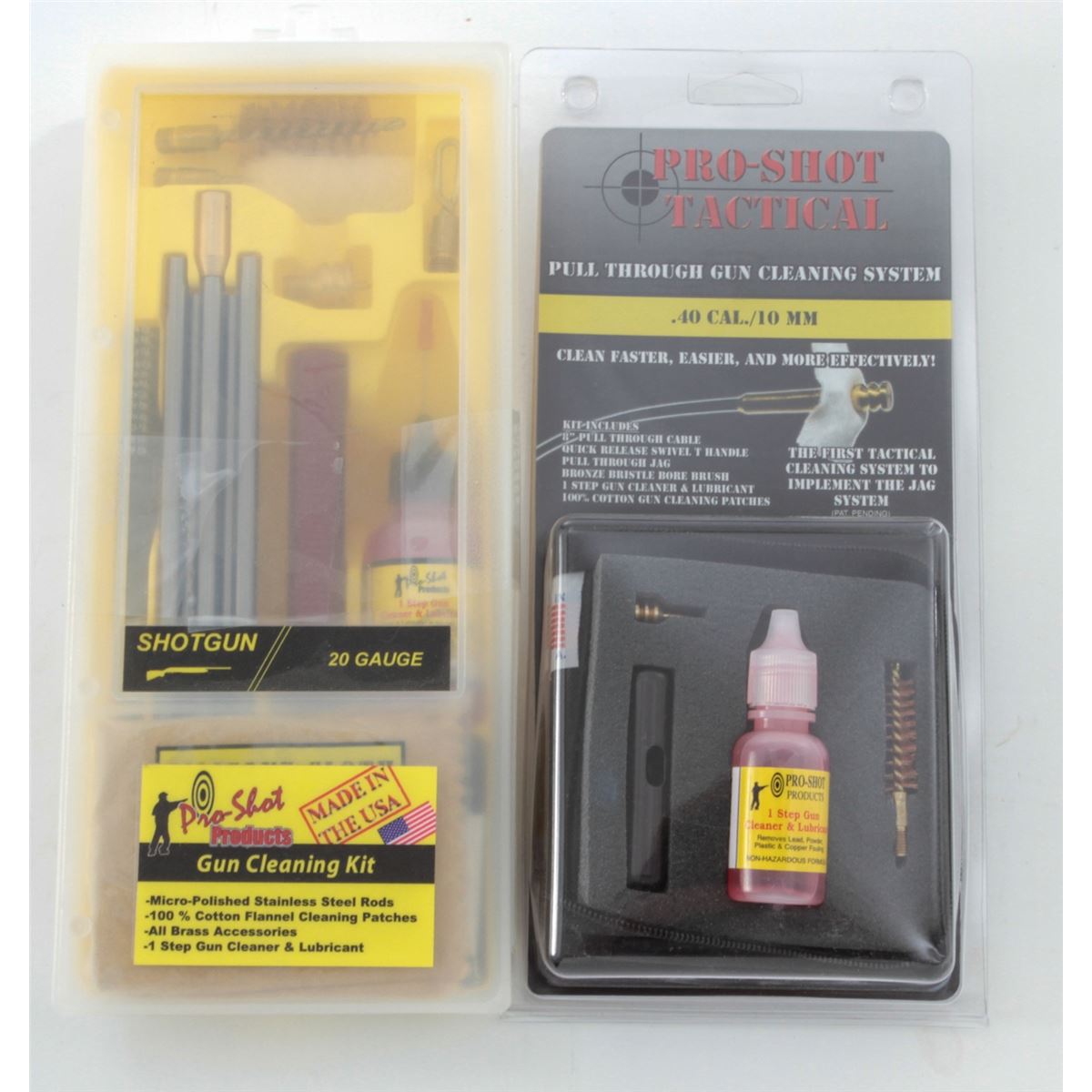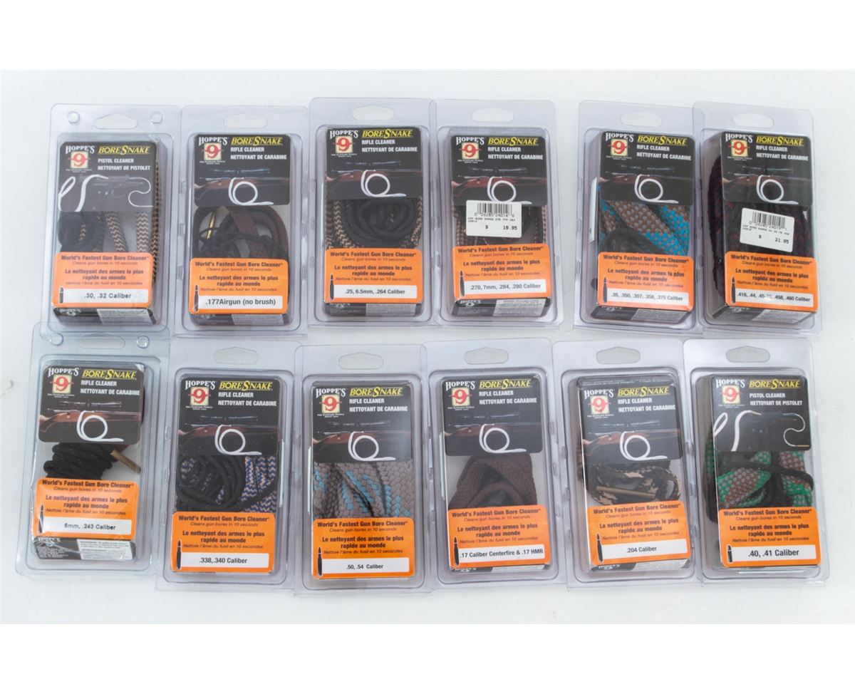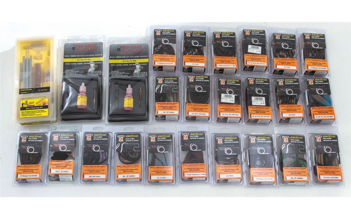 Dealer's Lot of Gun Cleaning Systems, including two (2) Pro-Shot Tactical Kits, both for .40 cal./10mm; Pro-Shot Gun Cleaning Kit for 20 ga.; and twenty (20) Hoppe's BoreShankes, for .30/.32 cal., .204 cal., .338/.340 cal., .25/6.5mm/.264 cal., .177 airgun, .50 /.54 cal., .17 cal. CF/.17 HMR, .416/.44/.45-70/.458/460 cal. Twenty-three (23) pieces, all brand new in their original packaging, retailing @ over $550/lot. Est.: $300-$400/lot. (Field Time)