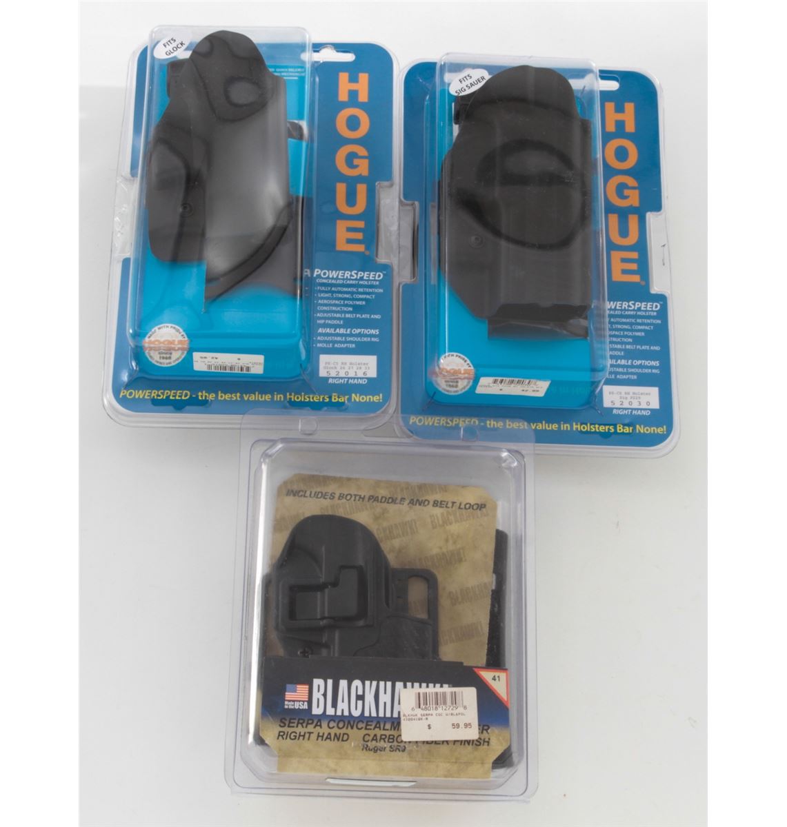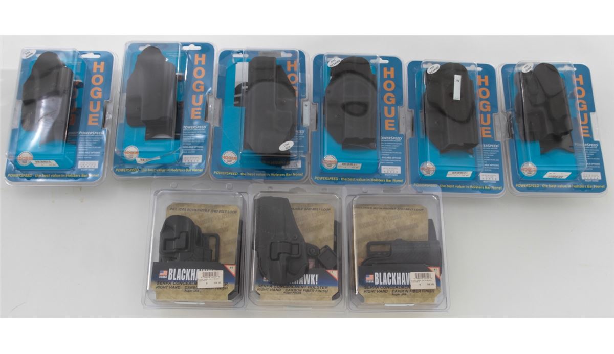 Lot of Six (6) Hogue PowerSpeed Concealed Carry Holsters, for Sig P229, Glock 26-27-28-33-39, and 1911; along with three (3) Blackhawk Serpa Concealment Holsters, for Ruger P85/89 and Ruger SR9. Nine (9) pieces, all brand new in original packaging. Retails @ over $425/lot. Est.: $200-$300/lot. (Field Time)