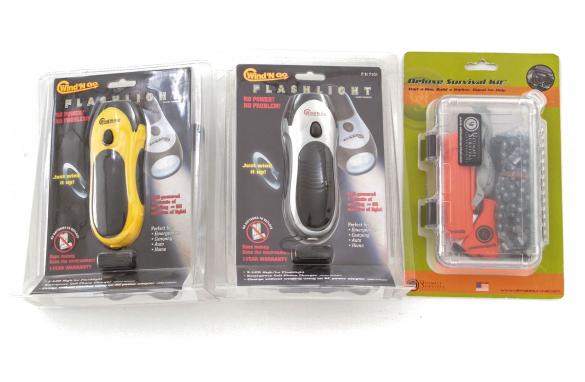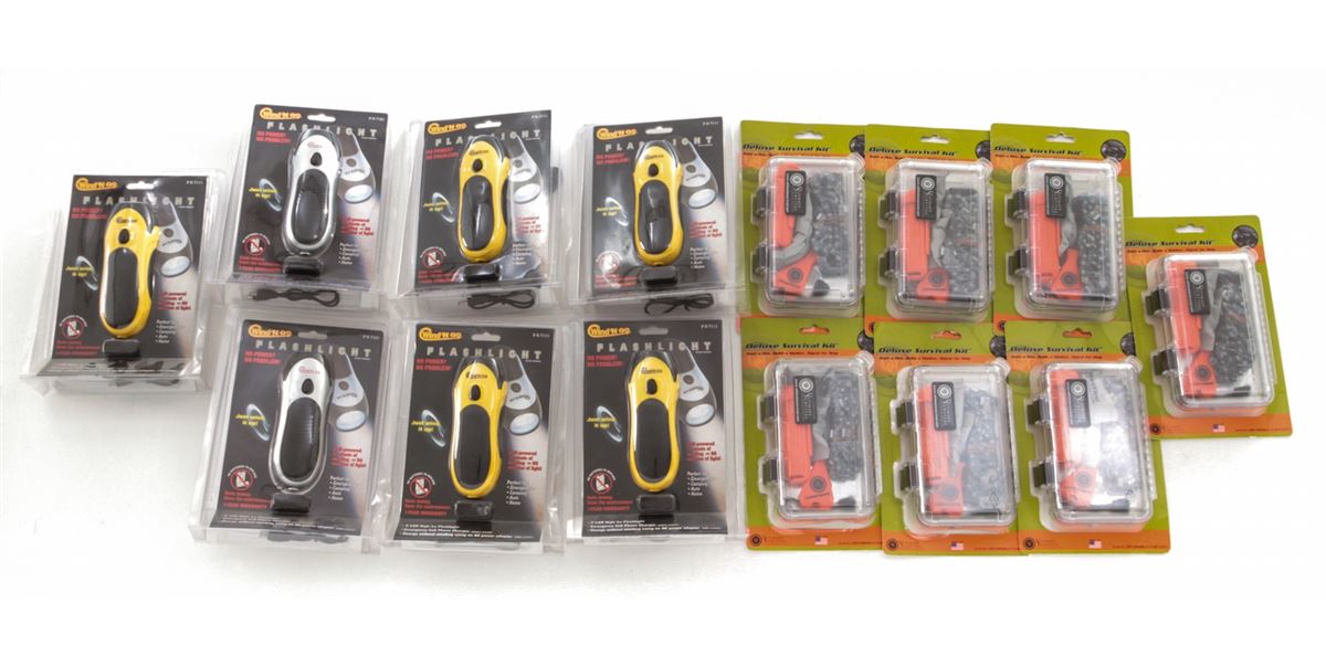 Lot of Seven (7) Ultimate Survival Technologies Deluxe Survival Kit, used to start a fire, build a shelter, or signal for help. Along with seven (7) Wind'N Go Self-Powered Flashlights, with emergency cell phone charger, no batteries needed. All brand new in original packaging. Retails @ $575./lot. Est.: $250-$350/lot. (Field Time)