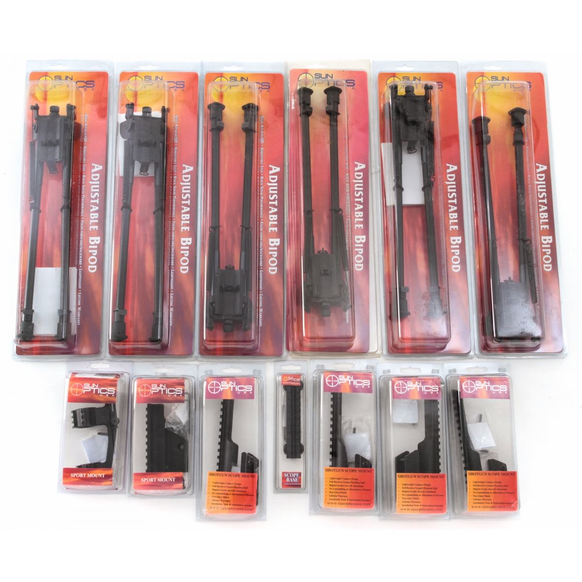 Lot of Six (6) Sun Optics Adjustable Bipods, four (4) Sun Optics Shotgun Mounts for Rem. 870/1100/1187, two (2) Sport Mounts, one for Springfield M1A/M14; and one Sun Optics Scope Base for Ruger. Retails @ over $550/lot. Est.: $300-$400/lot. (Field Time)
