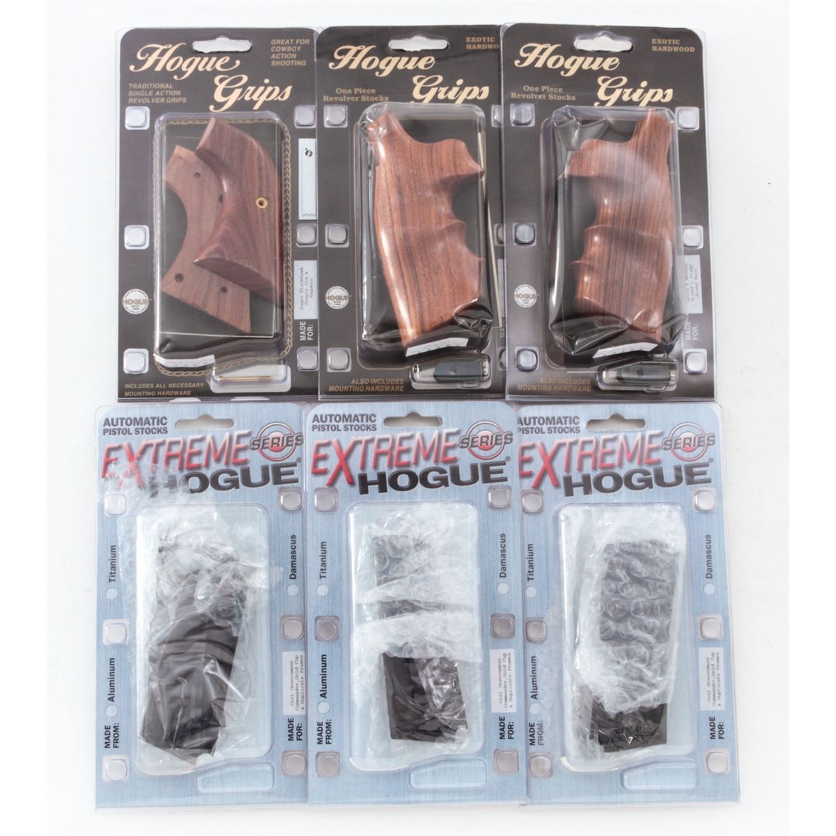 Lot of Six (6) Hogue Grips: Two (2) exotic wood revolver stocks for S&W K- & L-Frames; one one-piece revolver stocks; and three (3) Extreme Series Automatic pistol stocks for Colt Gov't Commander and duplicate frames; and one pair for Ruger Blackhawk, Single Six & Vaquero. All brand new in original packaging. Retails @ $500/lot. Est.: $300-$400/lot. (Field Time)