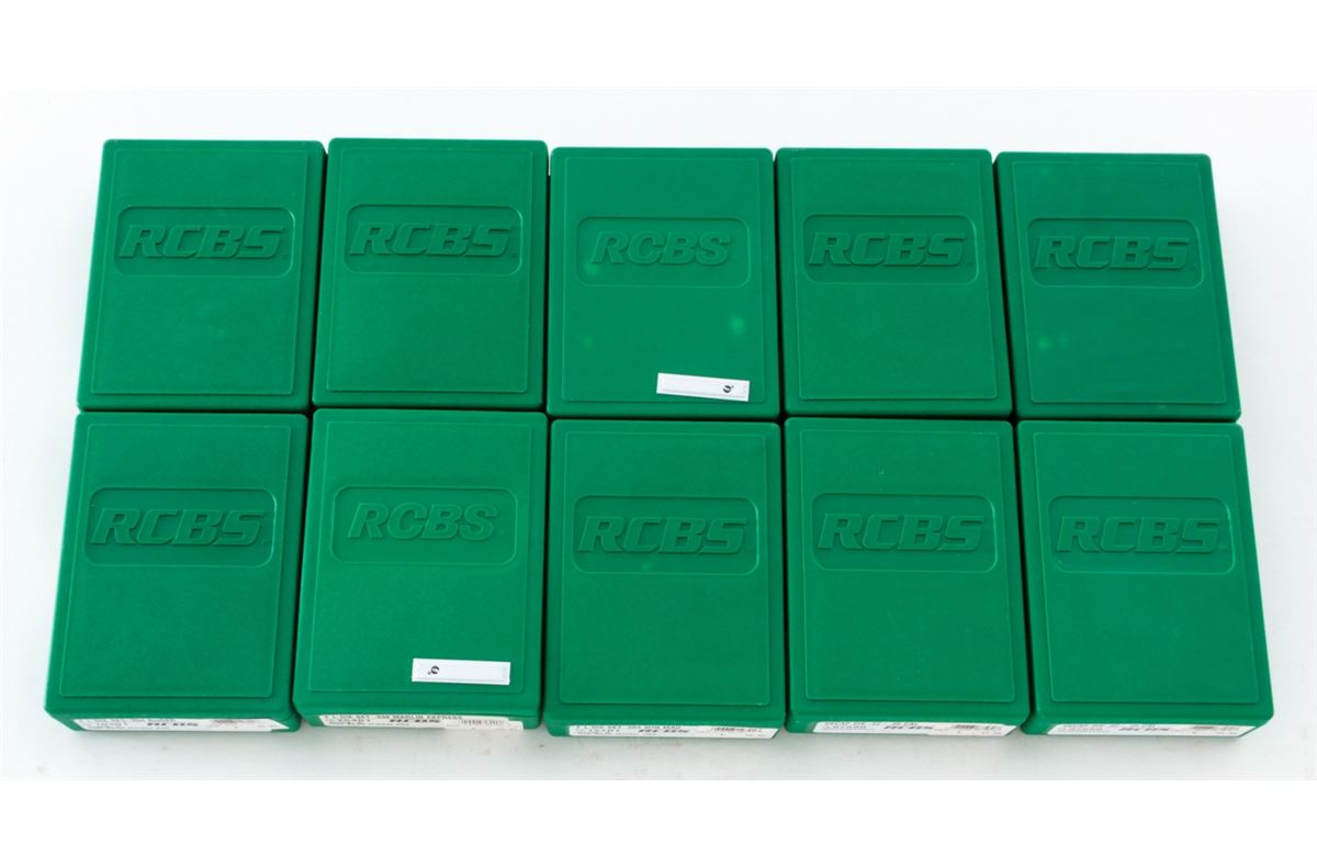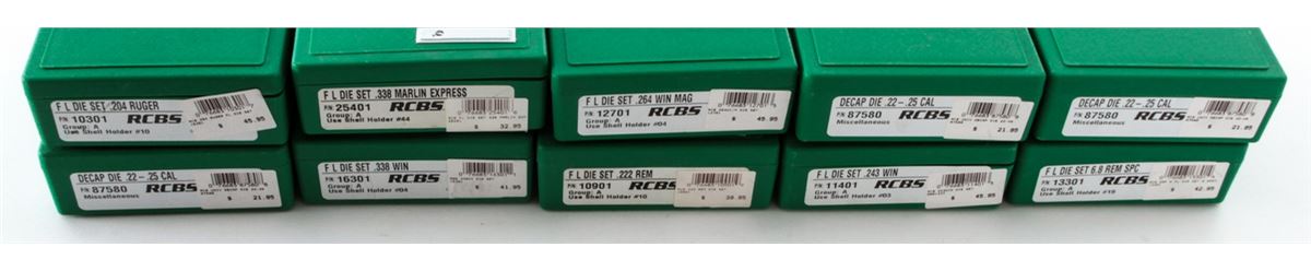 Lot of Ten (10) RCBS Reloading Die Sets, for .222 Rem.; .338 Win.; .22-.25 cal.; 6.8 Rem. Spc.; .264 Win. mag.; .243 Win.; .204 Ruger; and .338 Marlin Express. All brand new in original boxes with instructions. Retails @ $365/lot. Est,: $200-$300/lot. (Field Time)