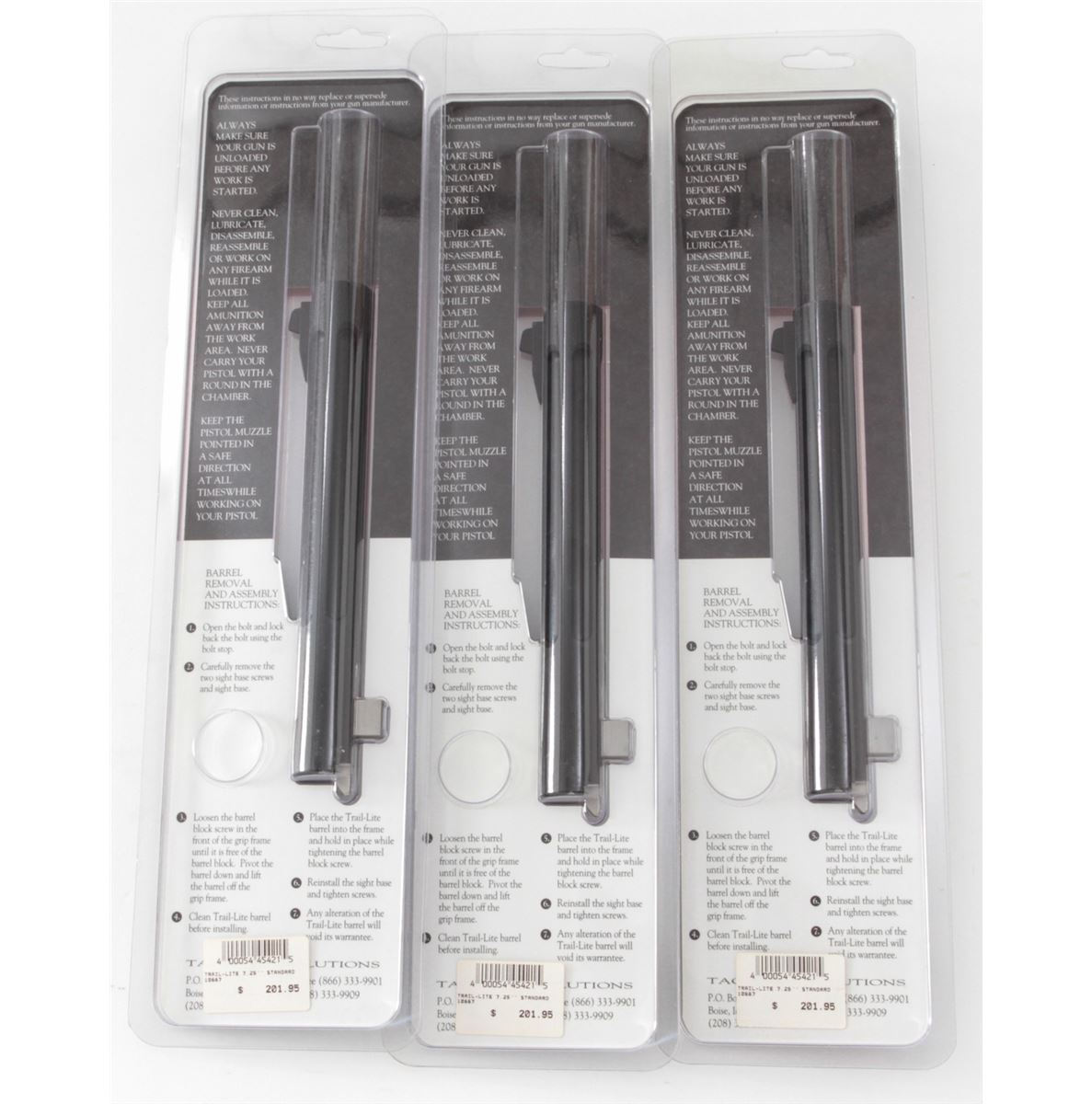Lot of Three (3) Tactical Solutions Trail-Lite .22 LR Barrels for the Browning Buckmark, .900 dia., ultra-lightweight. All brand new in original packaging. Retails @ $600/lot. Est.: $300-$500/lot. (Field Time)