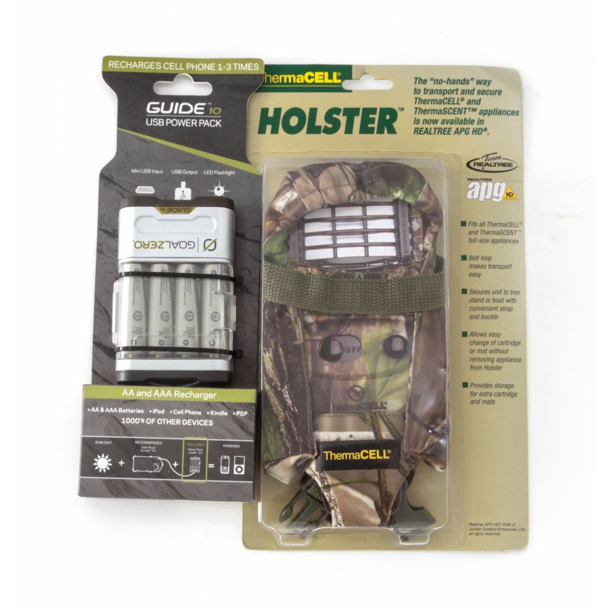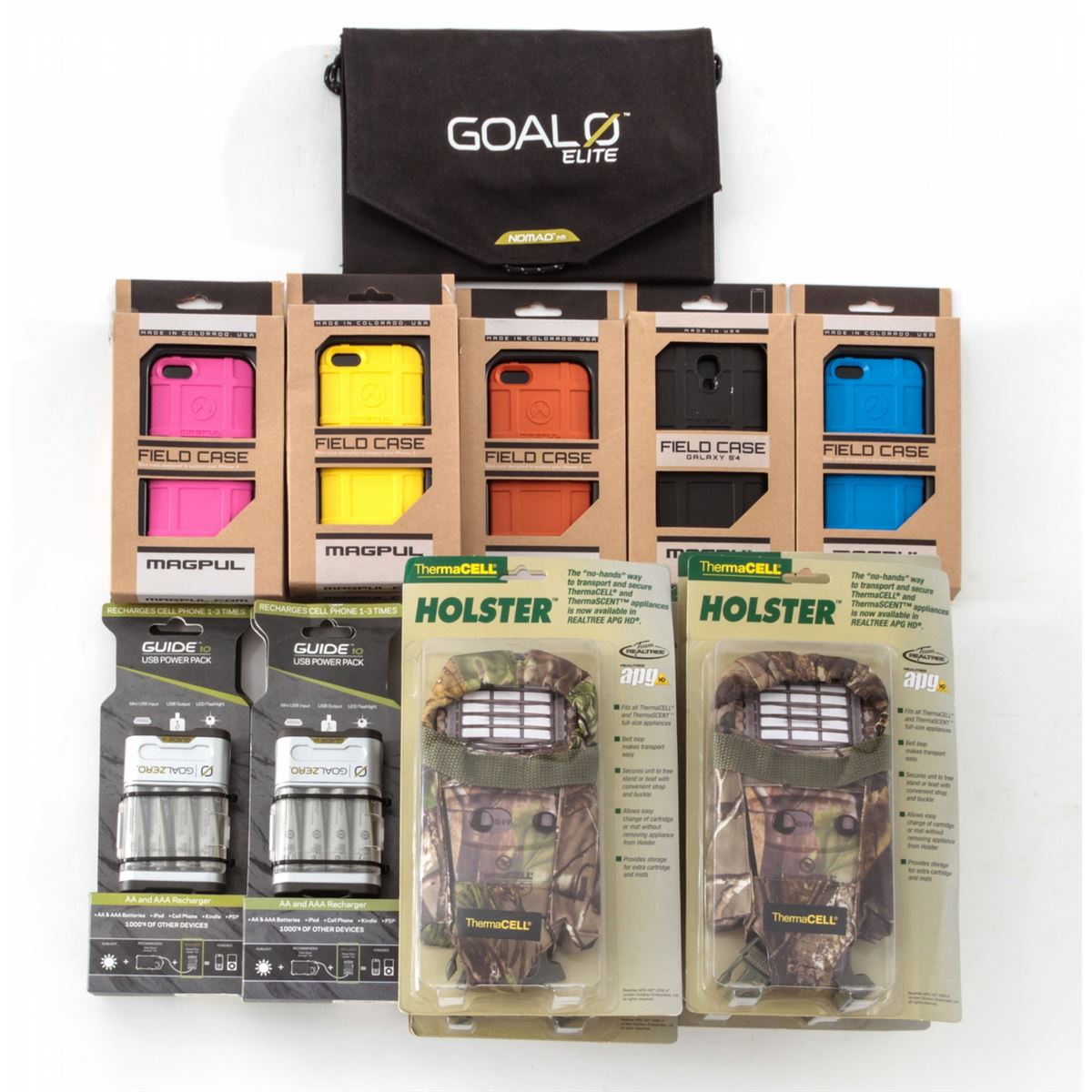 Dealer's Lot of ThermaCell Holsters, Battery Chargers, Solar Panel and Field Cases: Ten (10) ThermaCell camouflage holsters for mosquito repellent and scent dispenser appliances; five (5) GoalZero AA and AAA Recharger Packs; seven (7) Magpul IPhone cases; and one (1) Nomad Foldable Solar Panel. All brand new in original packaging. Retails @ $450/lot. Est.: $250-$350/lot. (Field Time)