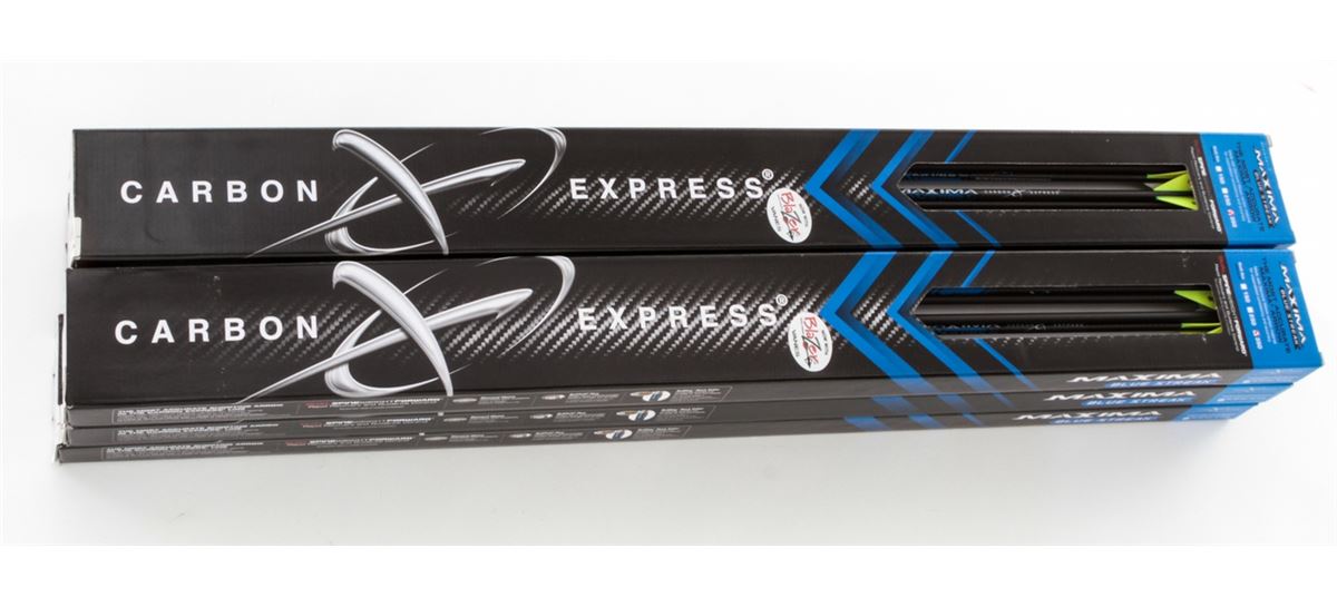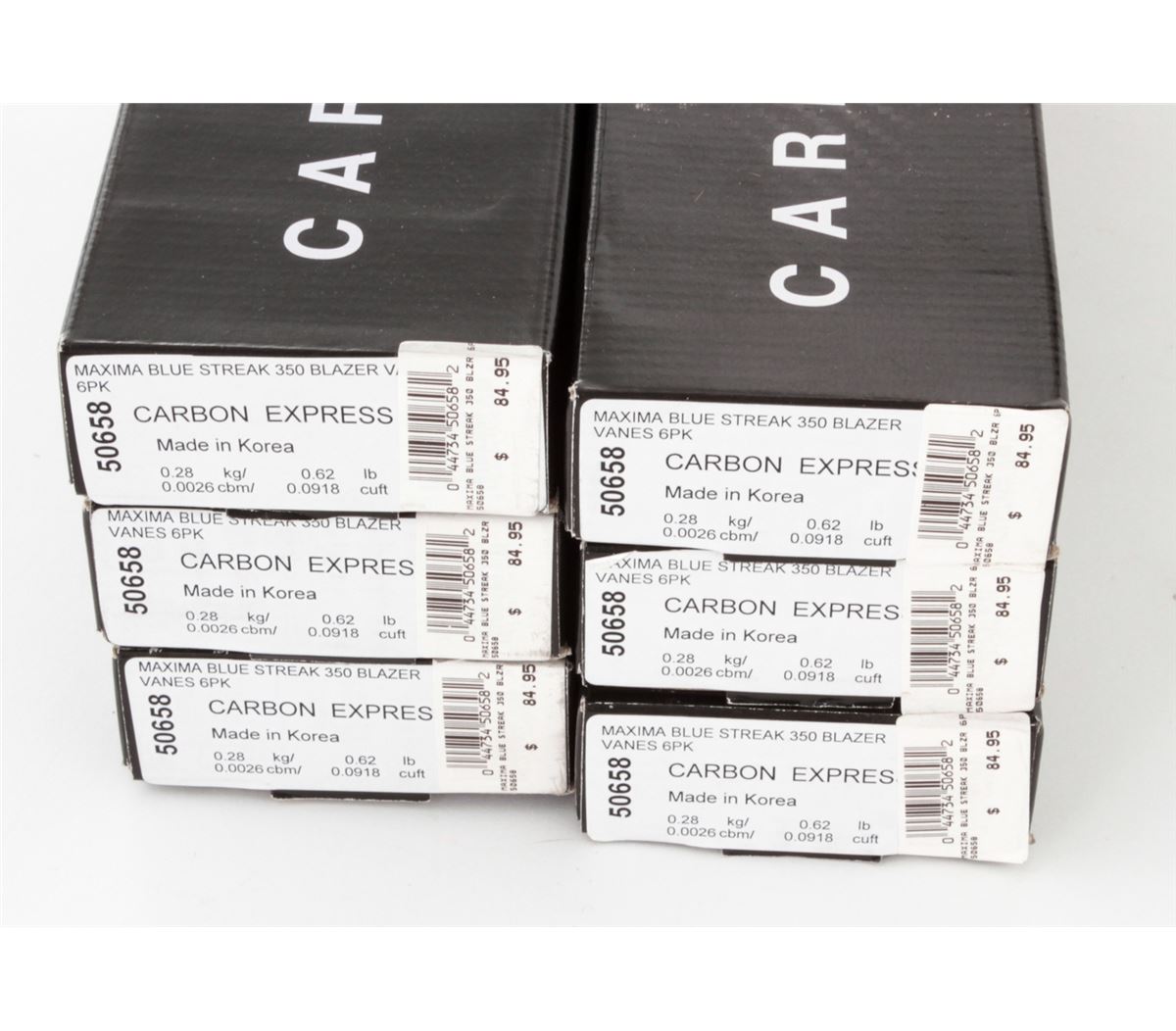 Archery: Six (6) Boxes of Maxima Blue Streak Carbon Express Arrows, each box containing six 350 Blazer vane arrows. All brand new in original boxes. Retails @ $500/lot. Est.: $250-$300/lot. (Field Time)