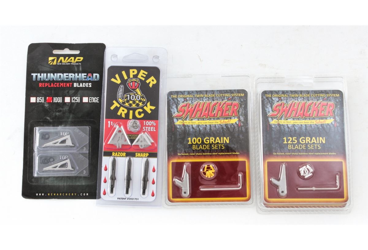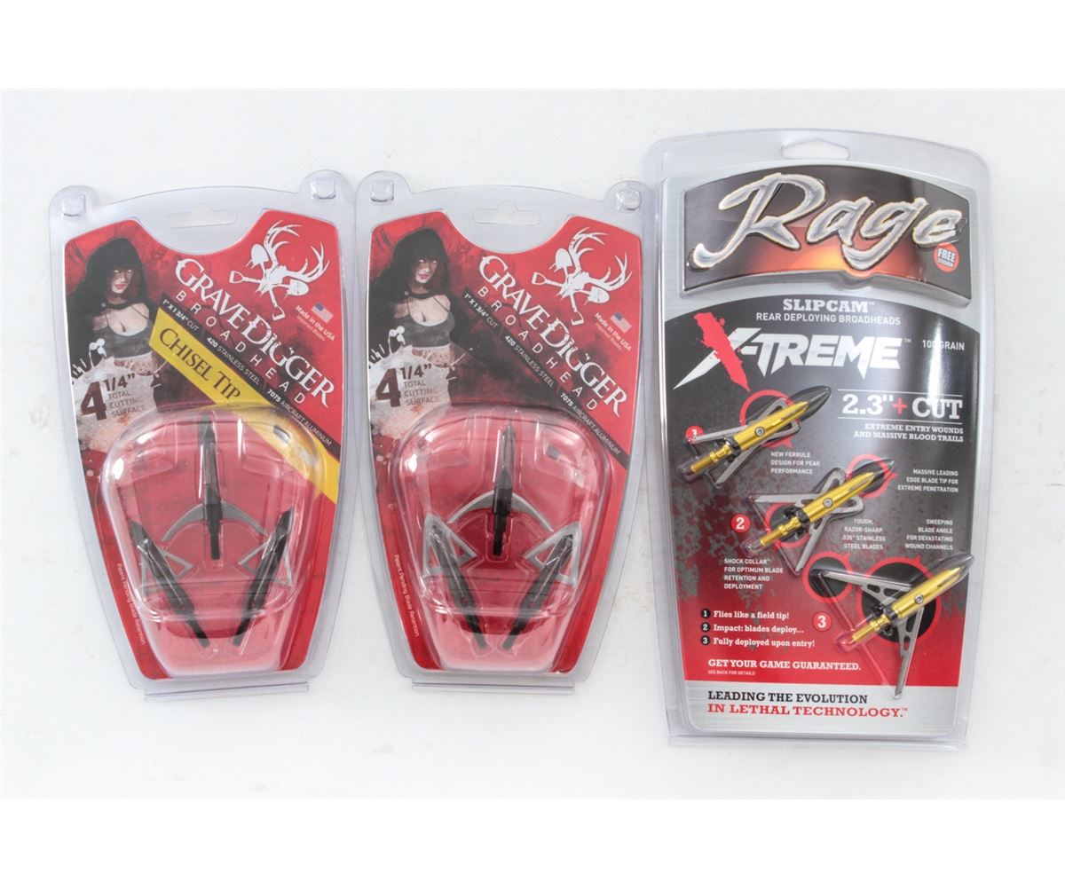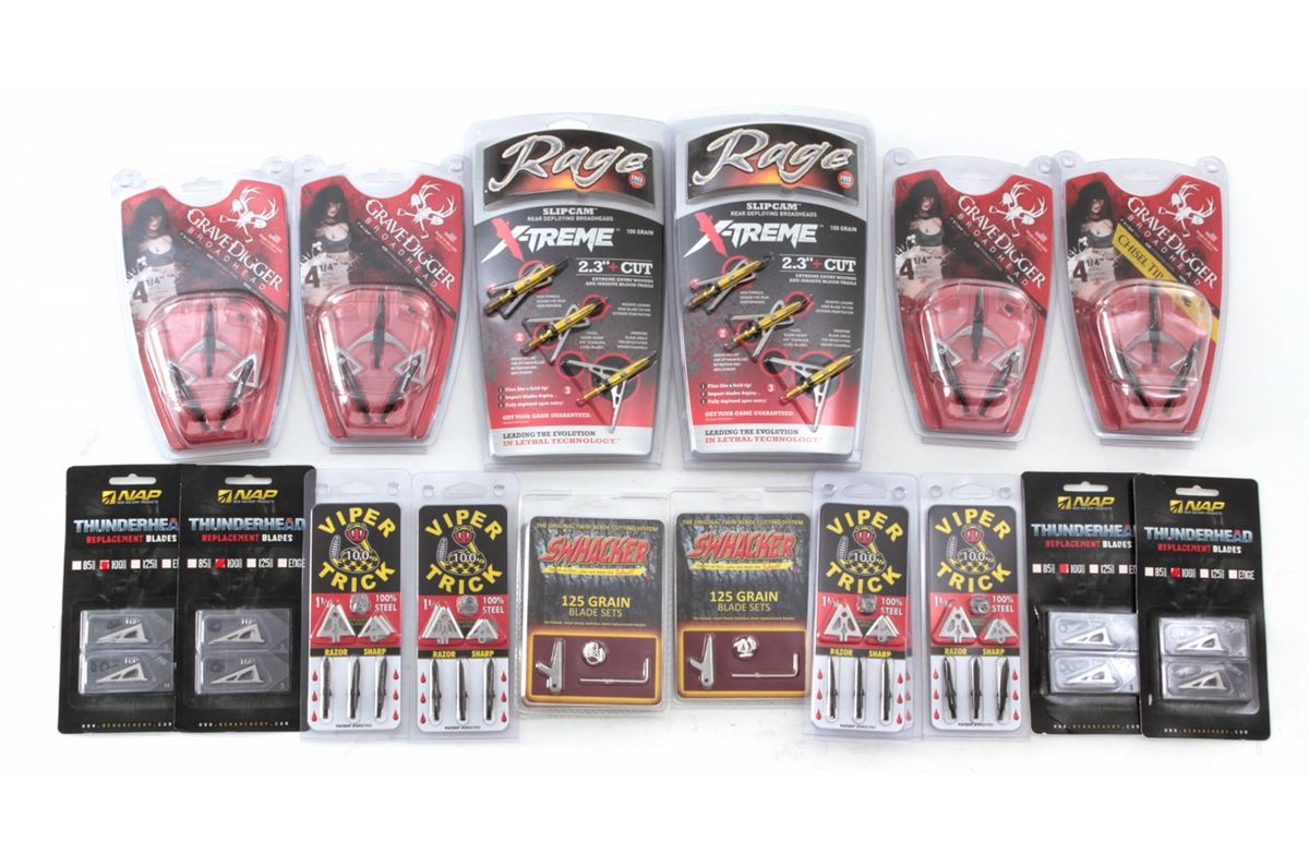 Archery: Lot of three (3) Rage Extreme 2.3''+ Cut Broadheads packages; four (4) packages GraveDigger Broadheads; five (5) packages Viper Trick broadheads; four (4) packages NAP Thunderhead Replacement Blades; three (3) packages Swhacker Blade Sets, 125 grain and 100 grain. All brand new. Retails @ $450/lot. Est.: $250-$350/lot. (Field Time)