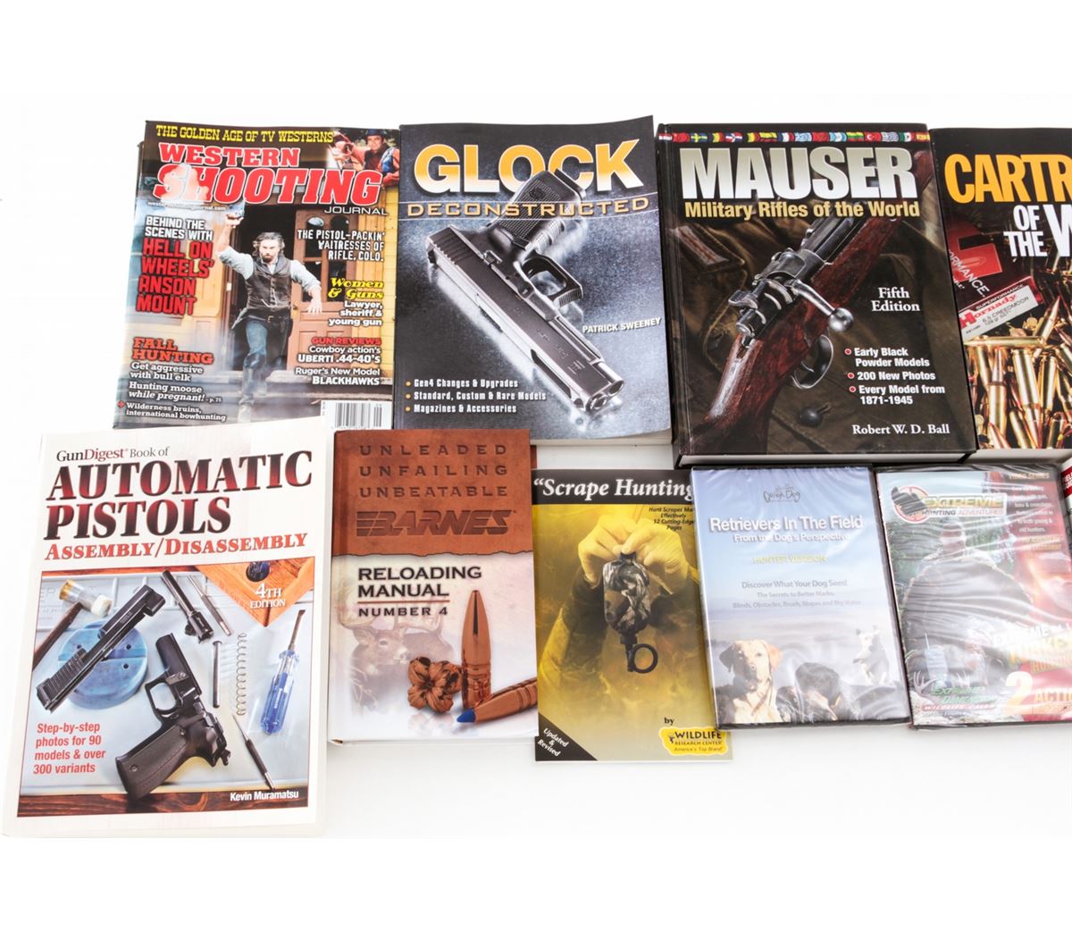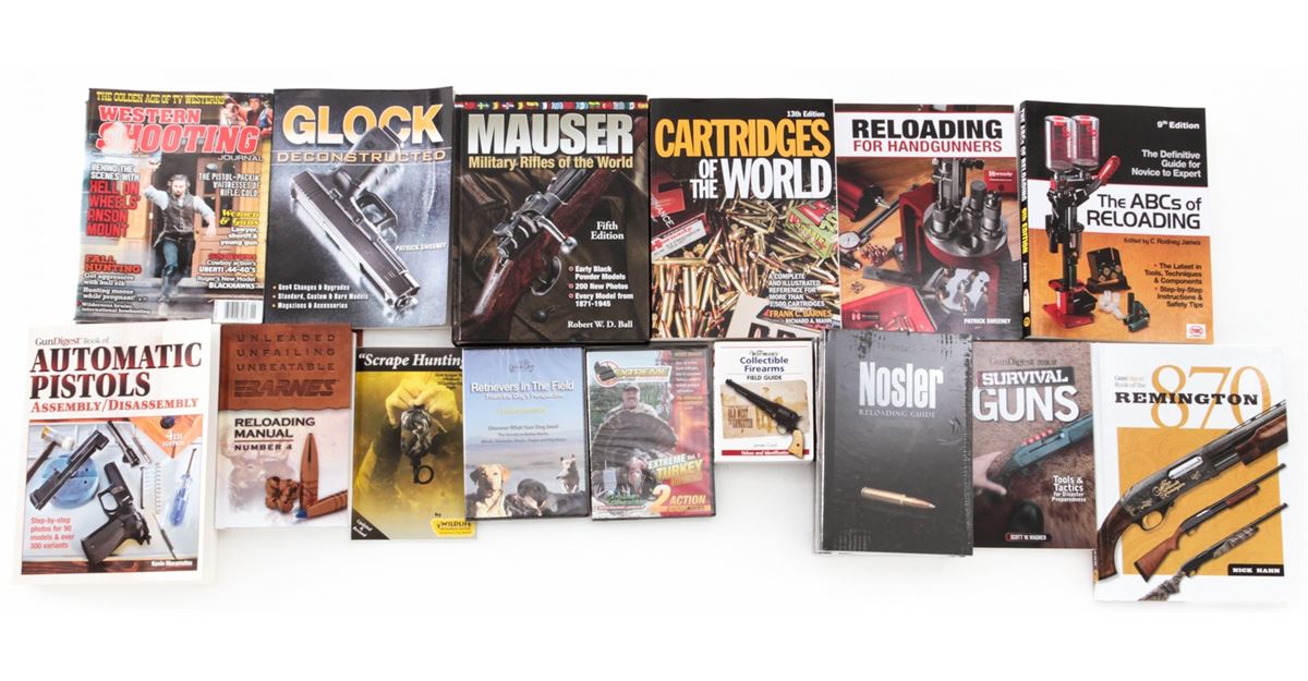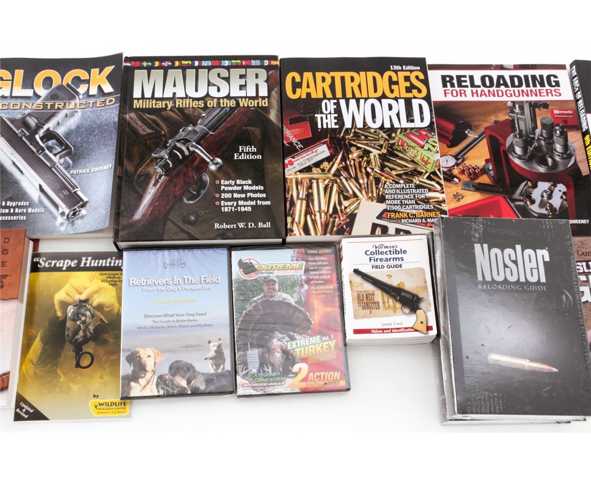 Lot of Twelve (12)+ Firearm and Reloading Books: ''Gun Digest Book of Automatic Pistols''; ''Glock Deconstructed''; Warman's ''Collectible Firearms, Field Guide'';''Gun Digest Book of the Remington 870''; ''Gun Digest Book of Survival Guns''; two (2) ''Nosler Reloading Guide''; ''The ABCs of Reloading''; ''Barnes Reloading Manual''; ''Reloading for Handgunners''; ''Cartridges of the World''; Western Shooting Journals, along with two (2) DVDs on Turdy hunting and Retrievers. All brand new. Est.: $200-$300/lot. (Field Time)