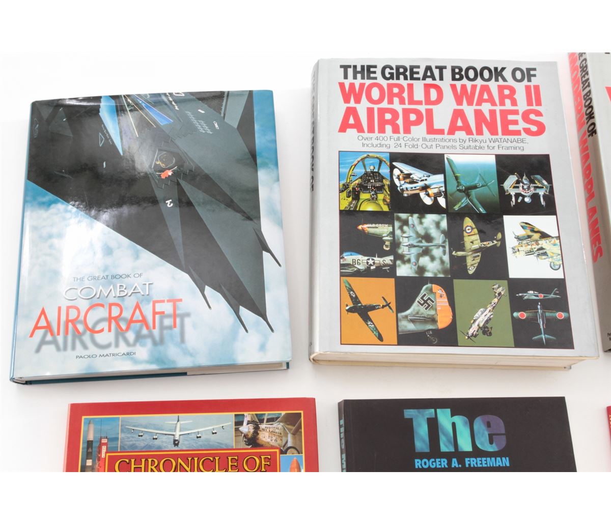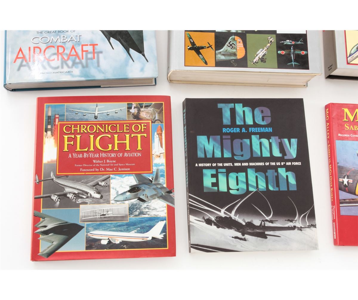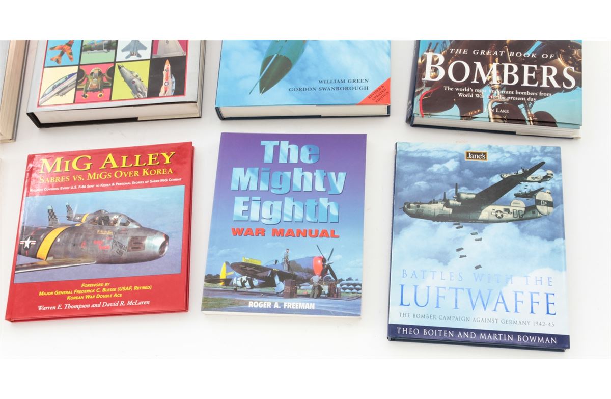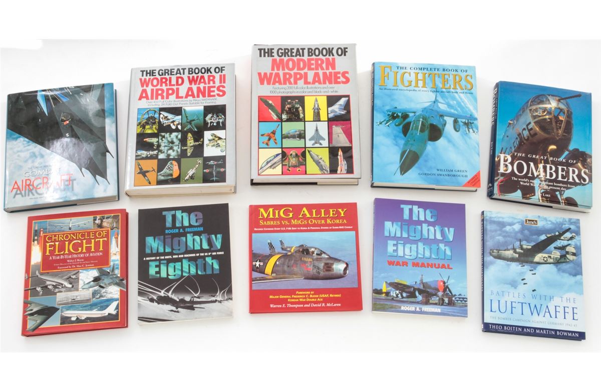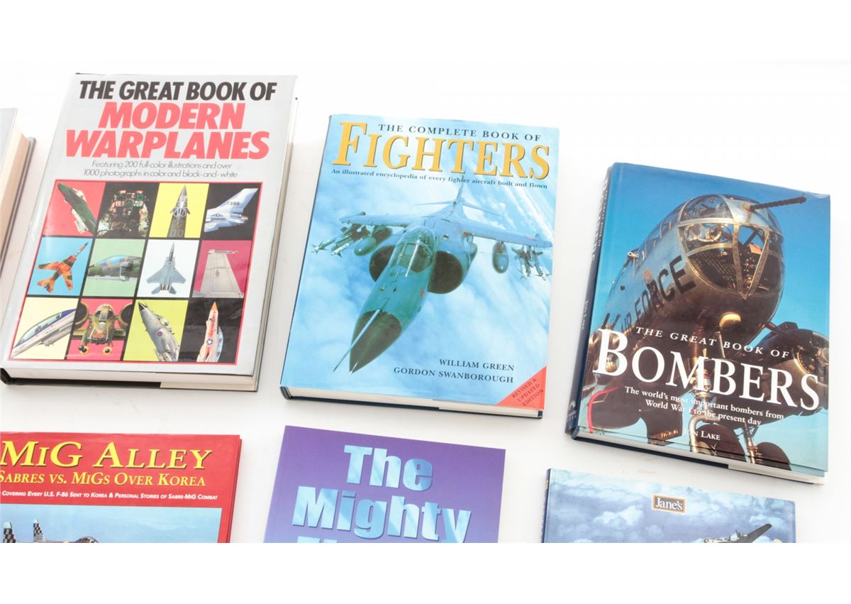 Lot of Ten (10) Hardbound Books on Aviation Warfare, including ''The Great Book of World War II Airplanes''; ''The Great Book of Bombers'', by Jon Lake; ''The Complete Book of Fighters'', by Green & Swanborough; ''The Great Book of Combat Aircraft'', by Paolo Matricardi, etc. All are in excellent condition, most with dustcovers. Est.: $150-$250/lot.