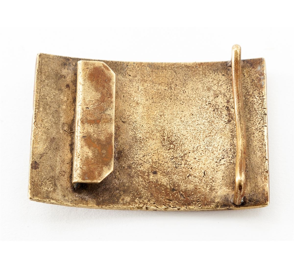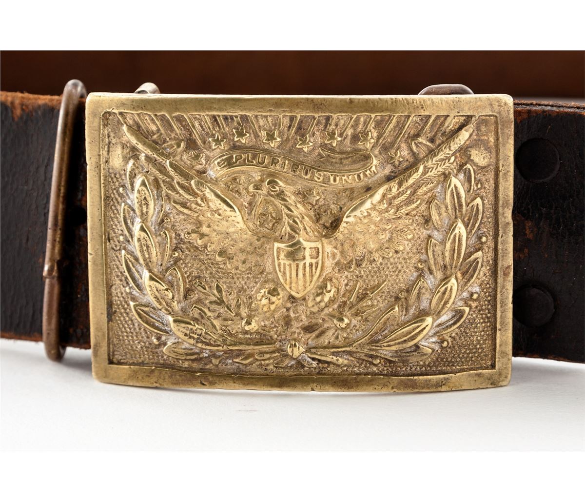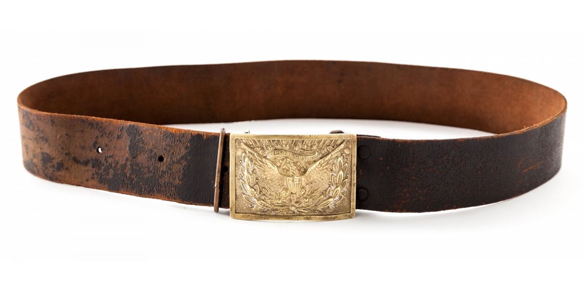 Indian War Period Eagle Belt Plate and Black Leather Belt, standard type brass eagle officer's belt plate measures 2.10''x3.20'', and used by U.S. Forces from 1851-1874. Condition is fine showing light thinning to detail at highpoints. Approx. 20% silver gilt remains to laurel wreath. Belt remains in fine condition with faint arsenal markings. Est.: $300-$500.
