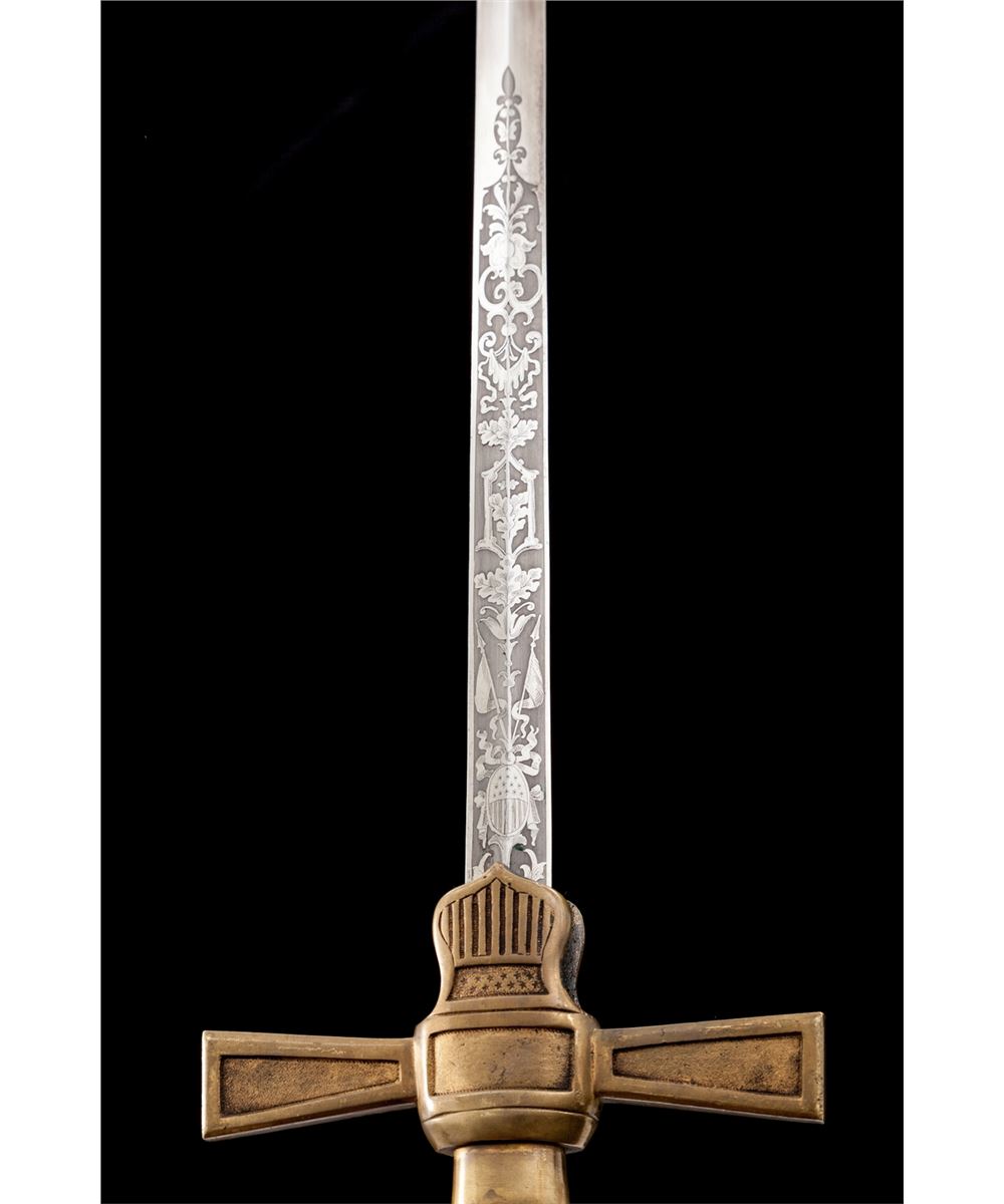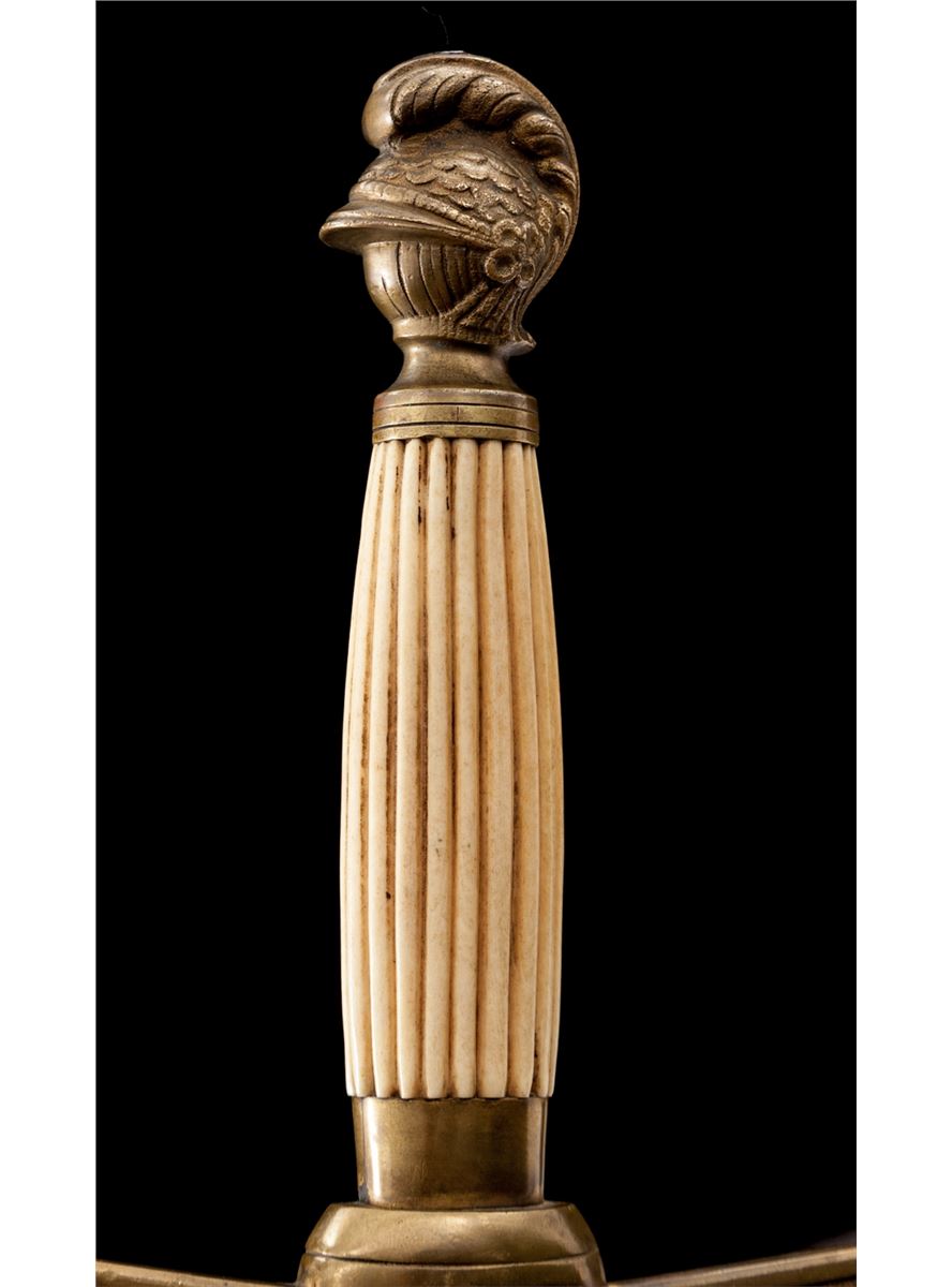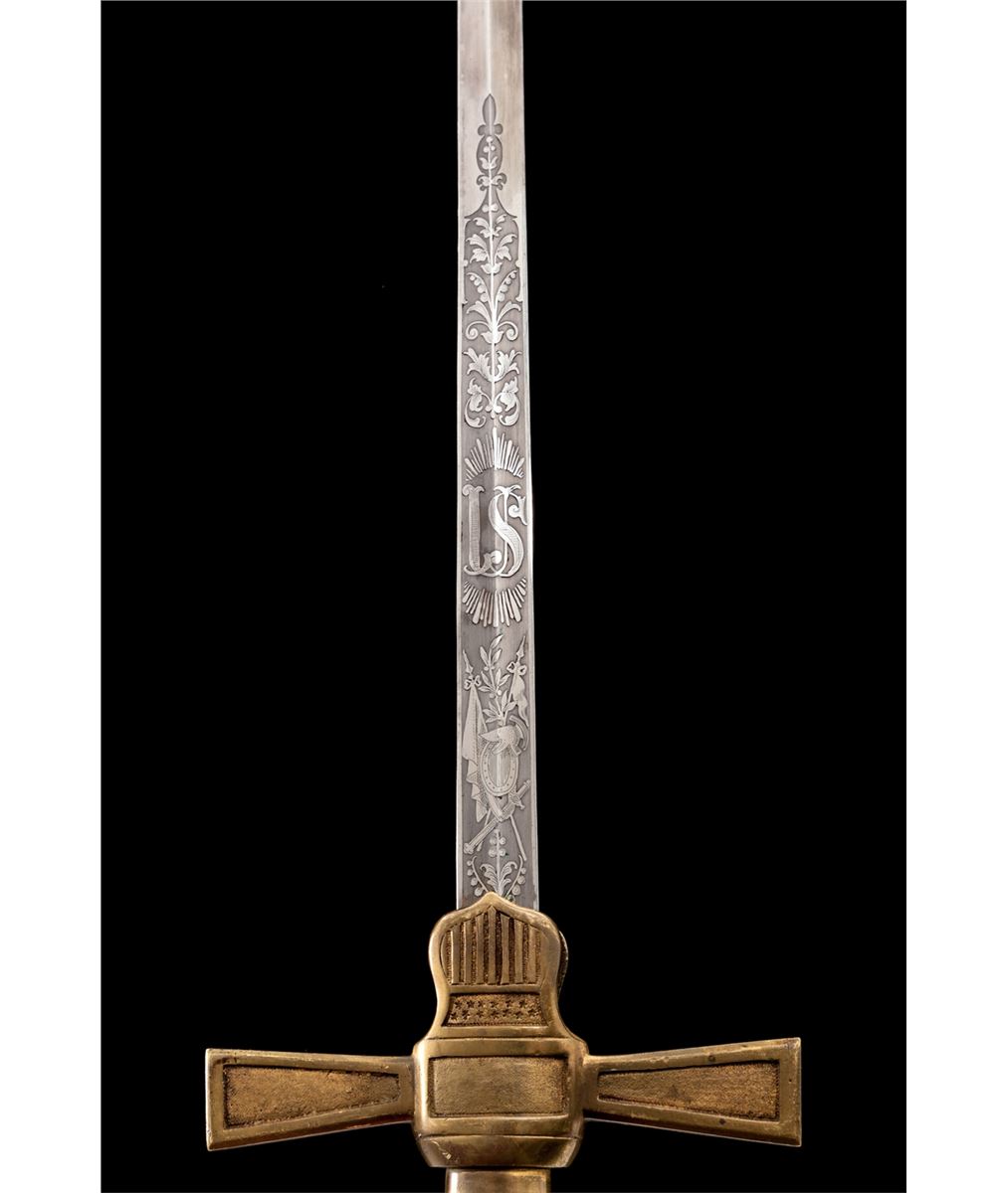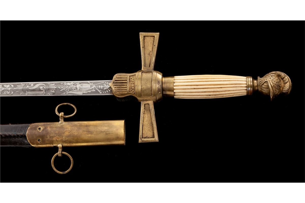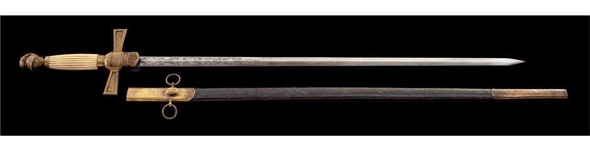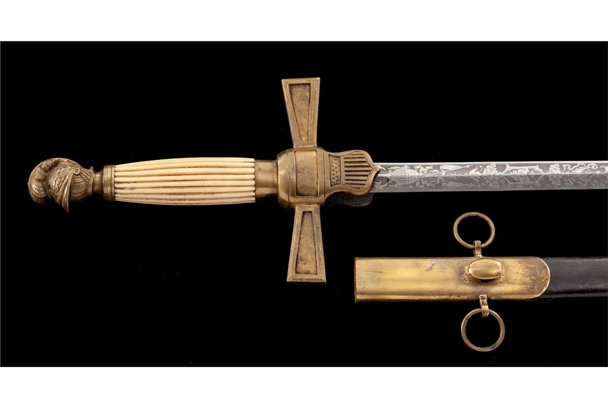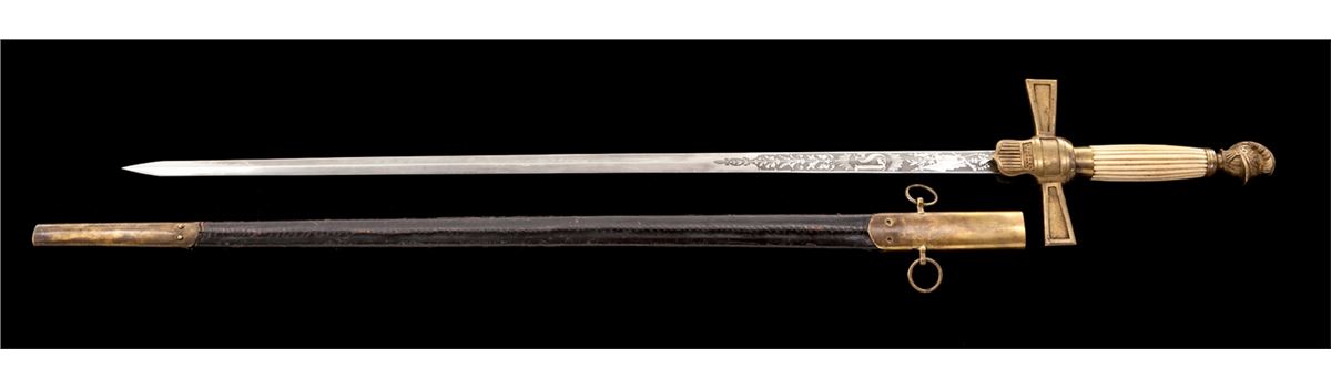 Militia Non-Commissioned Officer's Sword (1850-1870), 25-1/2'' blade with U.S. and patriotic motifs etched to lower third of blade; 32'' overall, horizontally fluted bone grip, brass cast pommel in the form of a stylized helmet facing downward, crossguard with shield-shaped langets bearing U.S. shield with 13 stars and 17 stripes. Black leather scabbard with brass throat and tip. This type sword was purchased by many of the more elite state militia organizations during the middle of the 19th Century. They are often seen in photographs from the early part of the Civil War. Condition is excellent. Blade shows almost no runner marks and surface remains bright and corrosion free. Brass pommel and crossguard with just light patination. Fluted bone grip is intact and shows little wear. Scabbard is mostly excellent with impressions and scuffs. Rivets securing throat portion have gone missing and brass throat is somewhat loose. Est.: $800-$1,200.