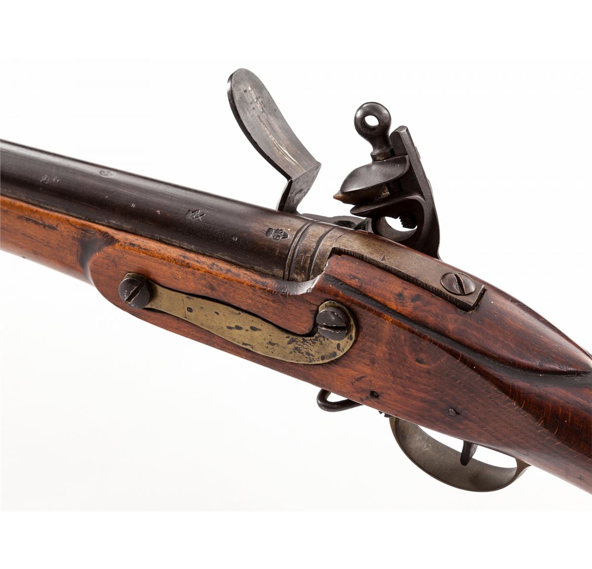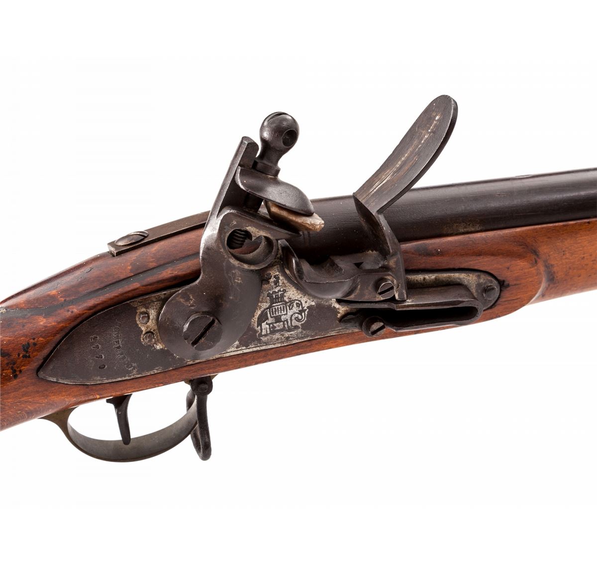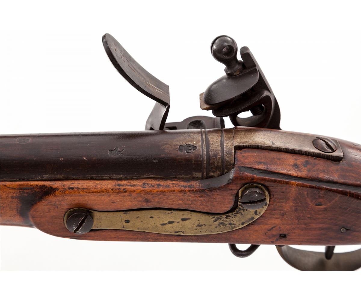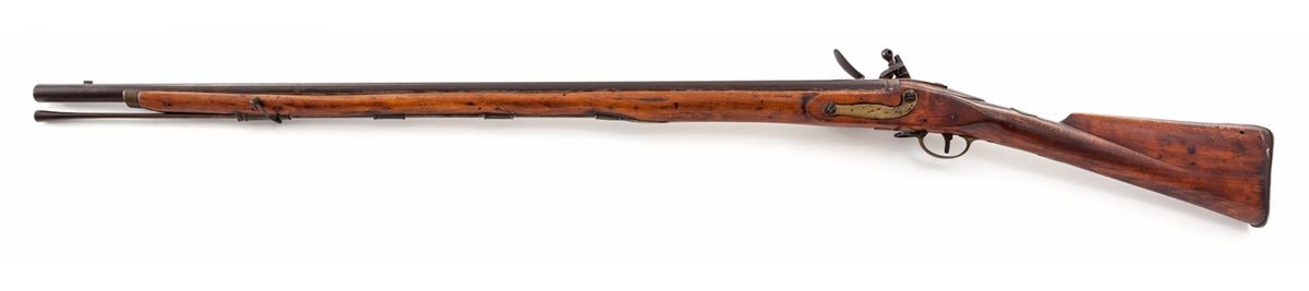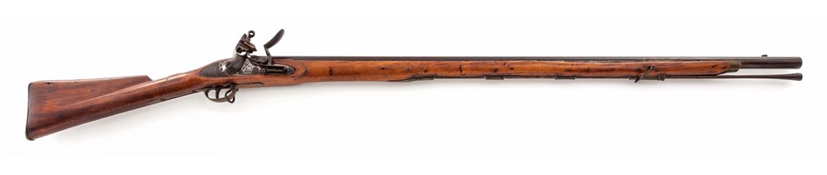 Belgian mfg'd Flintlock Rifle, lock marked ''Tower Proof 1770'', center of lockplate between hammer and frizzen with Howa type elephant motif; top of barrel with Liege proofmarks and ''(crown)/GR'' proofmarks as well; .76 cal., 39-1/2'' barrel, beech Brown Bess style stock, with ramrod. Condition is very good. Barrel has toned brown. Stock with some oil darkening and minor fractures near forward sling swivel eyelet. Action is good. Est.: $500-$750. (Antique)